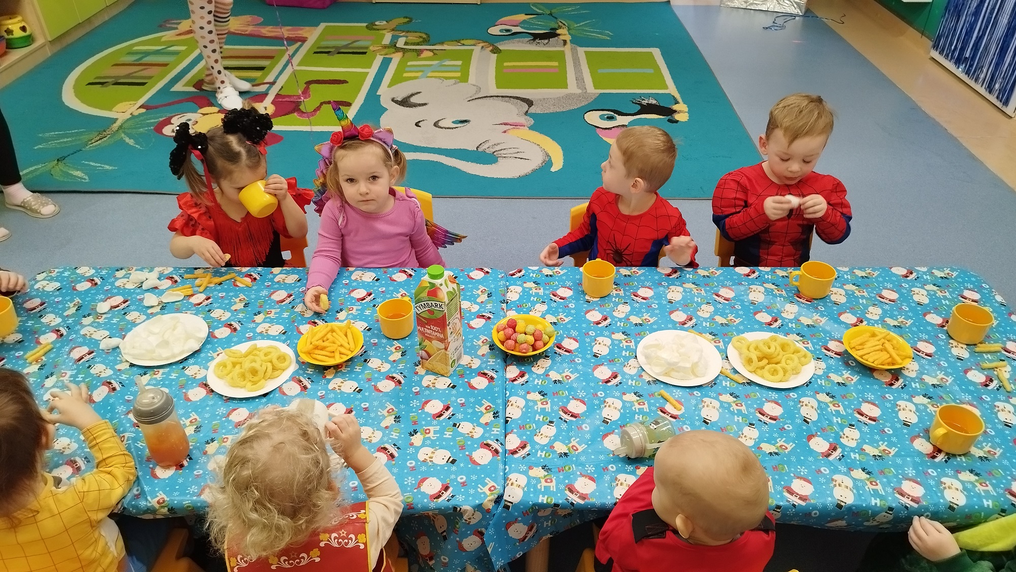 Dla odpoczynku maluchy posiliły się pysznymi przekąskami przygotowanymi przez opiekunki, a następnie ruszyły do dalszej zabawy z balonami i lametą.