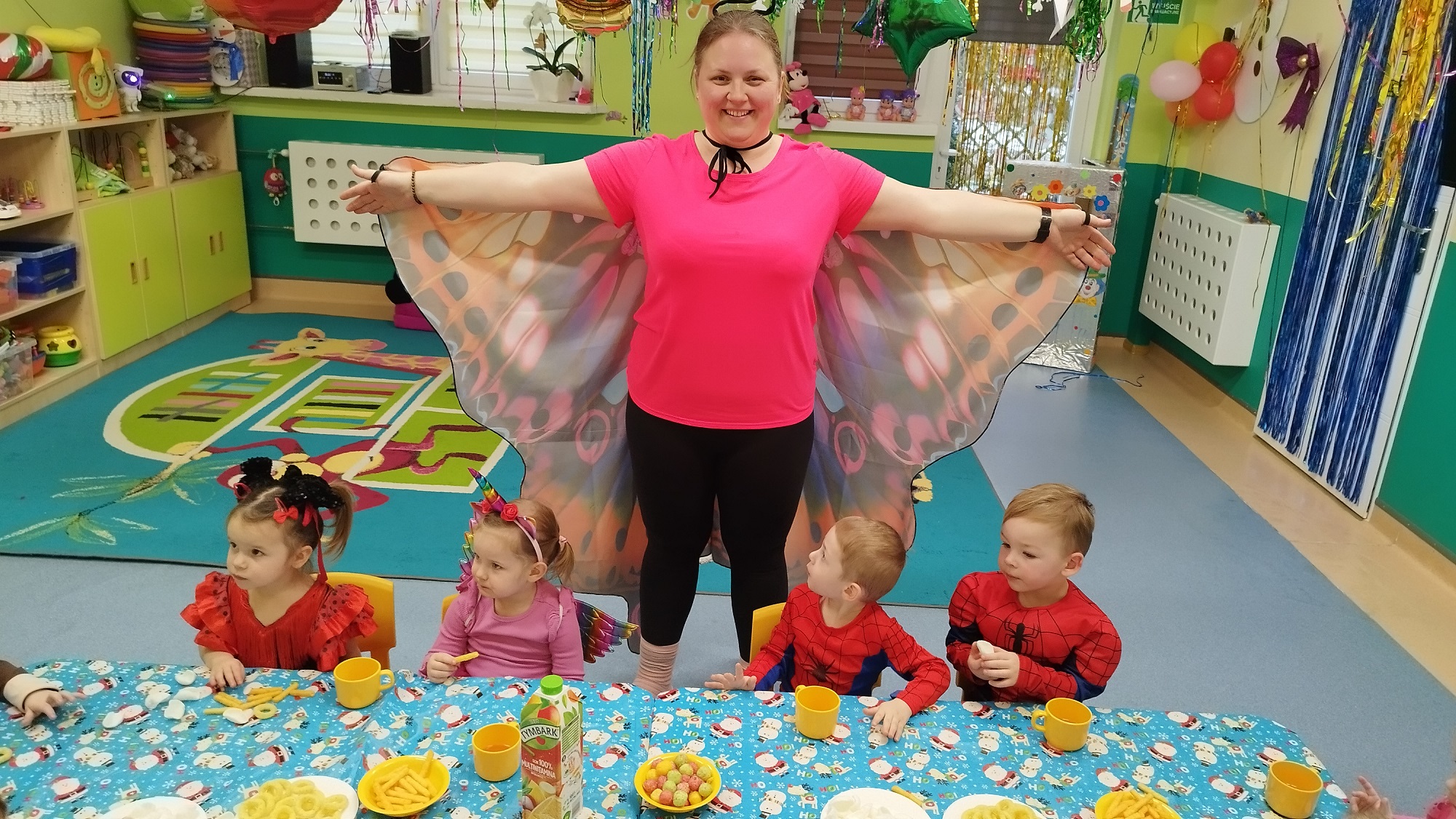 Pięknie wystrojona sala , pyszny poczęstunek, wesoła muzyka, kolorowe tatuaże- wszystko to czekało dziś na maluchy.
