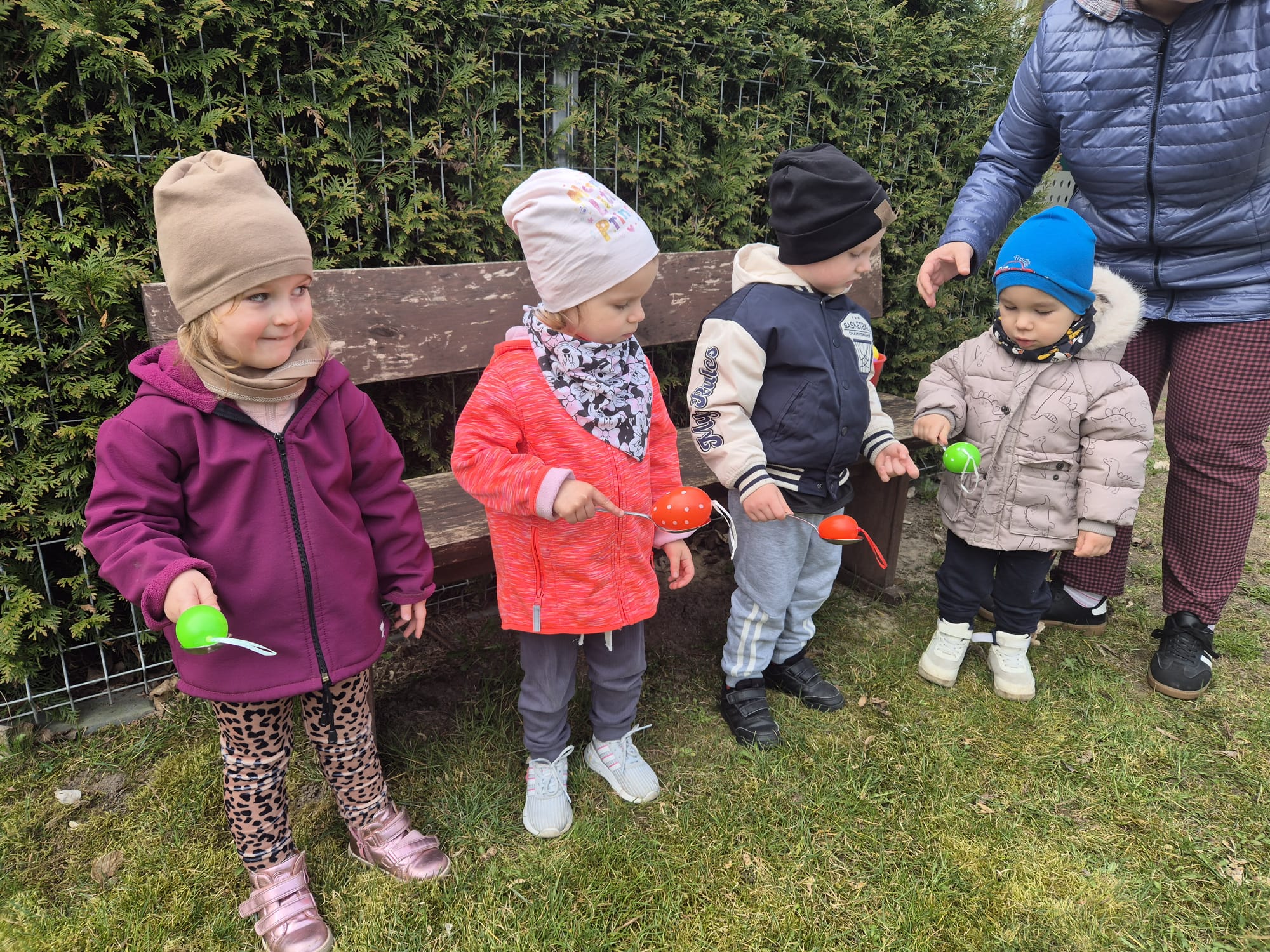 Następnie każde z dzieci dostało łyżkę, na której przenosiło jajko do piaskownicy, starając się go nie zgubić. Jajka nie raz lądowały na trawie, ale był to świetny trening skupienia i równowagi.