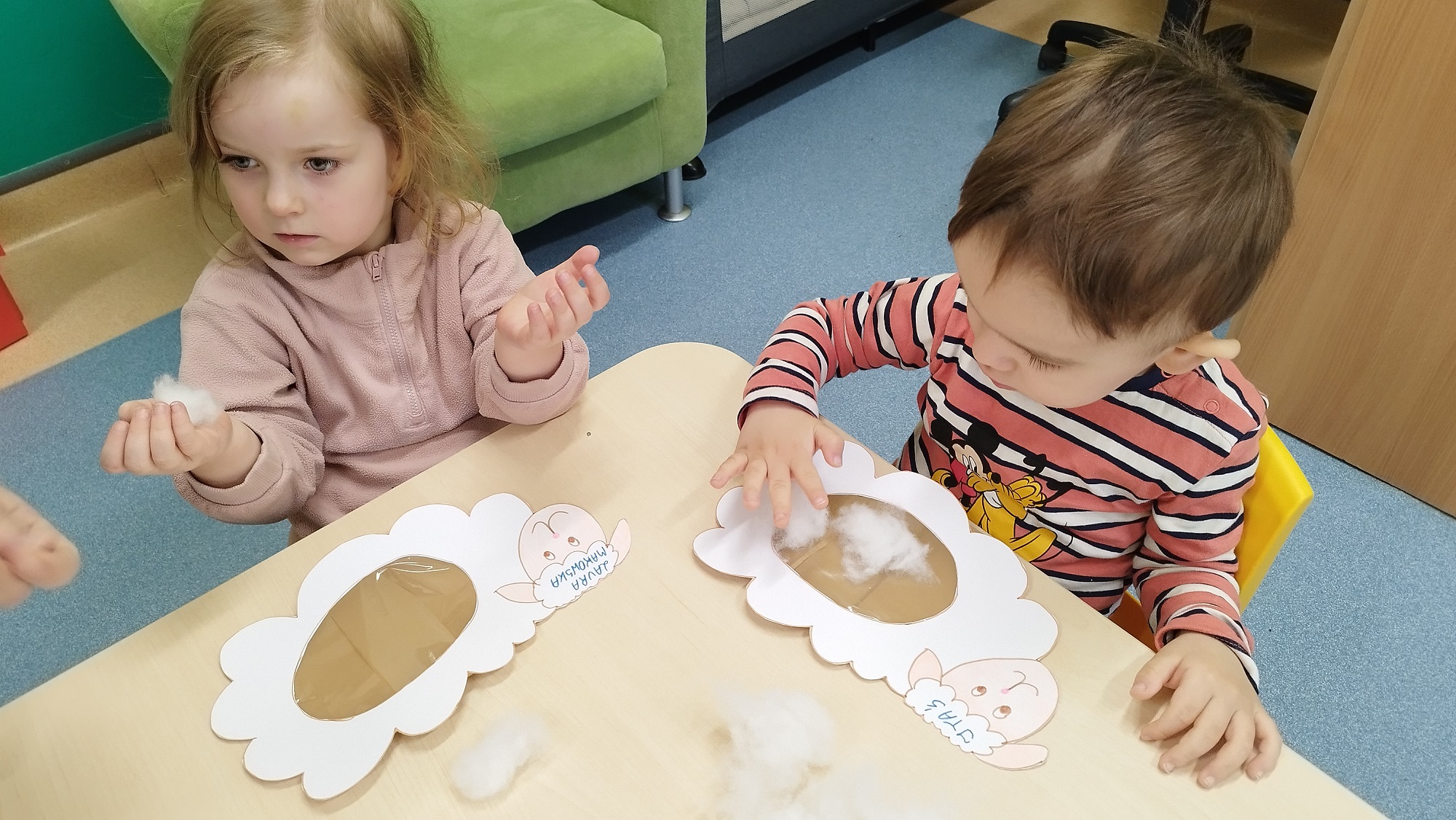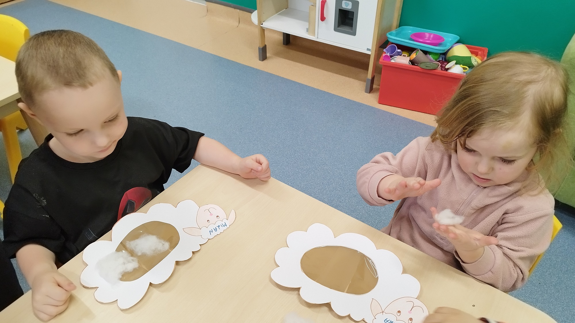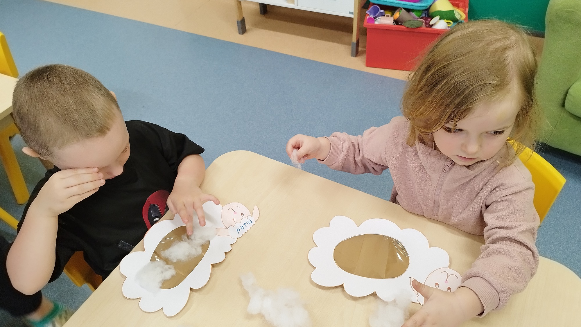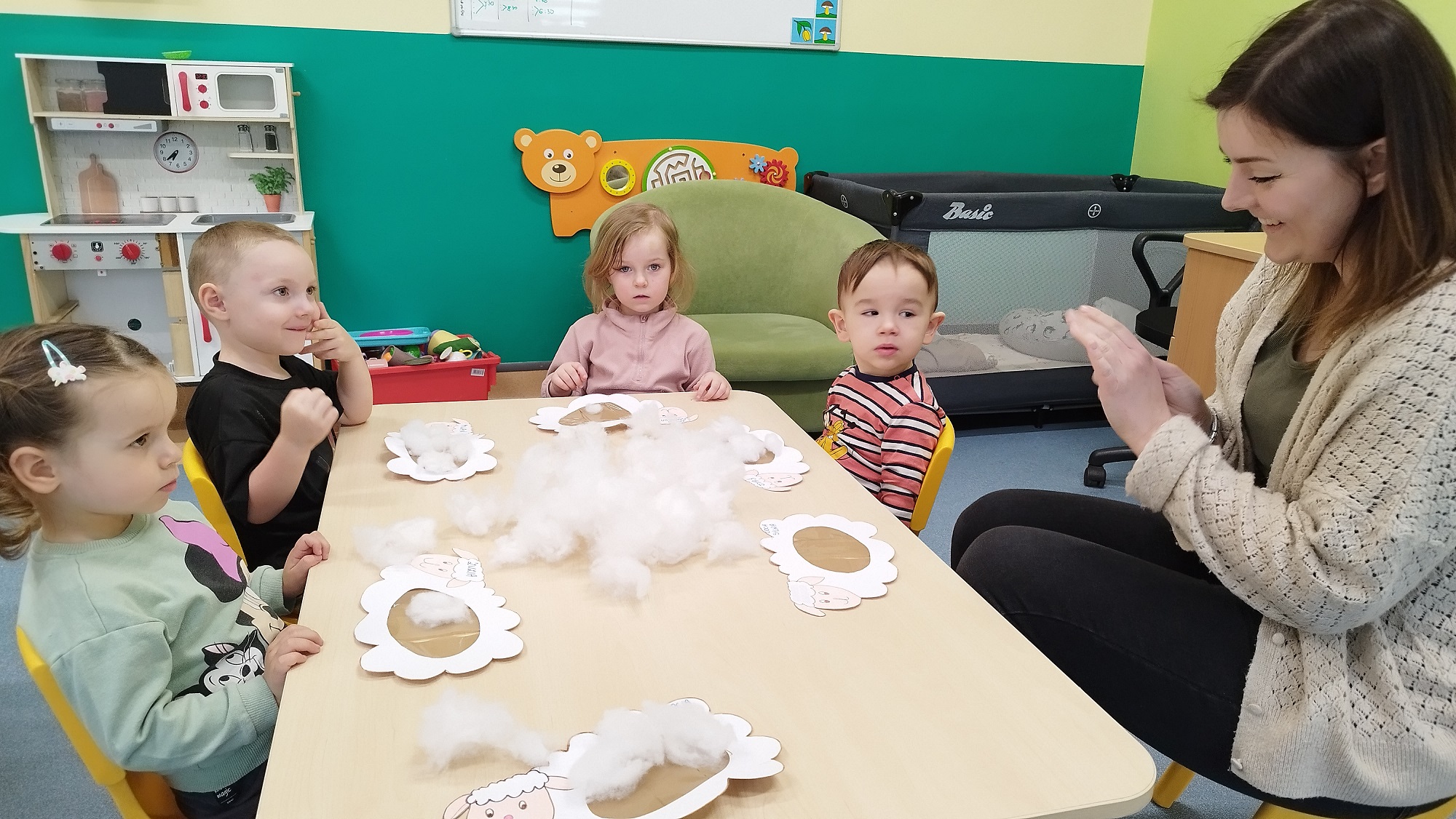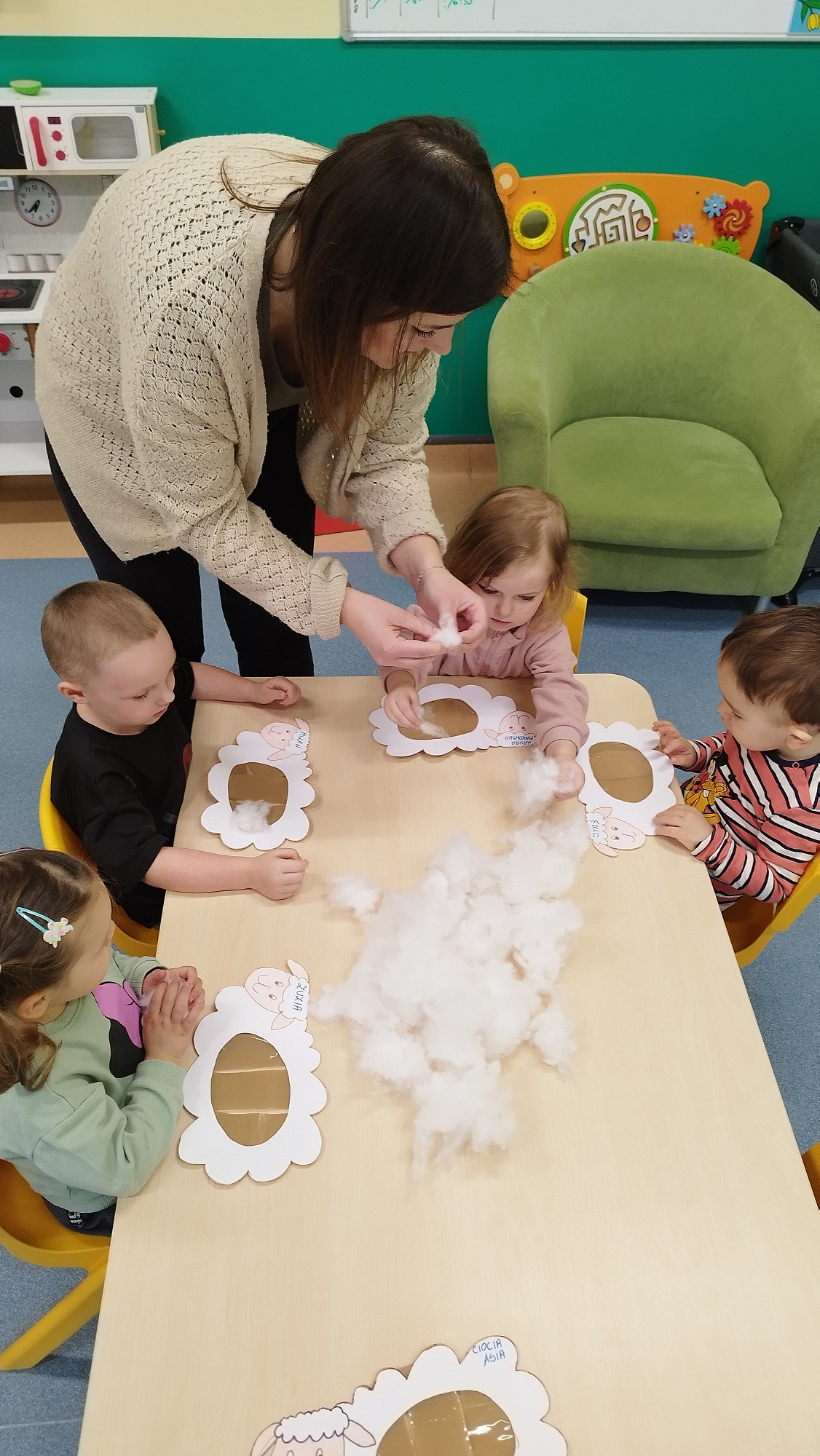 Dzieci wyklejały z mięciutkiej waty białe baranki, które zawisły na żłobkowej tablicy obok pisanek.