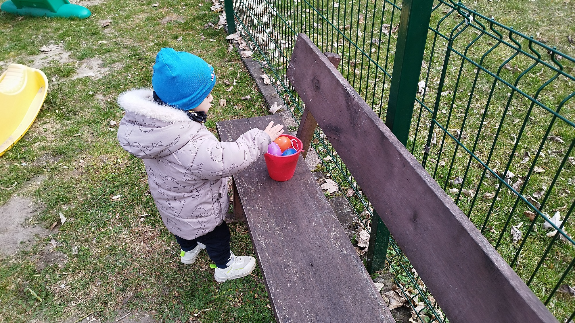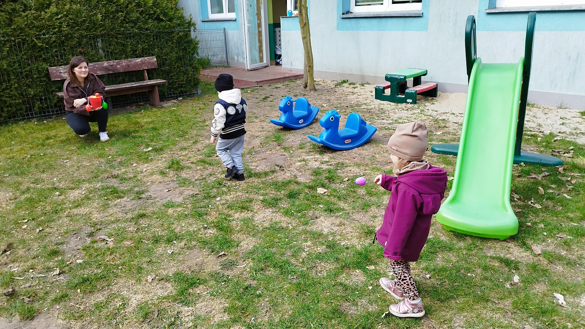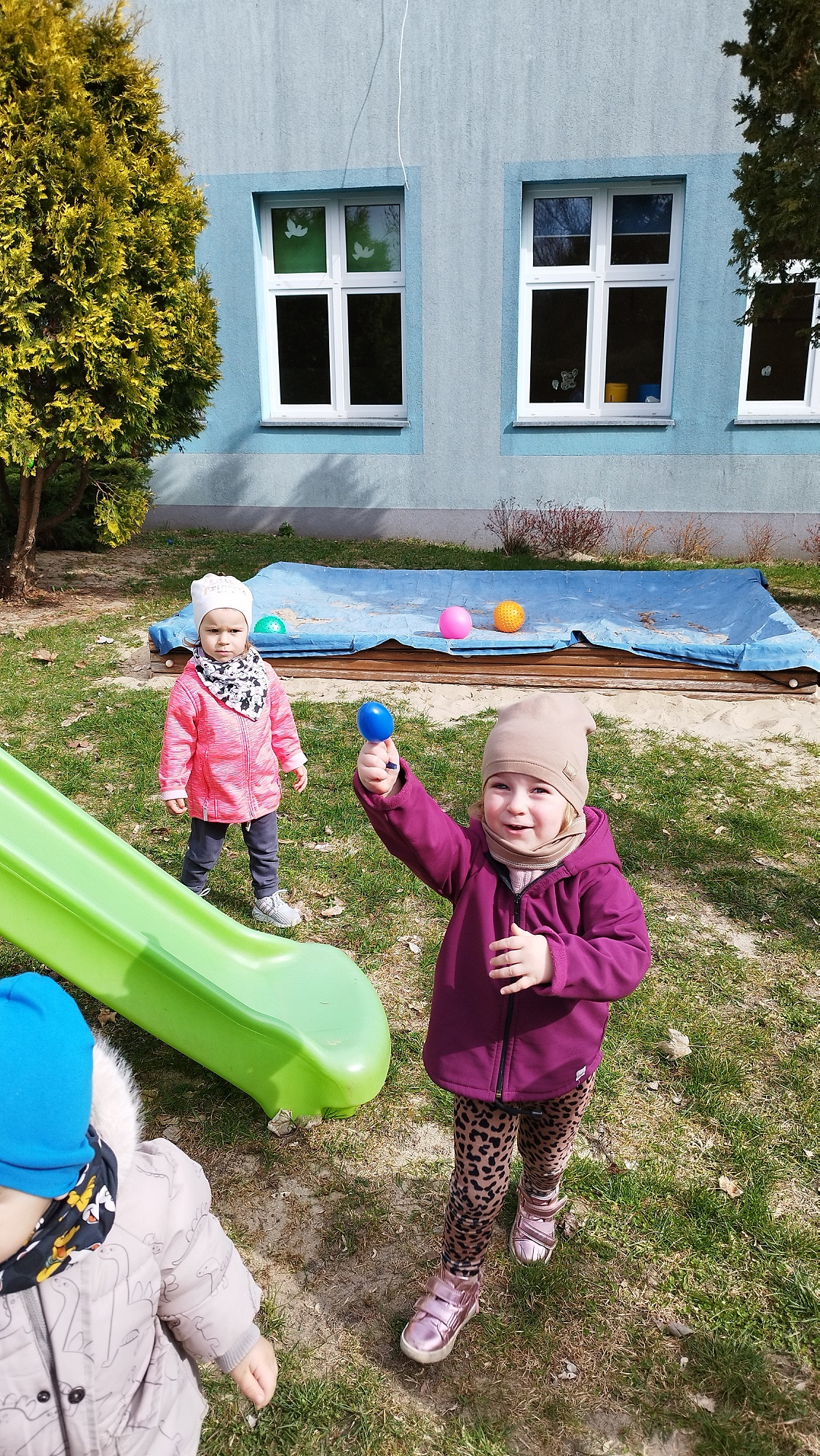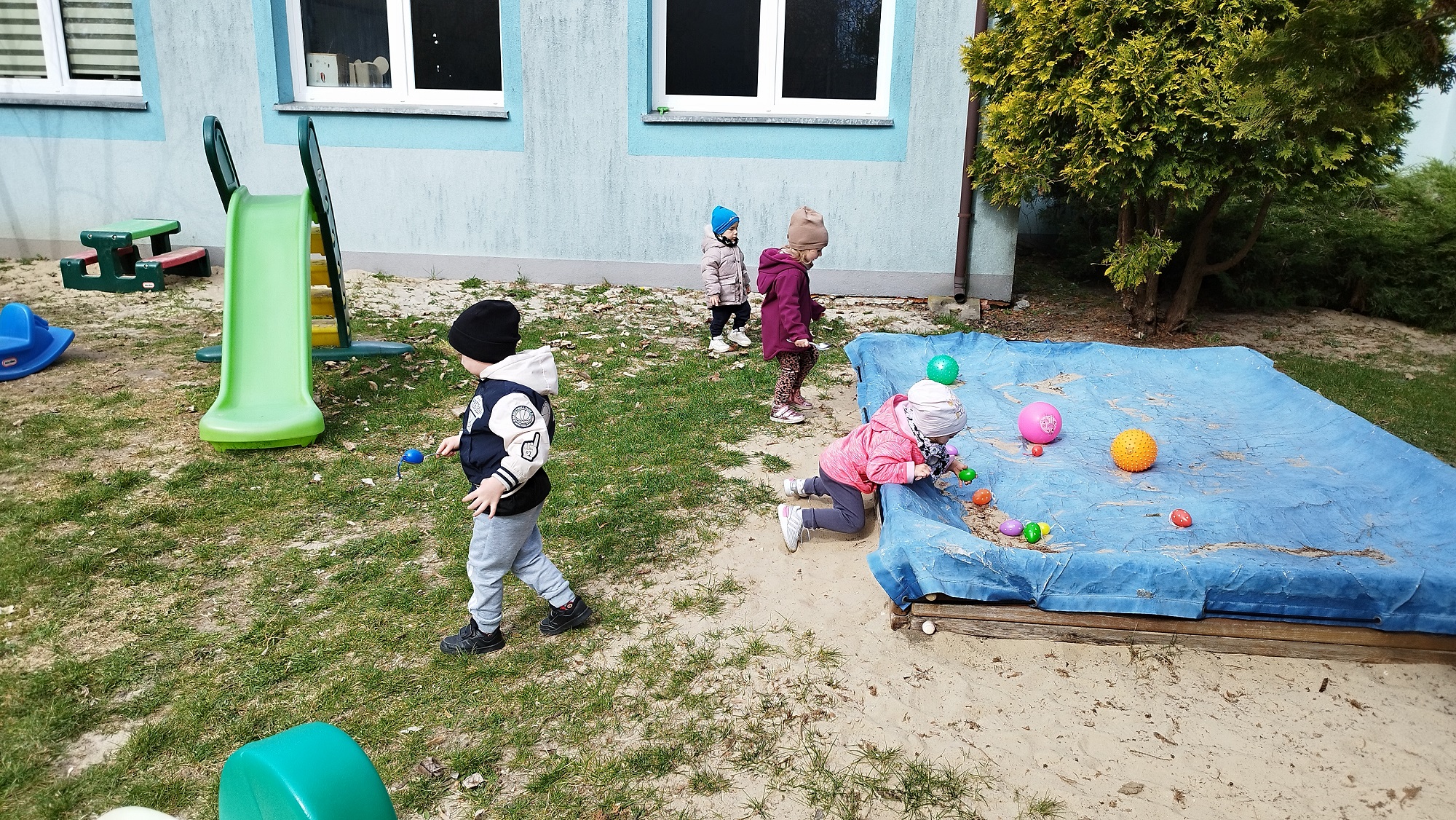 Na żłobkowym placu zabaw czekało na maluchy zadanie . Wszyscy szukali ukrytych kolorowych jajek. Pisanki zostały szybko odnalezione.