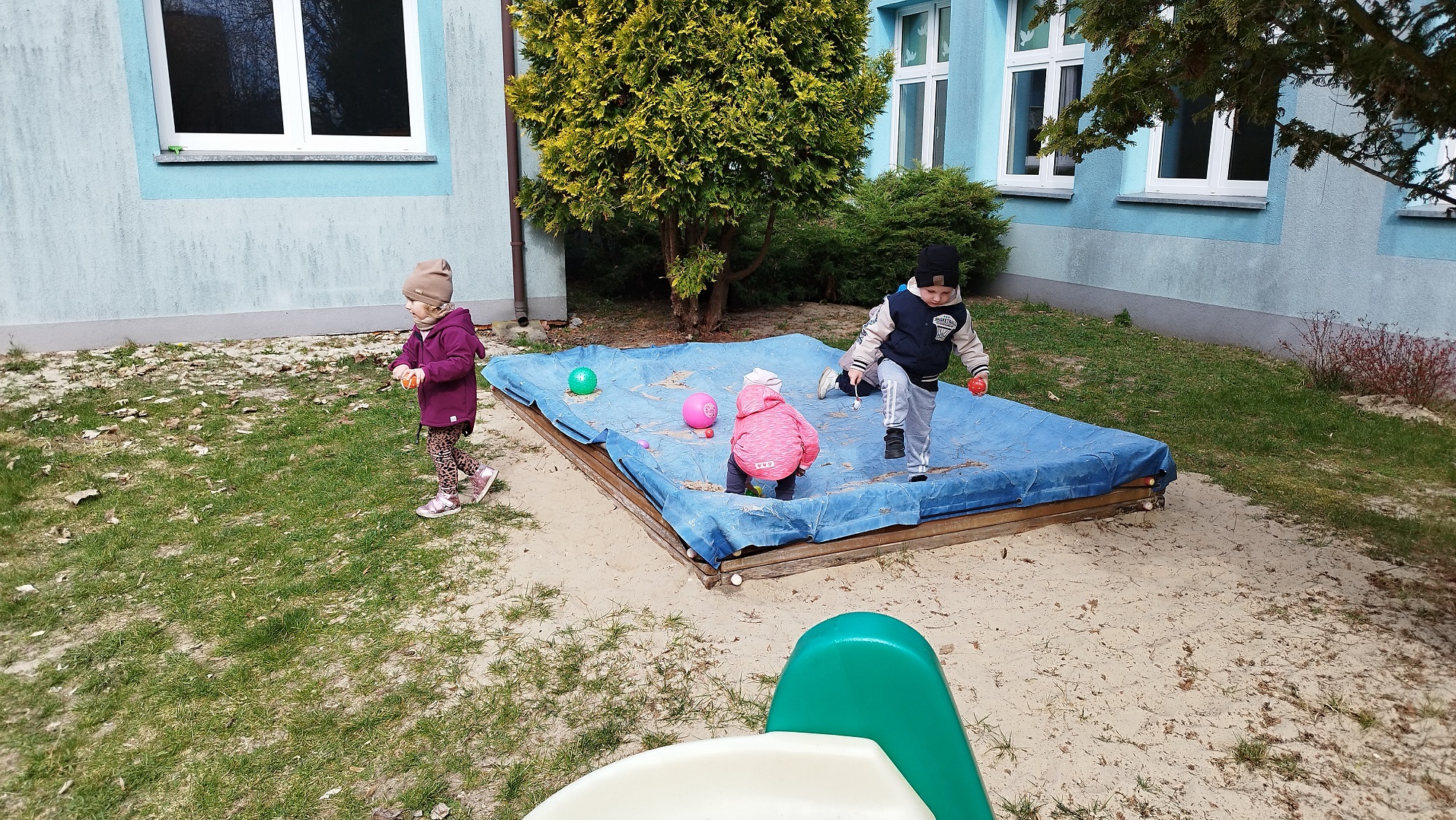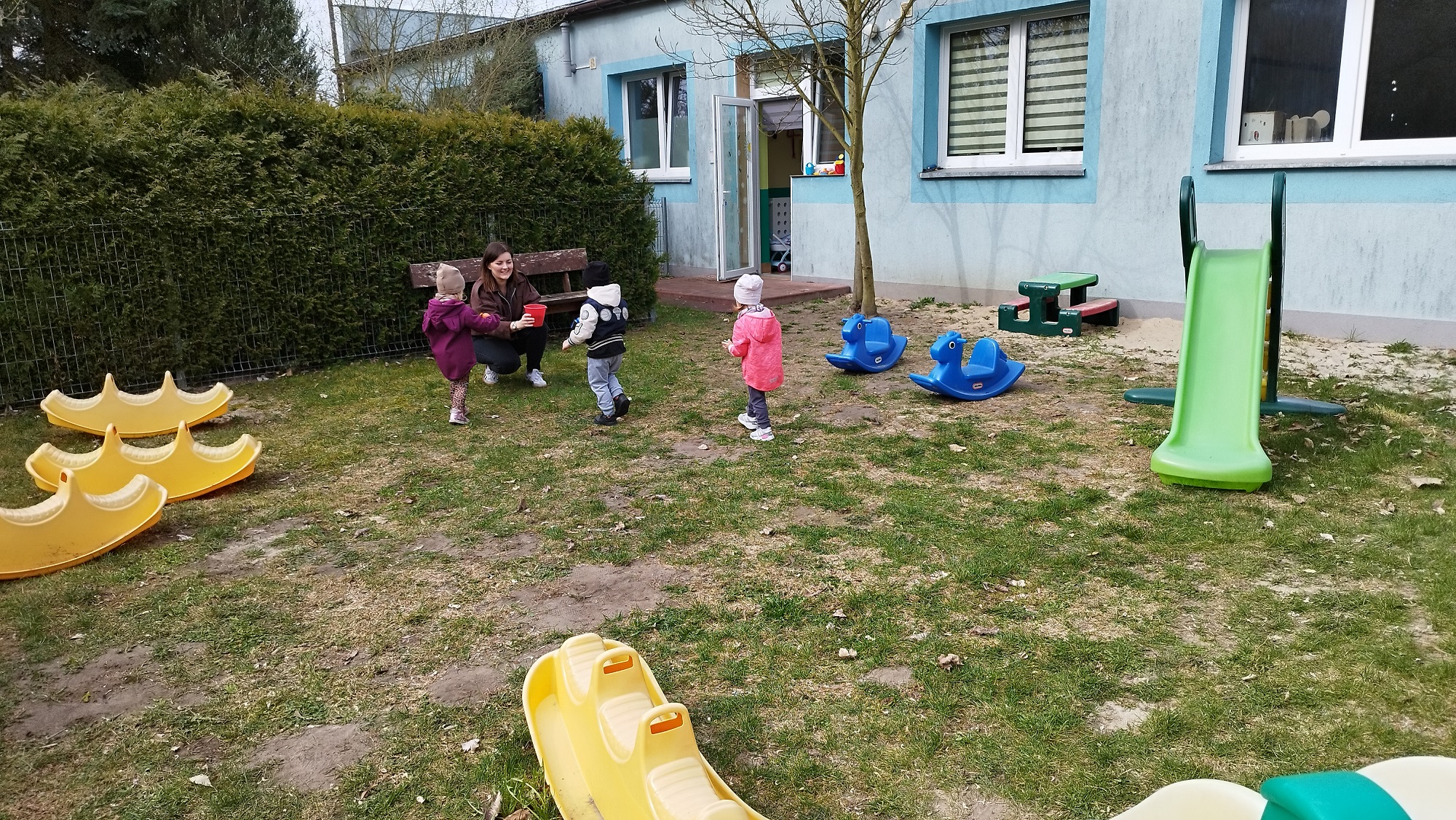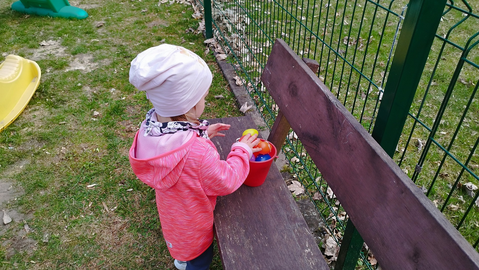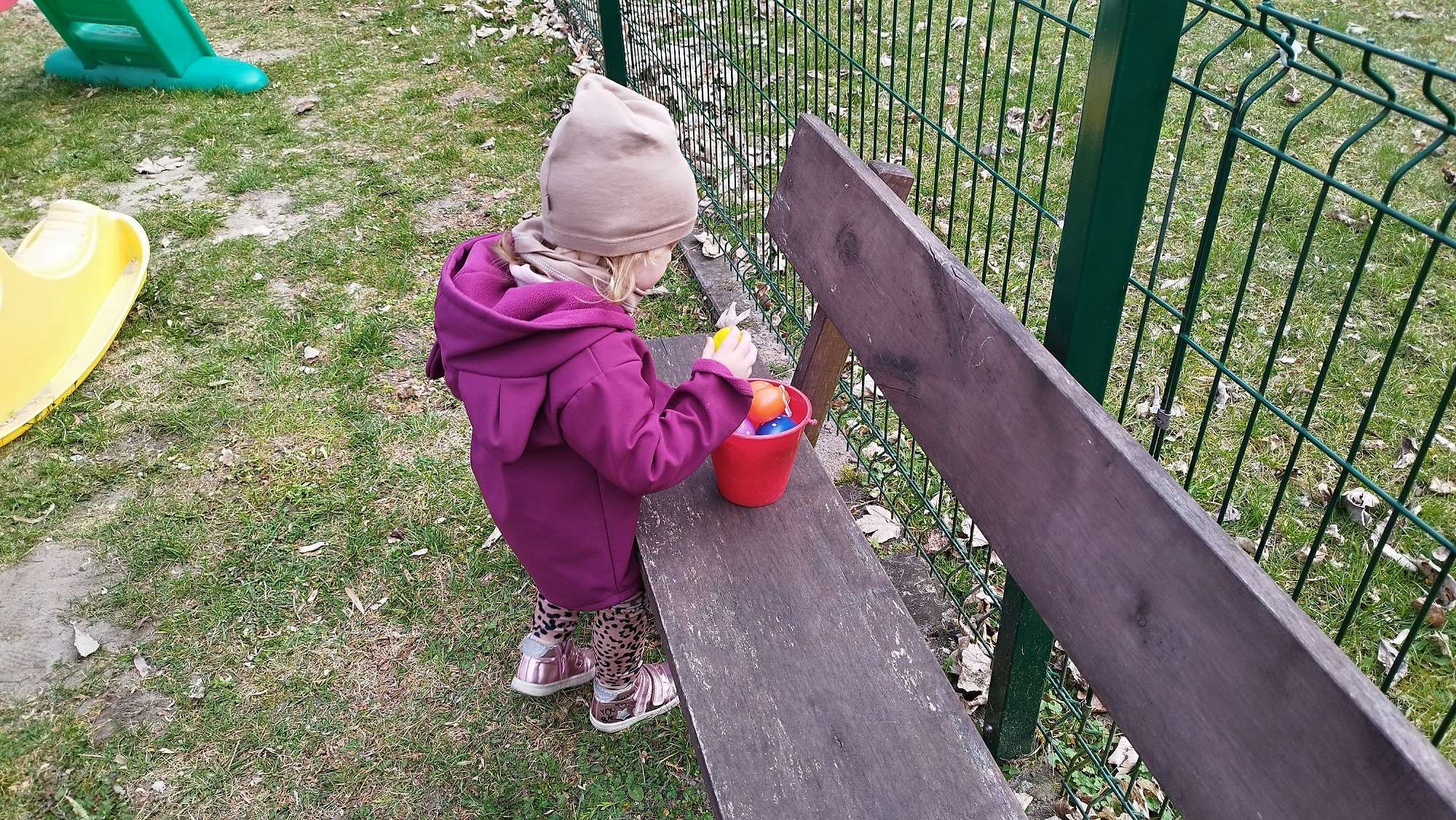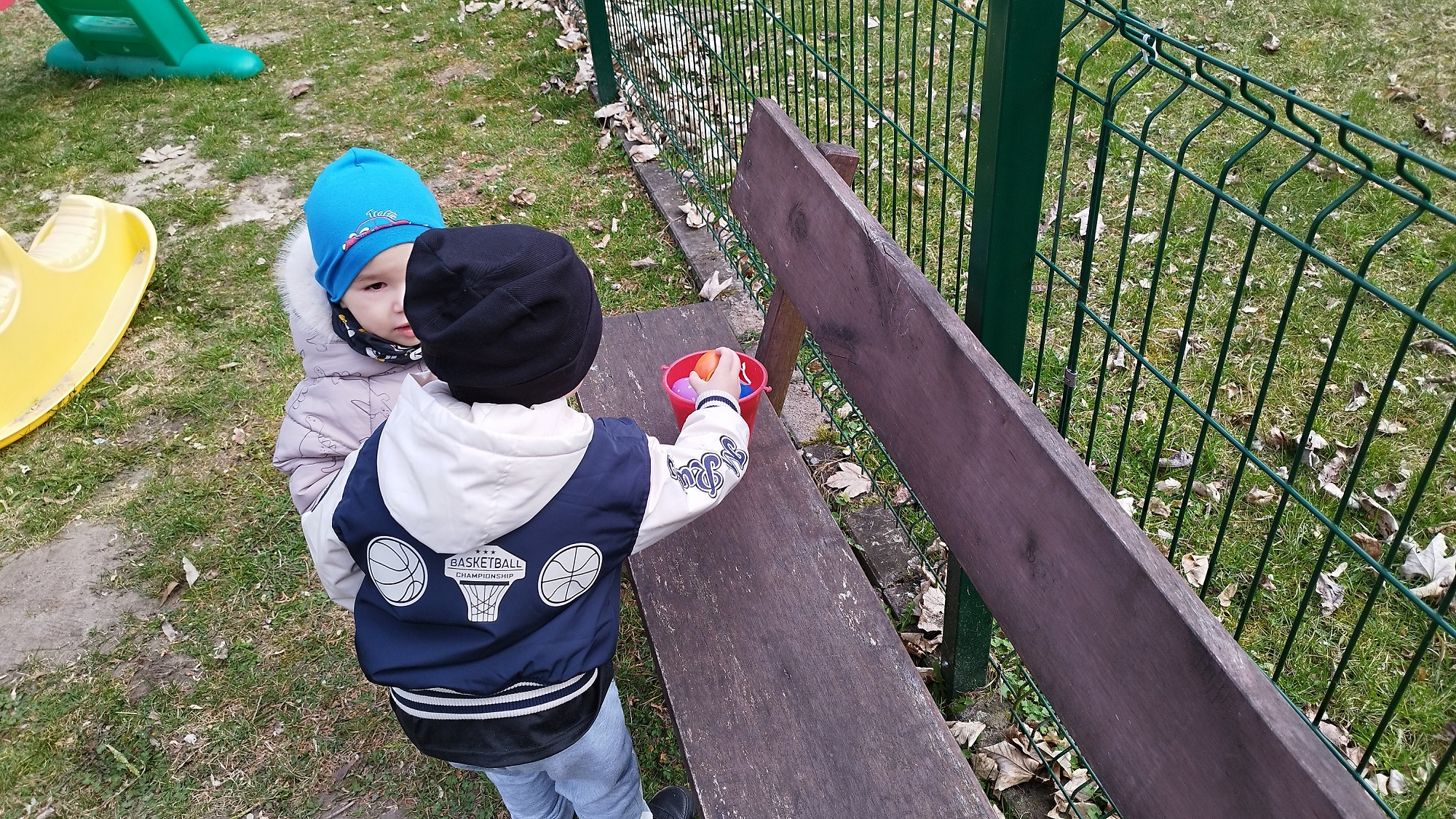 Na żłobkowym placu zabaw czekało na maluchy zadanie . Wszyscy szukali ukrytych kolorowych jajek. Pisanki zostały szybko odnalezione.