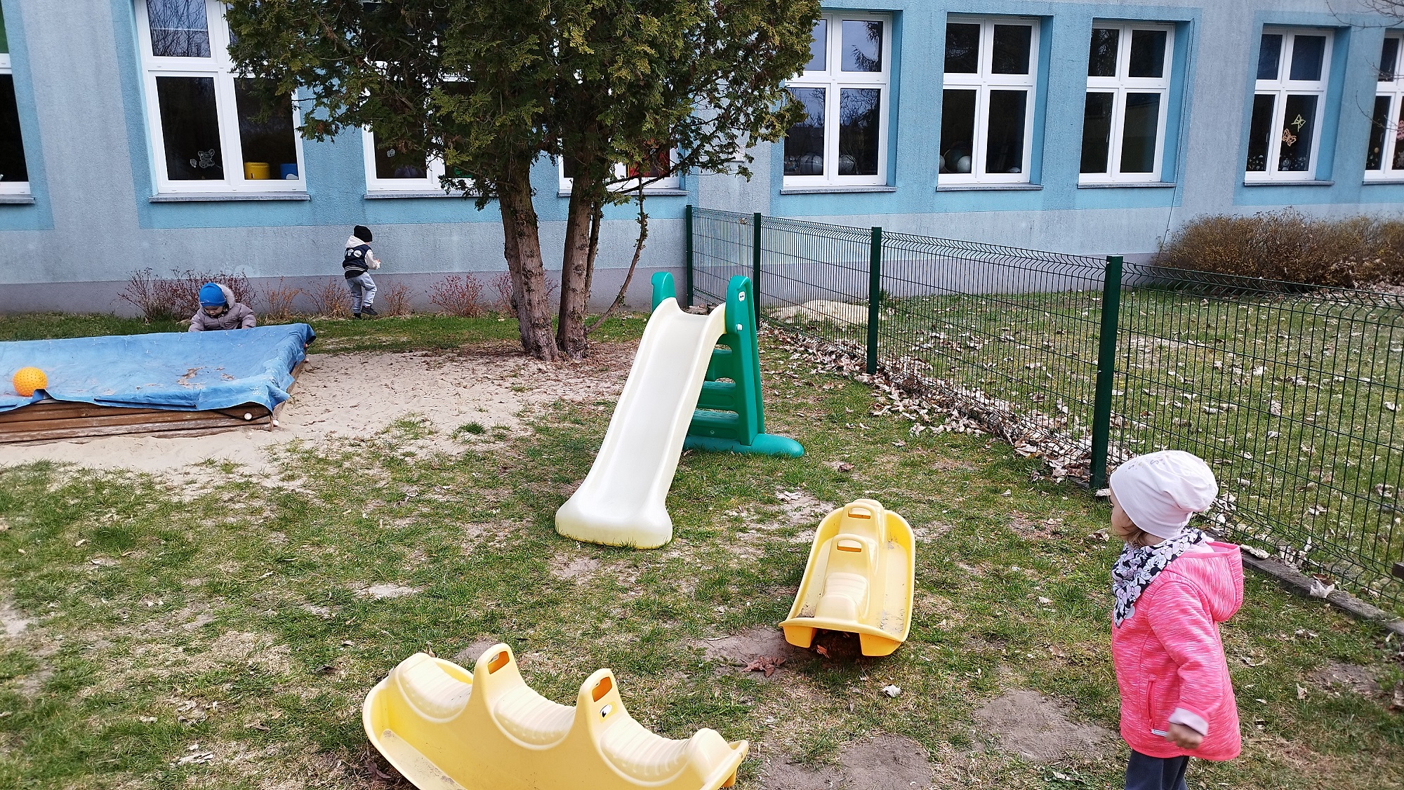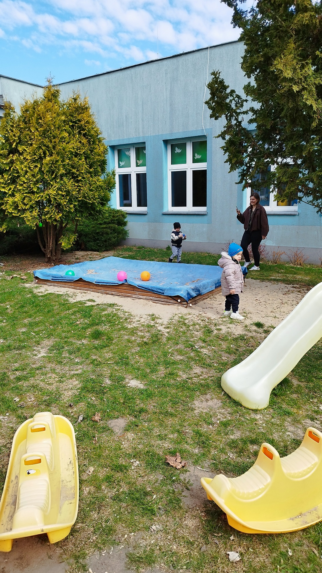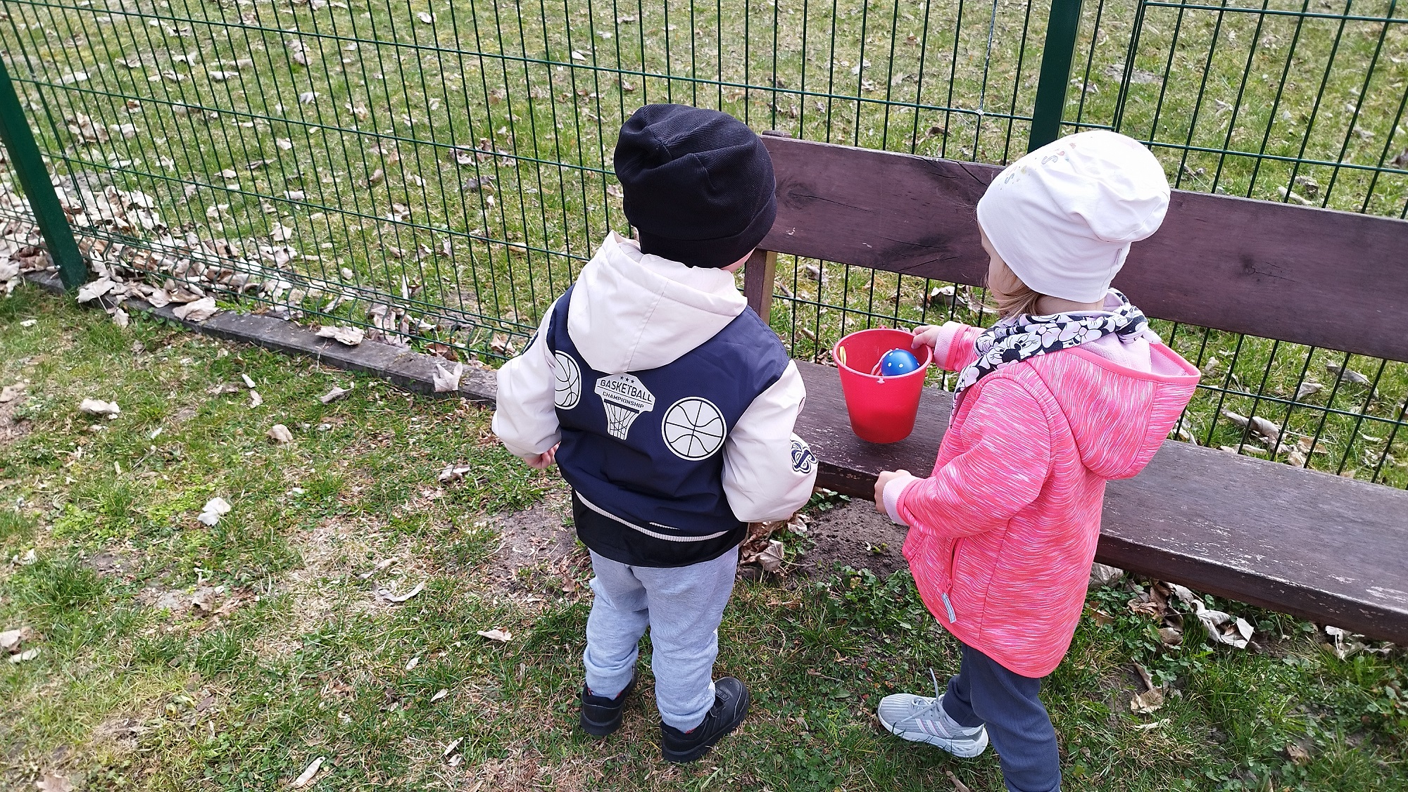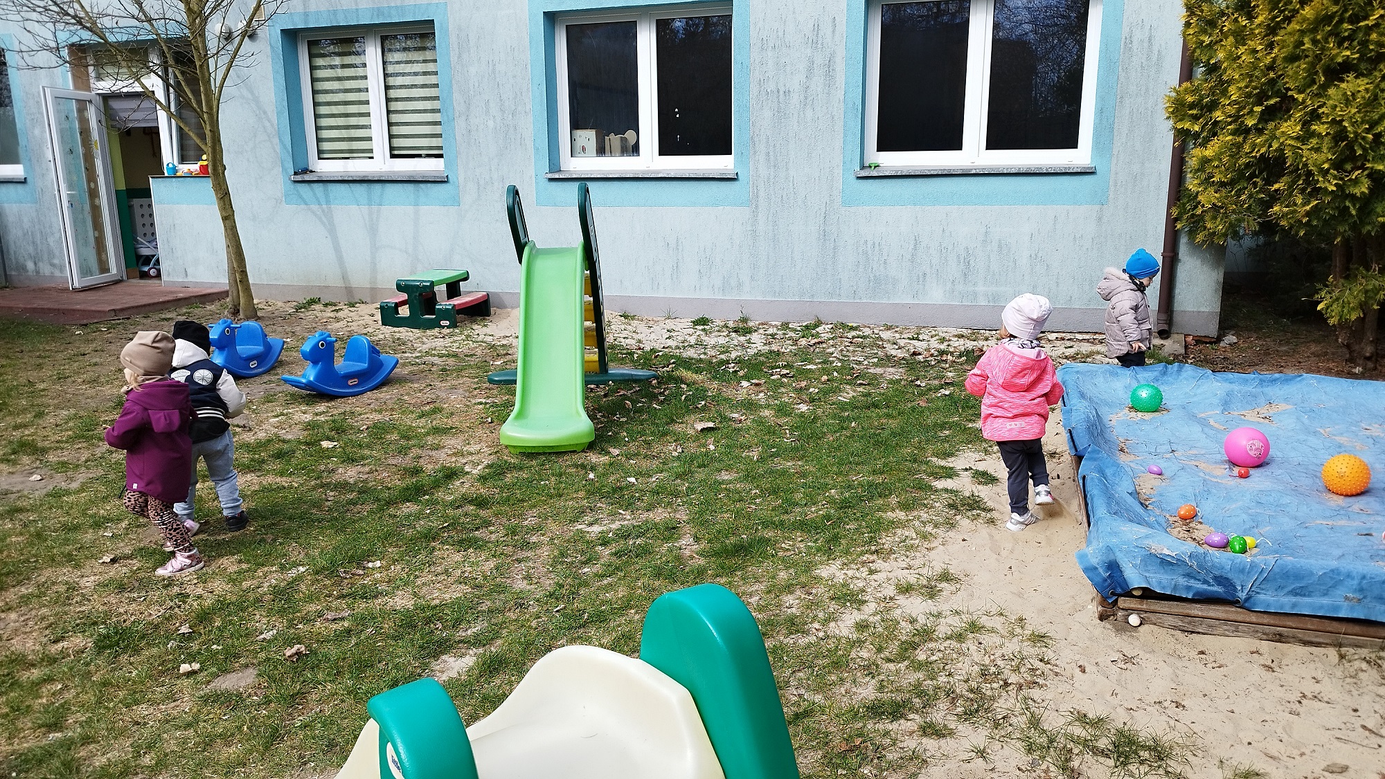Na żłobkowym placu zabaw czekało na maluchy zadanie . Wszyscy szukali ukrytych kolorowych jajek. Pisanki zostały szybko odnalezione.