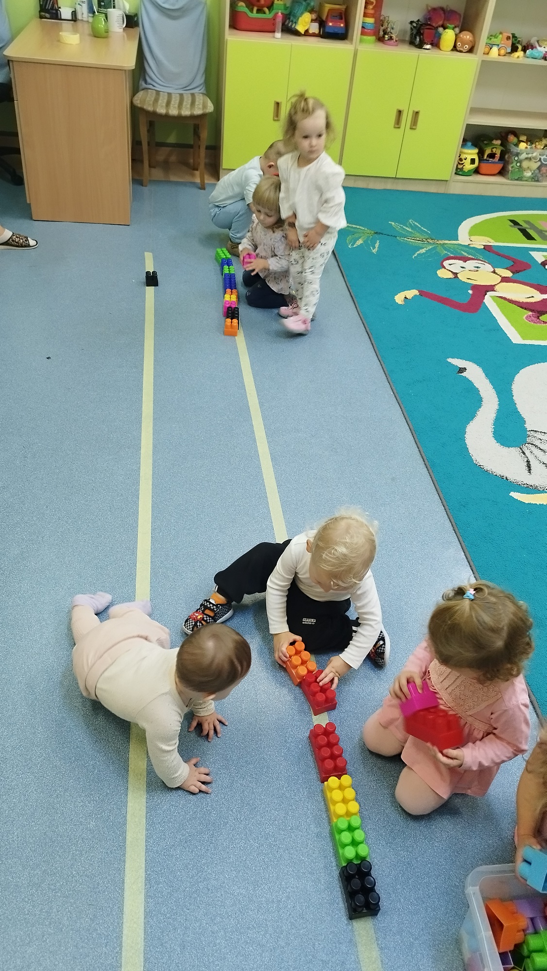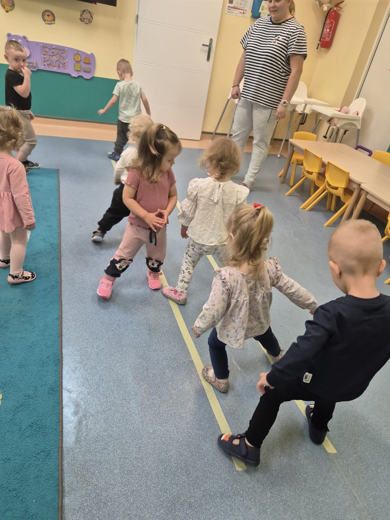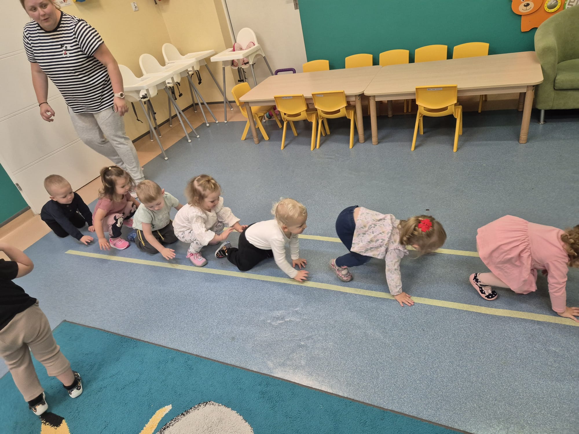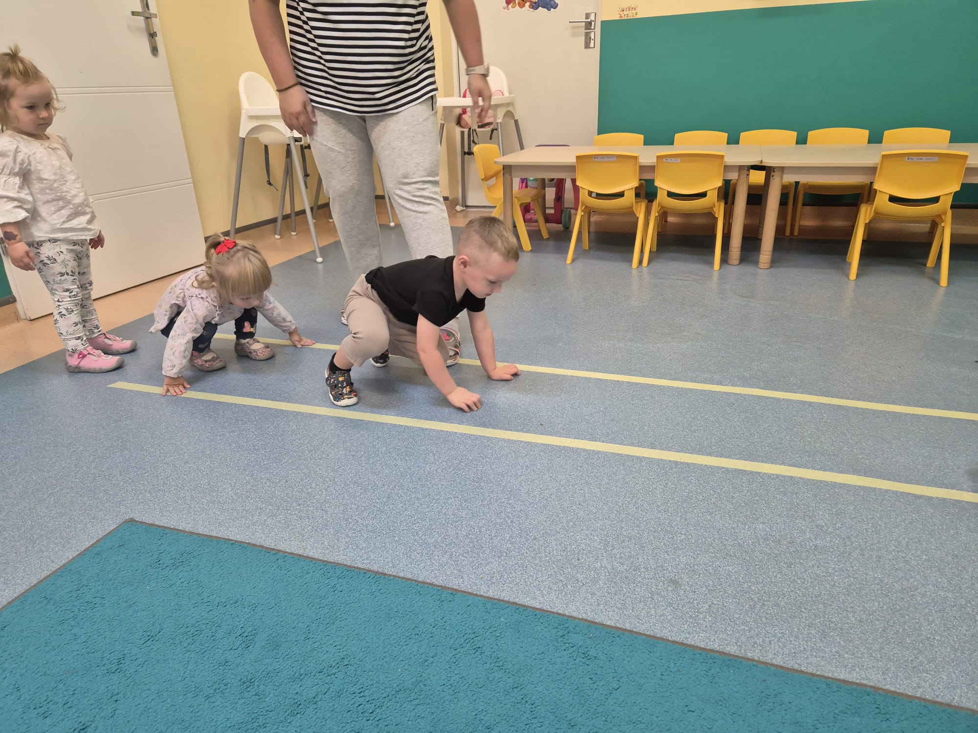Kiedy na podłodze pojawiła się druga linia z taśmy dzieci chodziły okrakiem po taśmie oraz środkiem tak , by jej nie nadepnąć, a także czworakowały po i między taśmami.