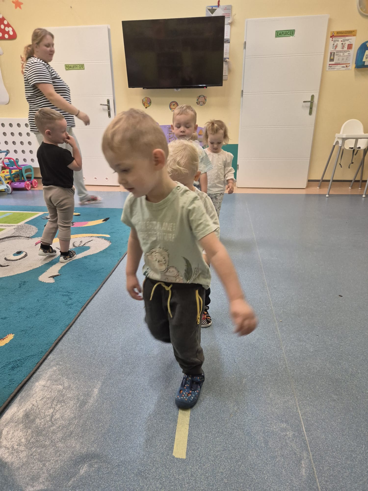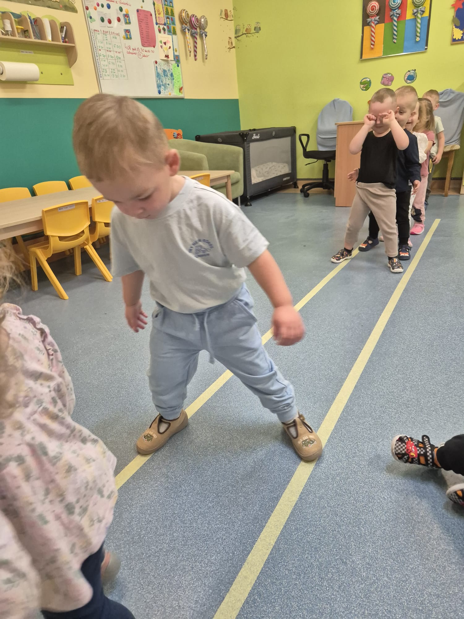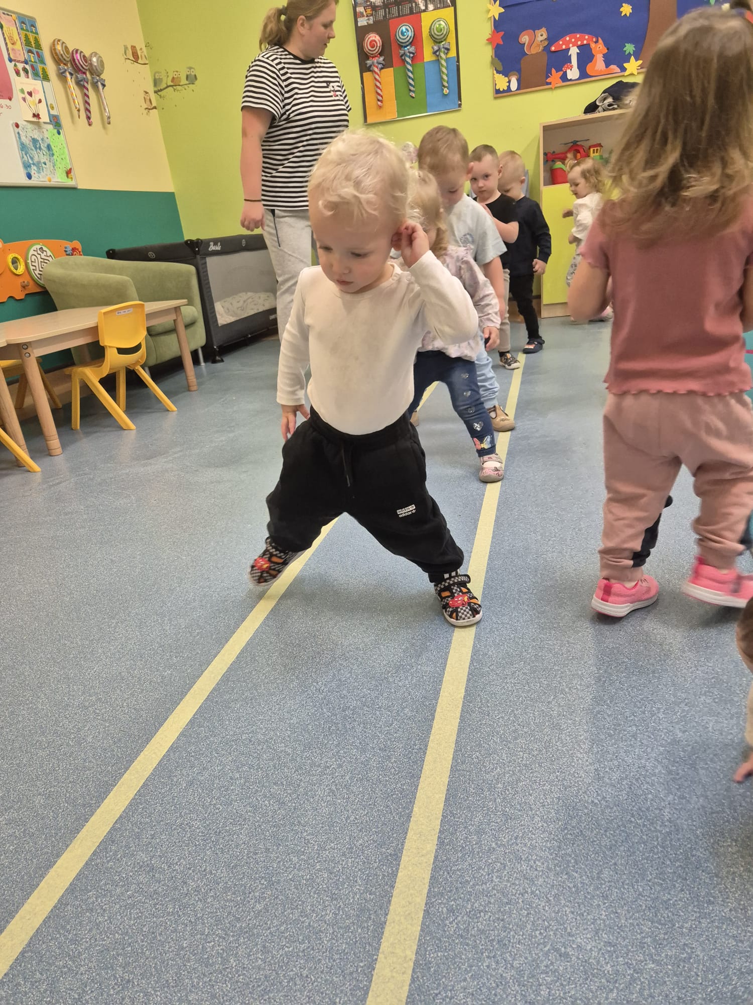 Na wesoło ćwiczyliśmy dziś równowagę oraz ogólną koordynację ruchową .