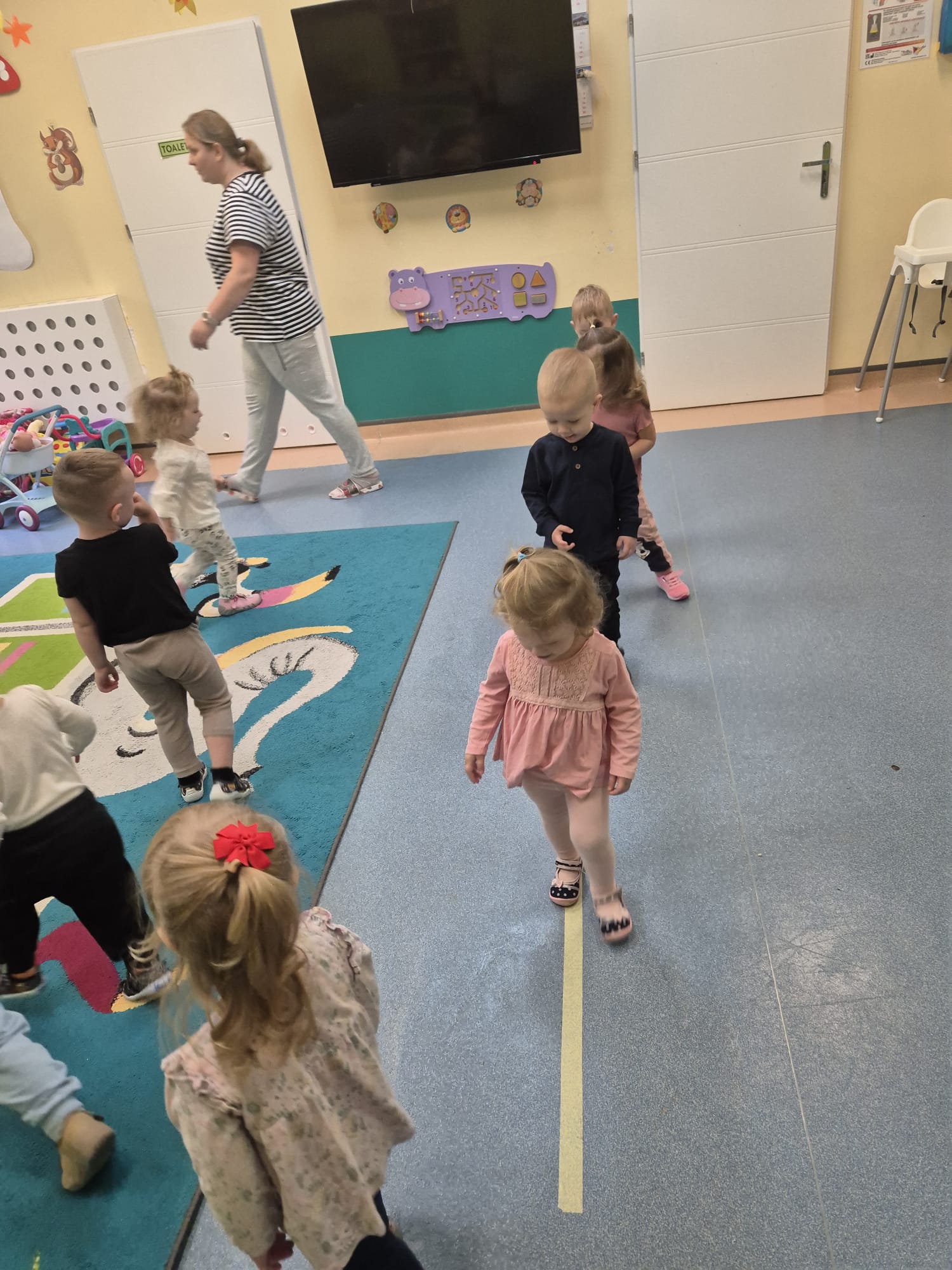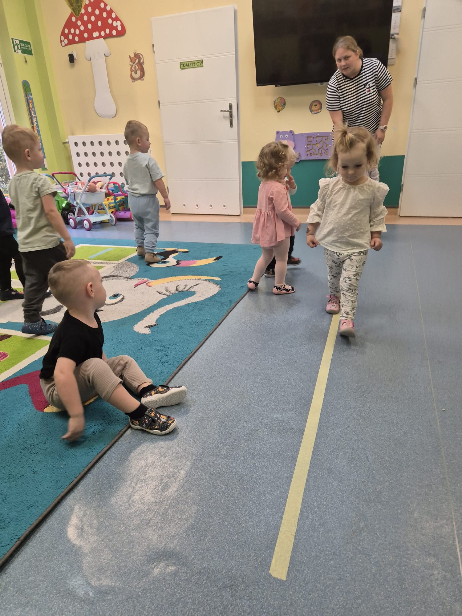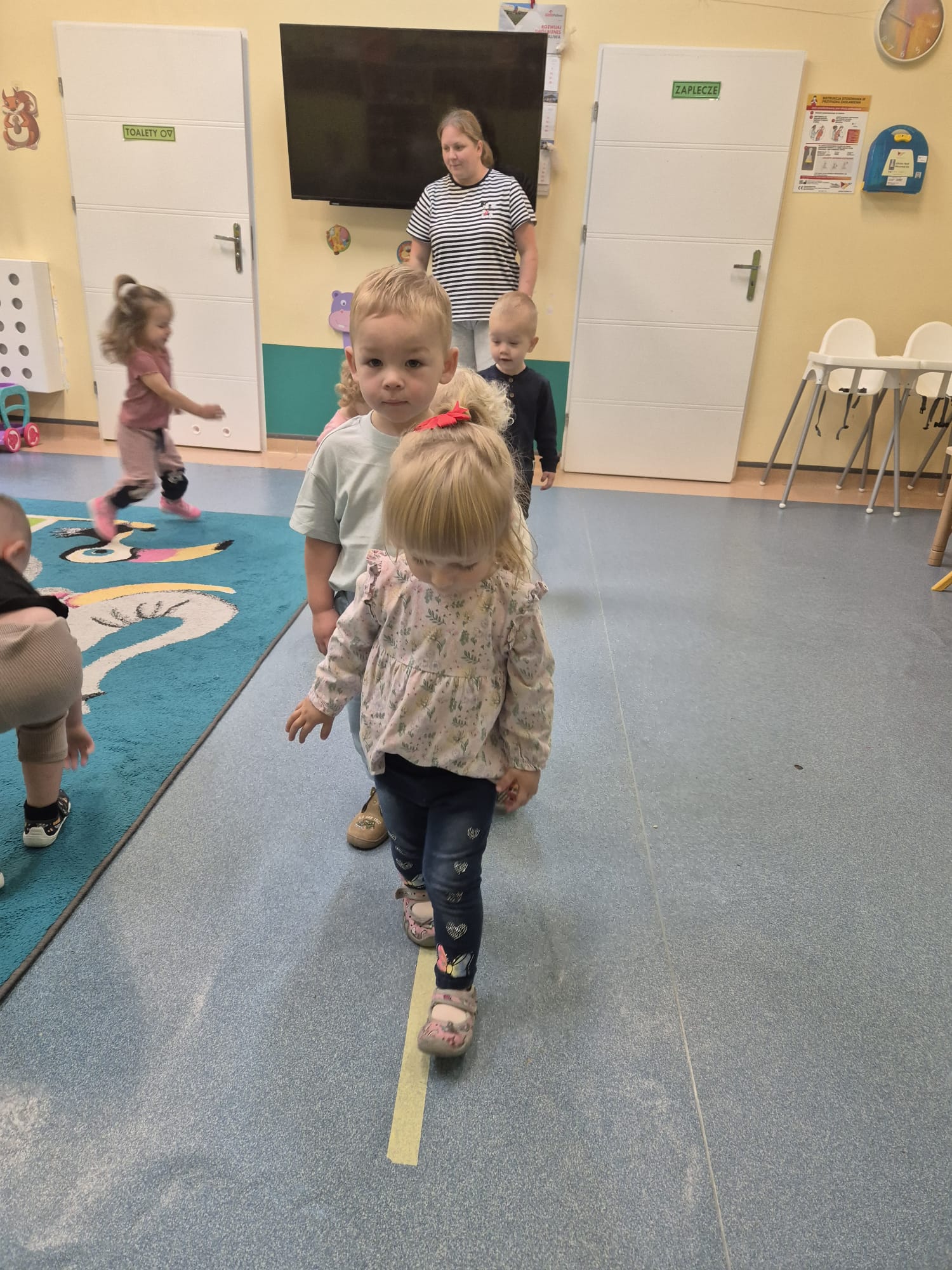 Dzieci chodziły dziś po naklejonej na podłodze taśmie w linii prostej.