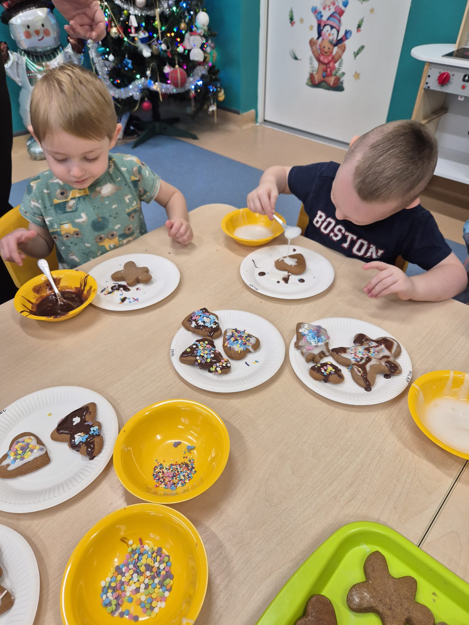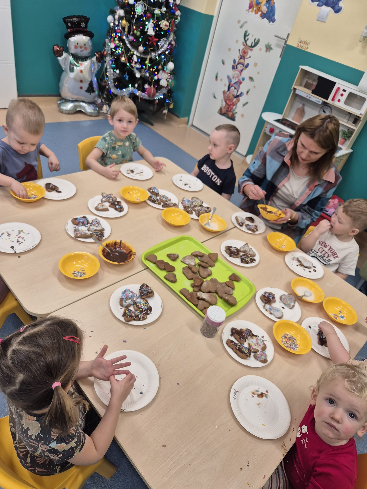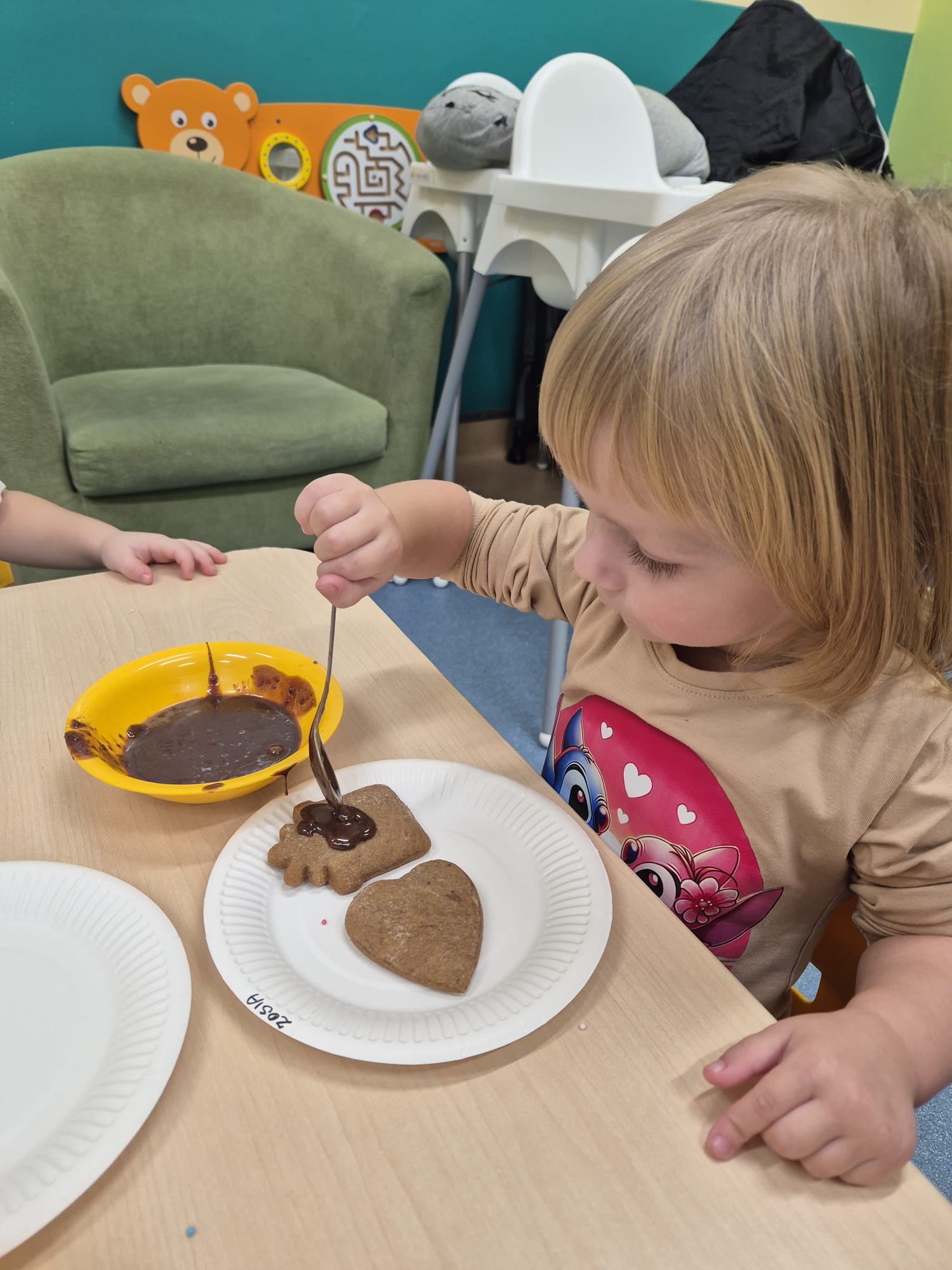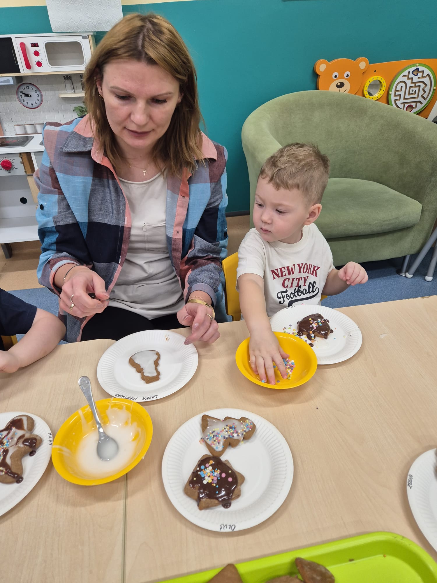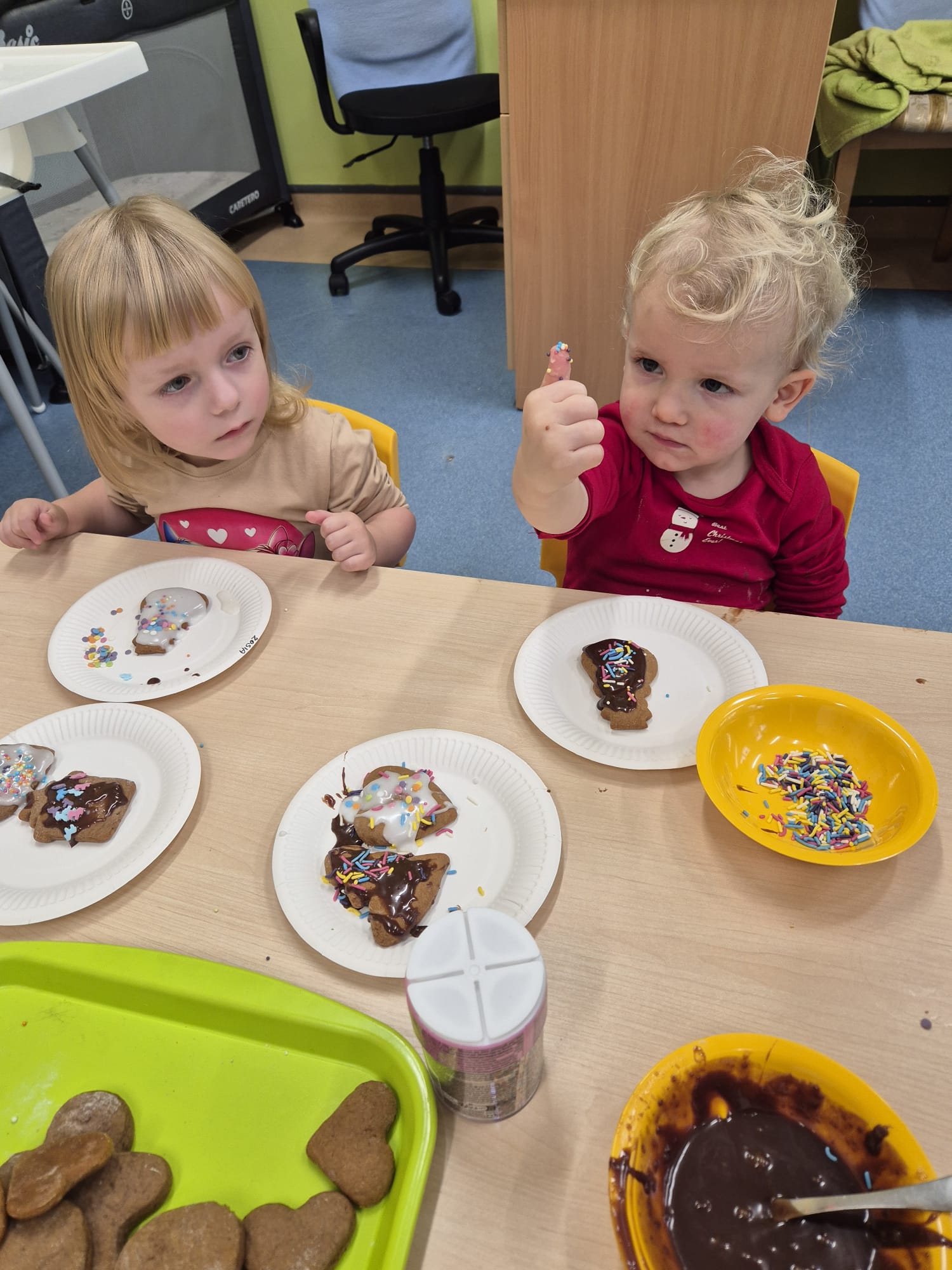 Żłobkowe dzieci są bardzo pracowite, dziś czekało na nich kolejne zadanie, bardzo słodkie zadanie. Maluchy dekorowały pierniczki, które wczoraj sami wycinali, a ciocia upiekła.