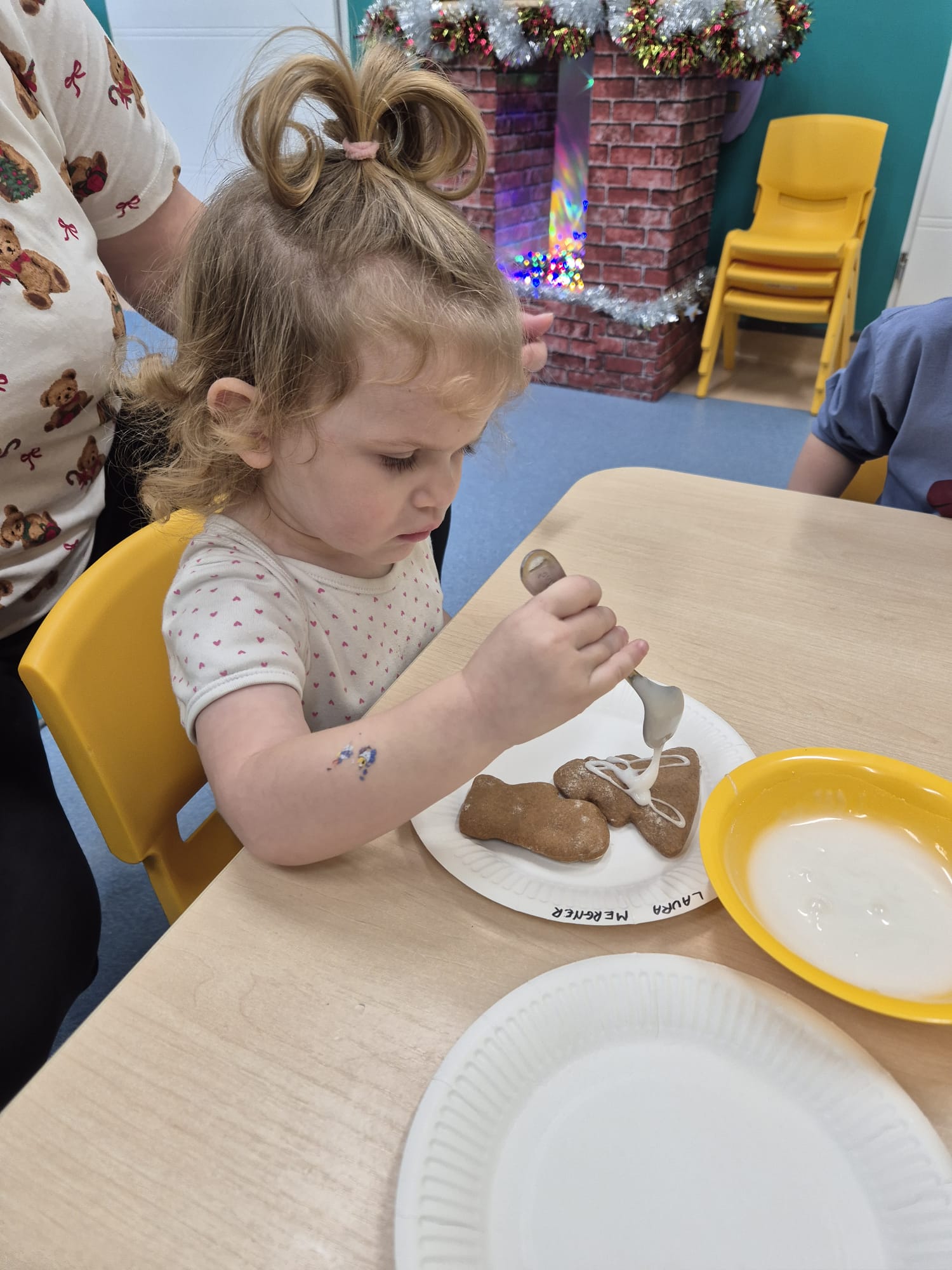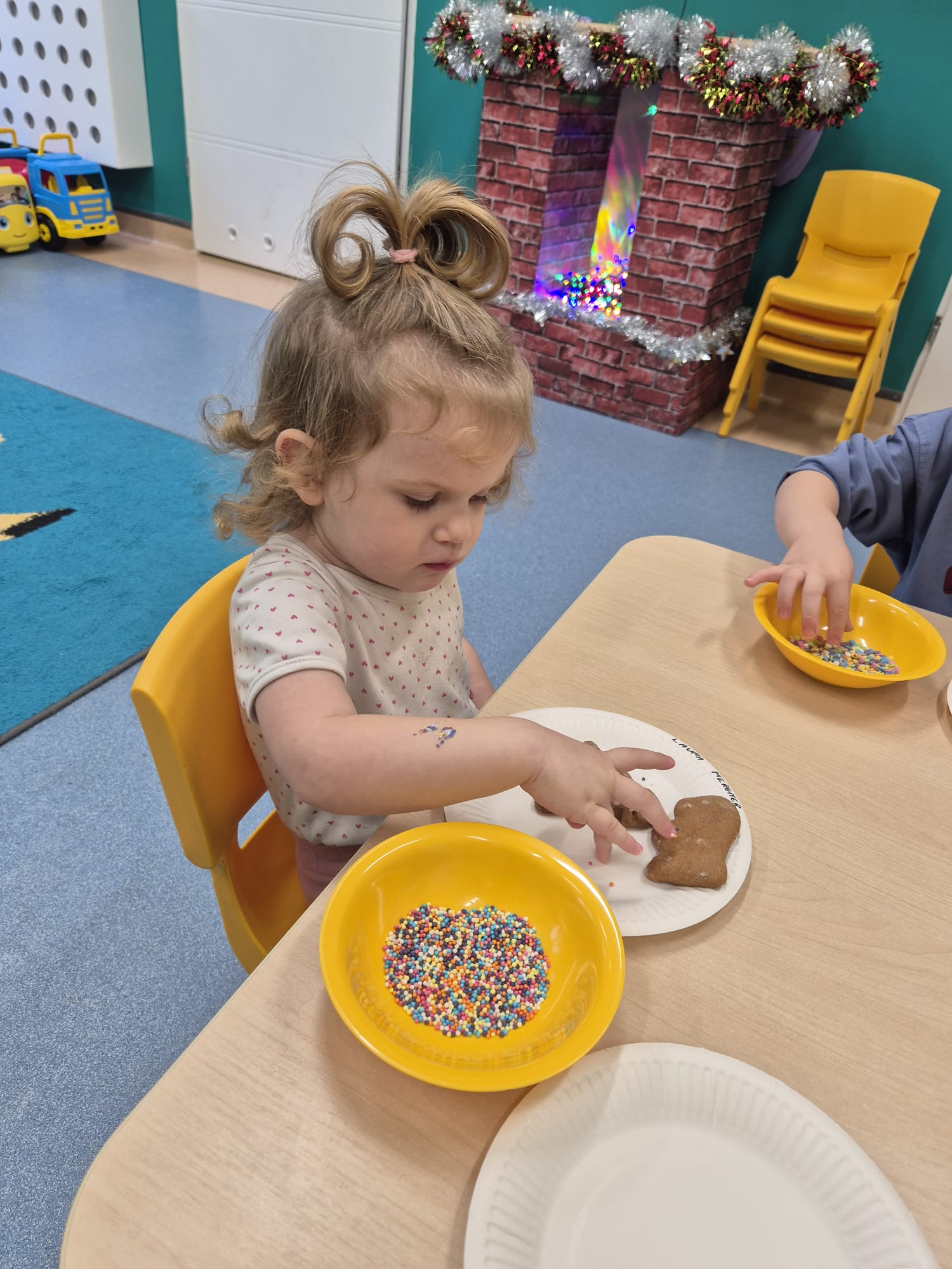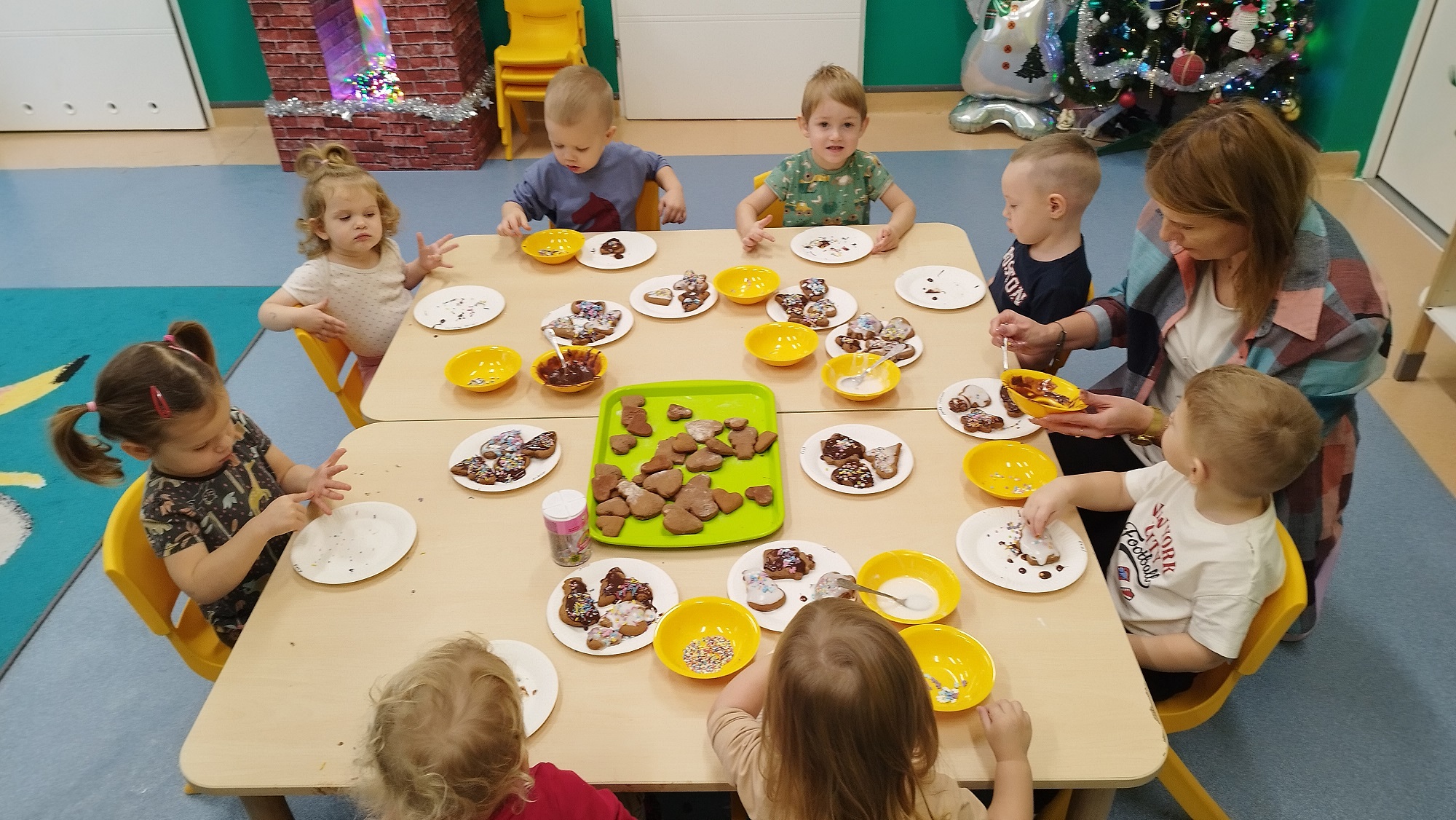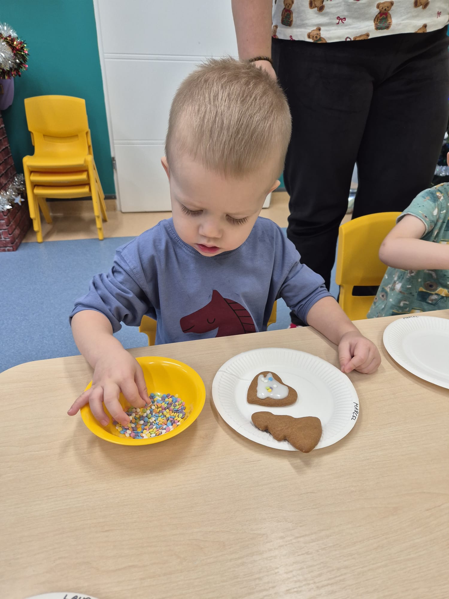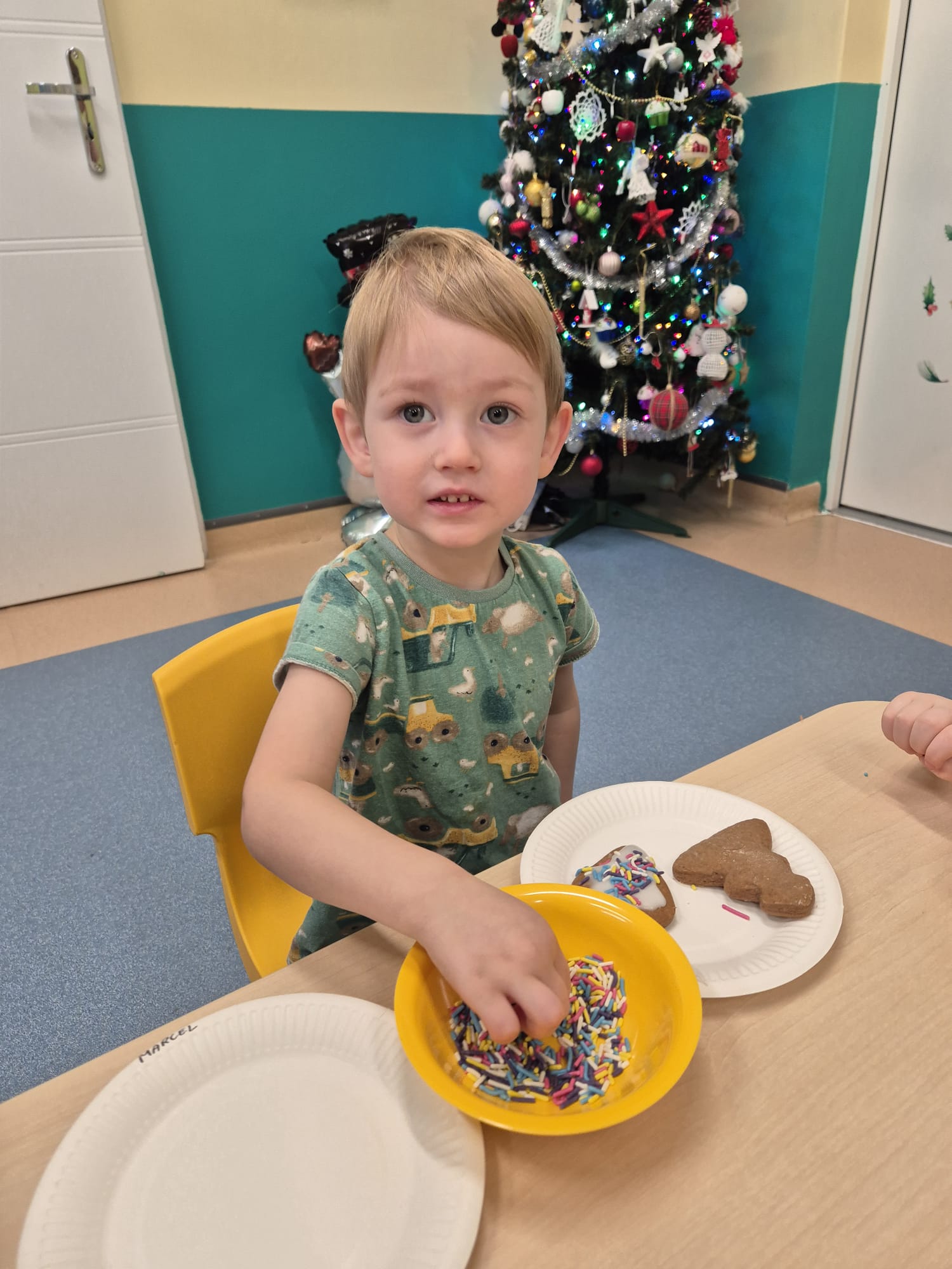 Żłobkowe dzieci są bardzo pracowite, dziś czekało na nich kolejne zadanie, bardzo słodkie zadanie. Maluchy dekorowały pierniczki, które wczoraj sami wycinali, a ciocia upiekła.