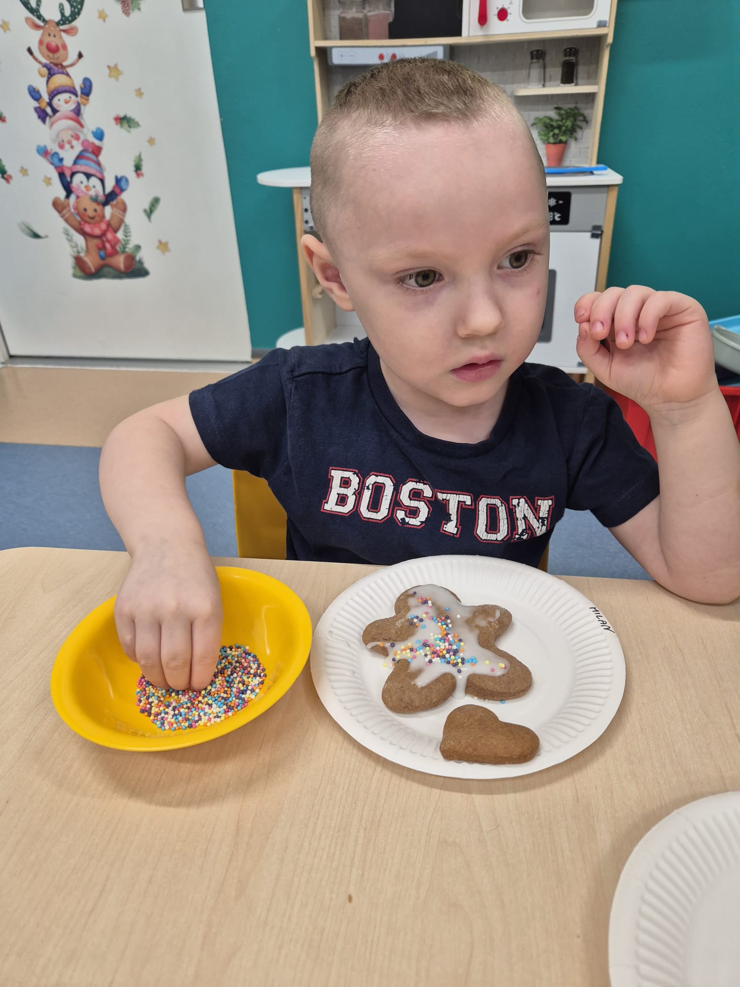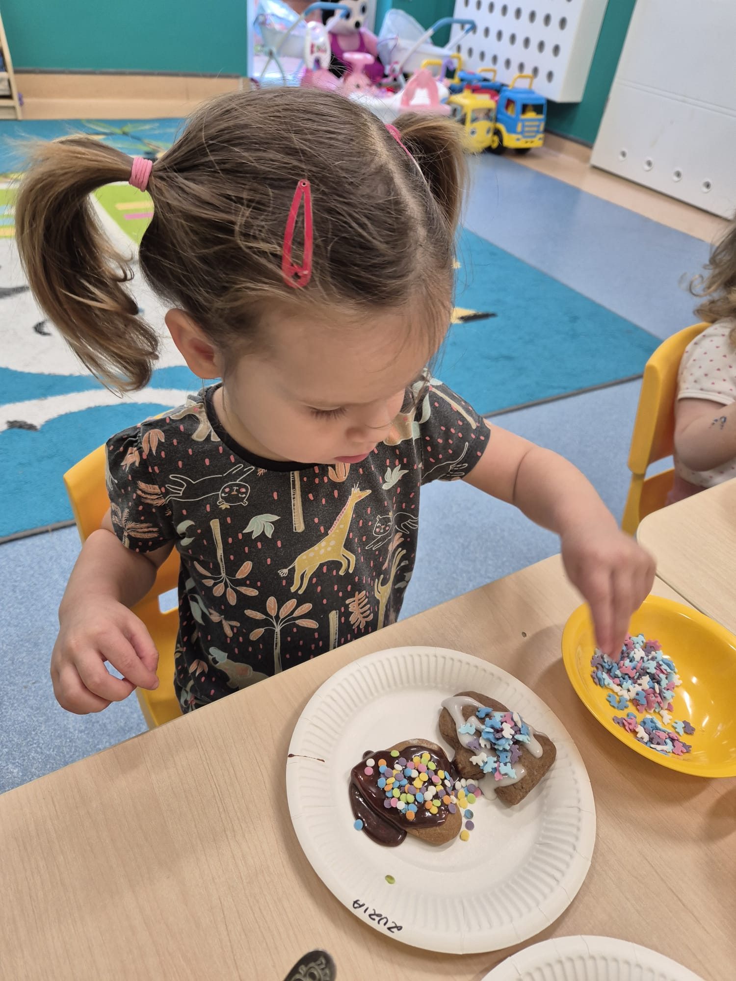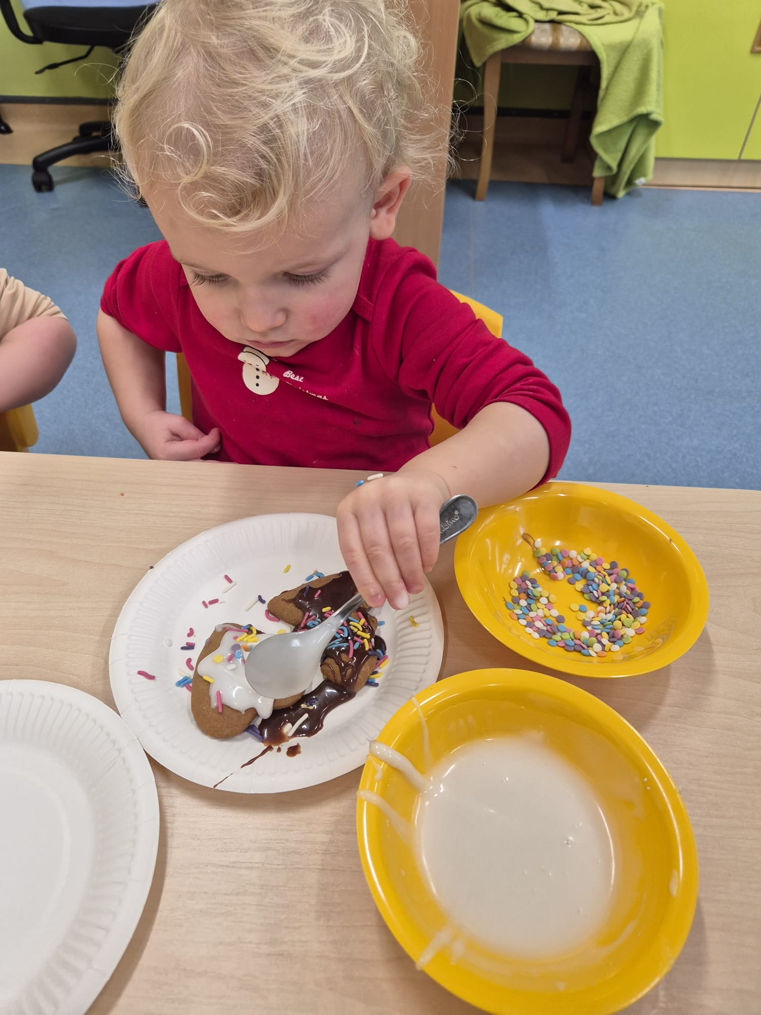 Było pysznie, wesoło i kolorowo. Lukier , polewa czekoladowa i kolorowe posypki bardzo smakowały maluchom i z przyjemnością oblizywali paluszki po zakończonej pracy.