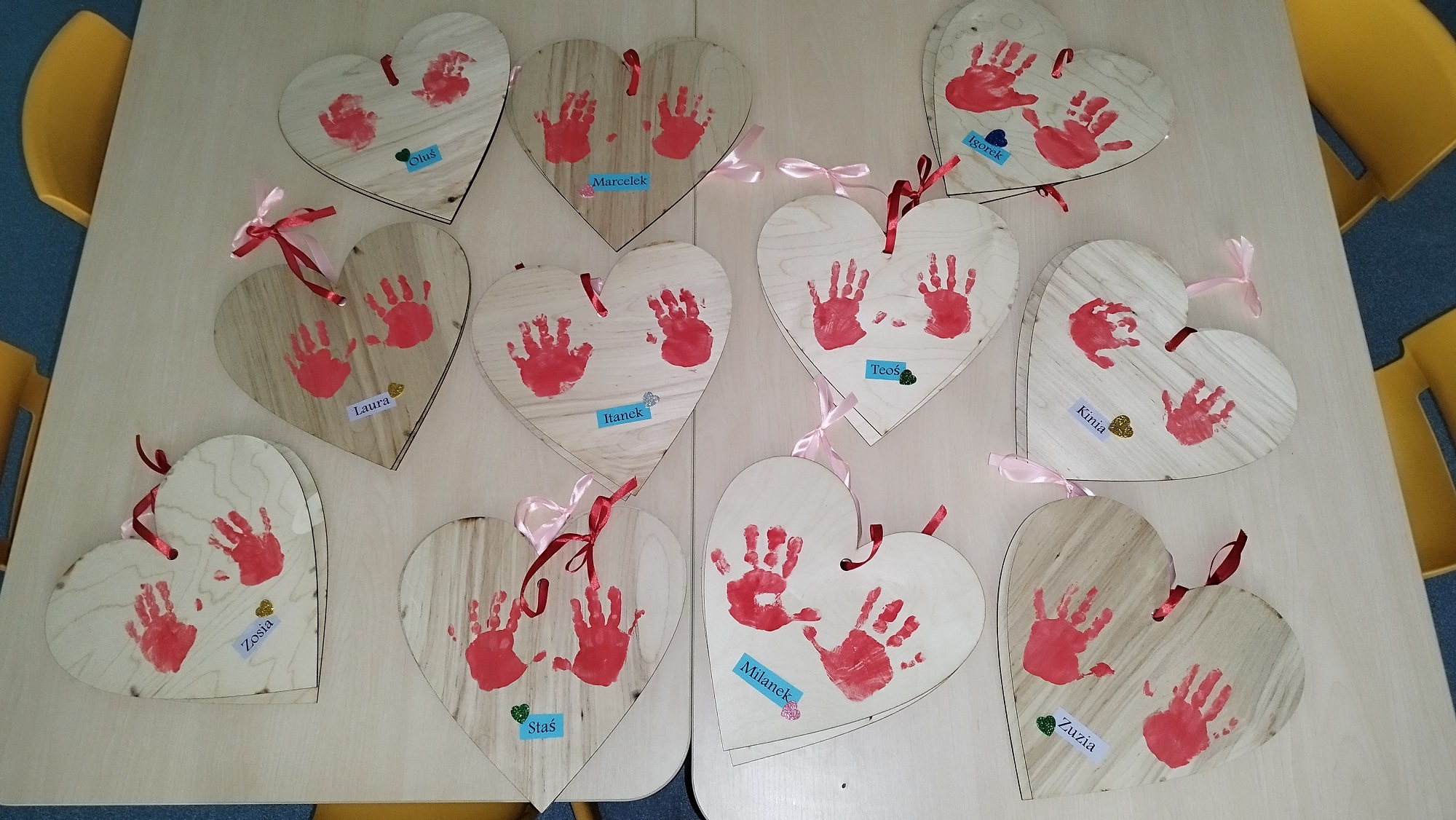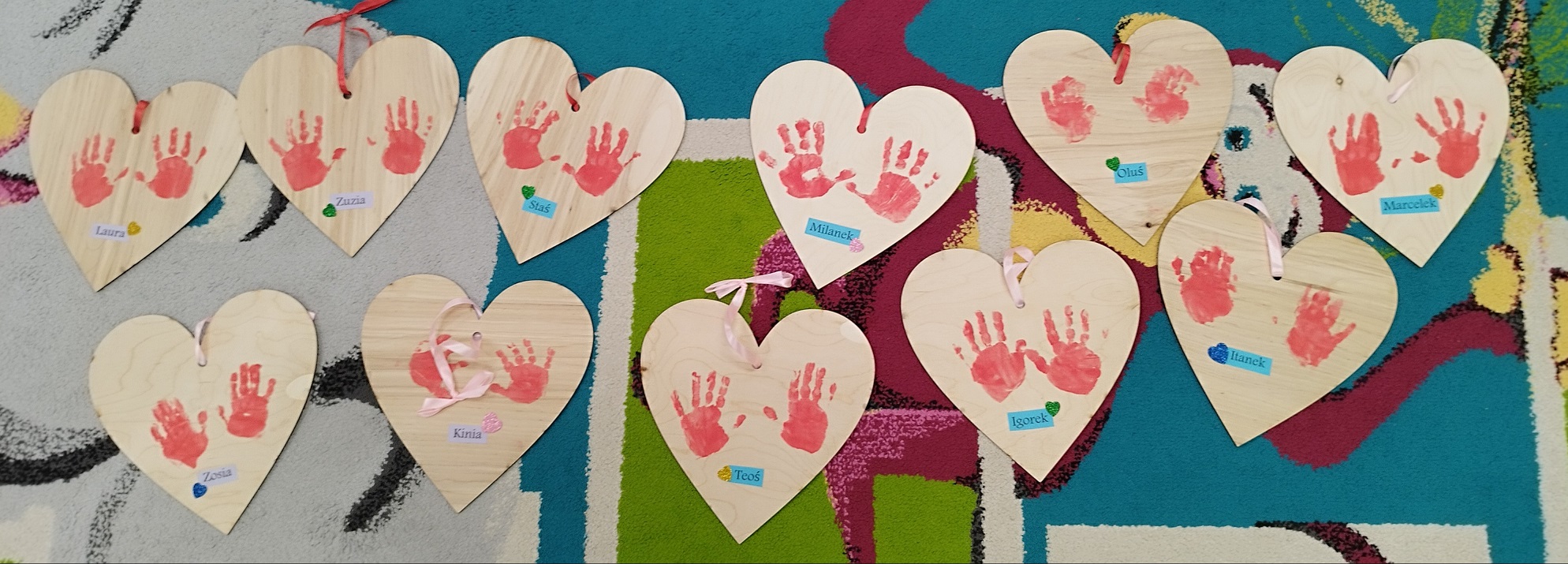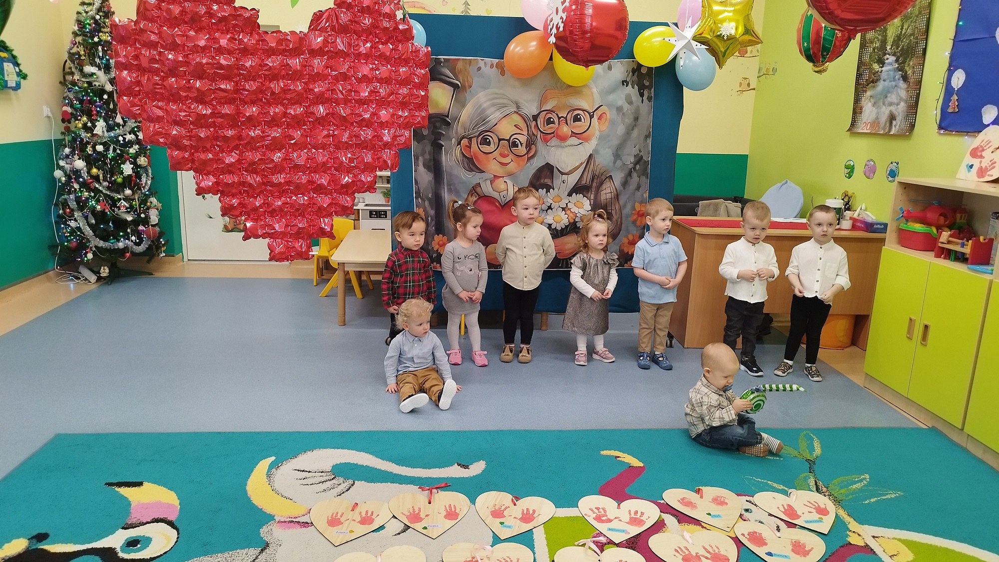 Dlatego też żłobkowe dzieci przygotowały dla swoich babć i dziadków piękne serca , na których odbiły swoje rączki oraz udekorowały je kolorowymi serduszkami.