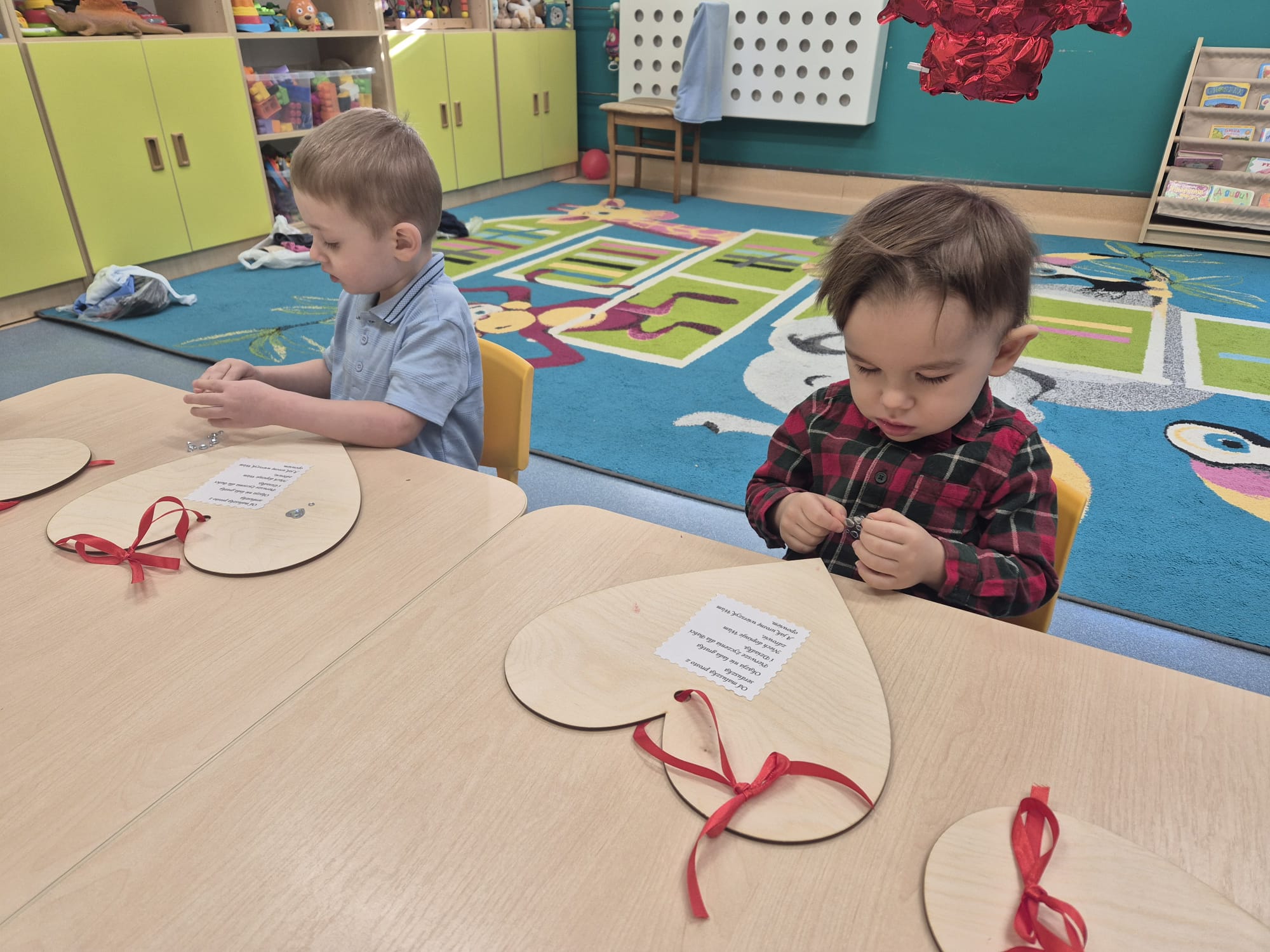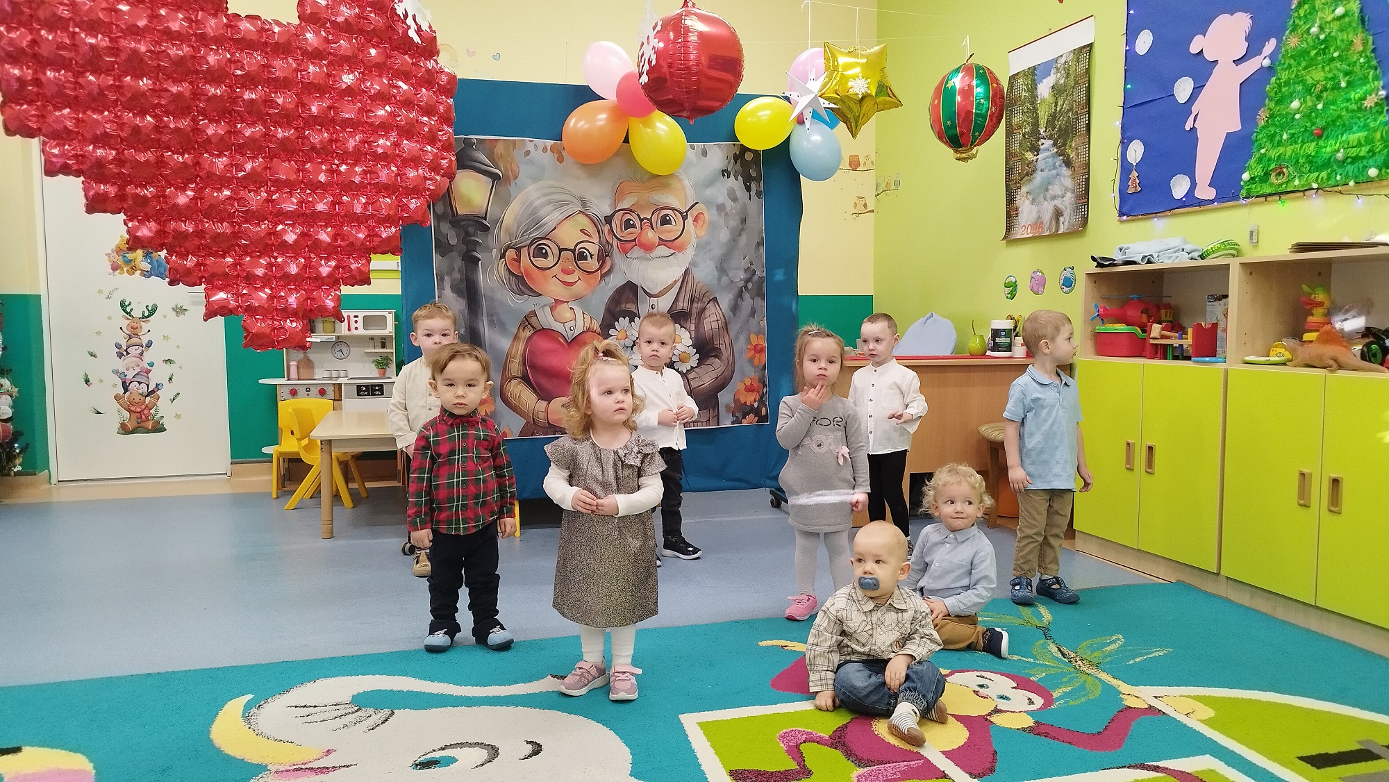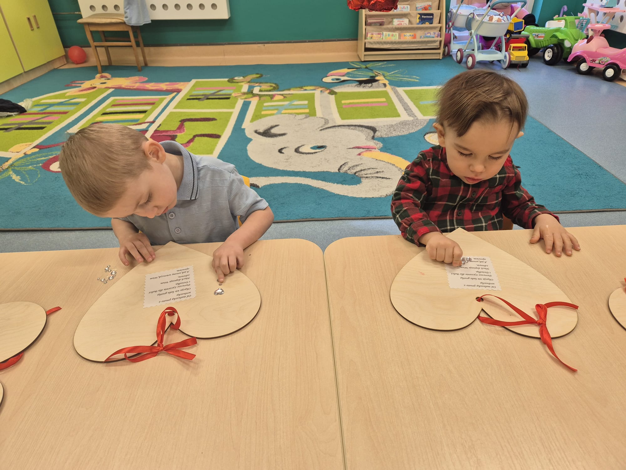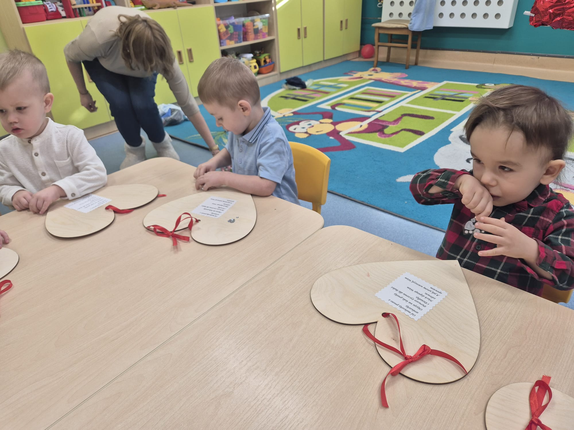 Dlatego też żłobkowe dzieci przygotowały dla swoich babć i dziadków piękne serca , na których odbiły swoje rączki oraz udekorowały je kolorowymi serduszkami.