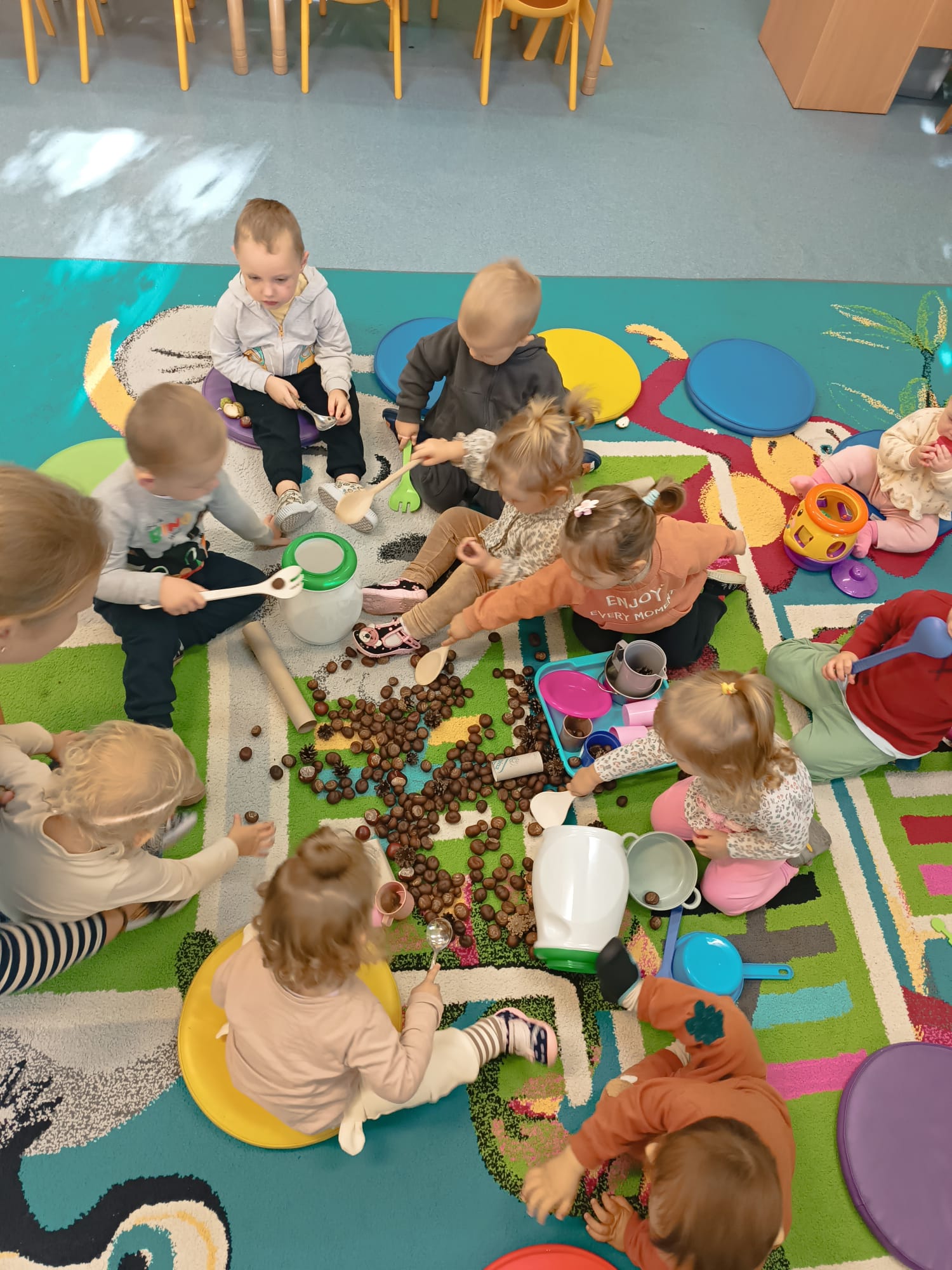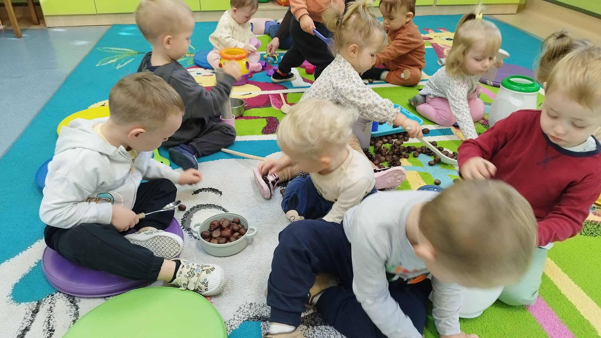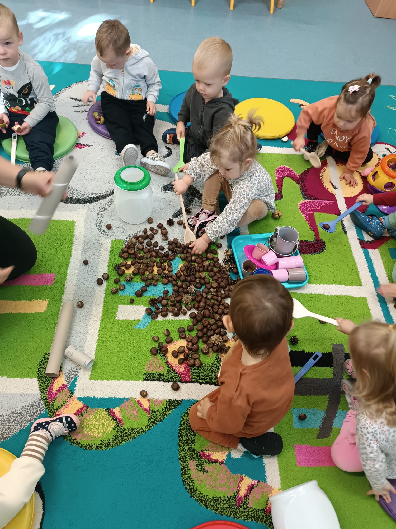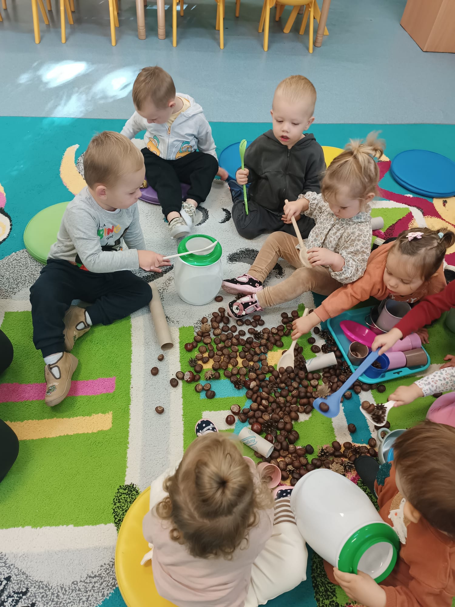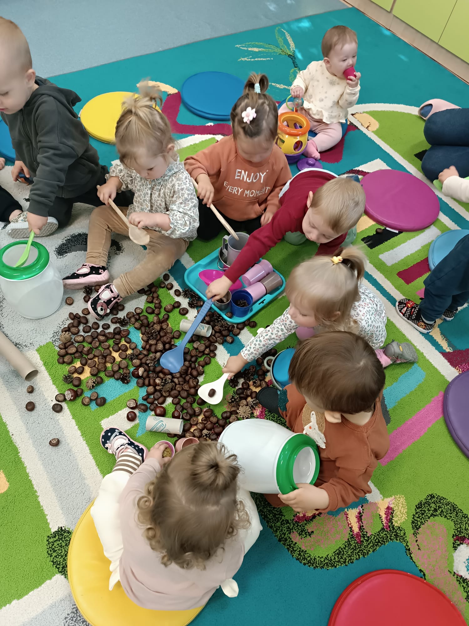 Następnie siedząc na dywanie mieszały, przesypywały wykorzystując dostępne pojemniki, turlały, nosiły na łyżce oraz rzucały kasztany do koszyka.
