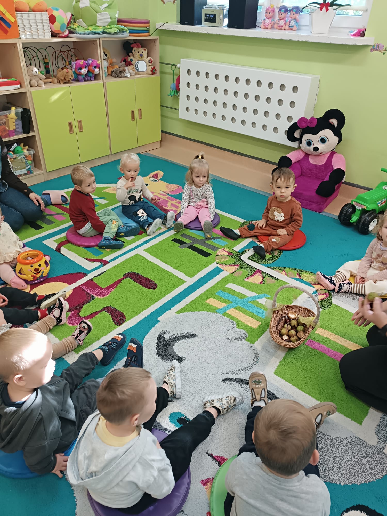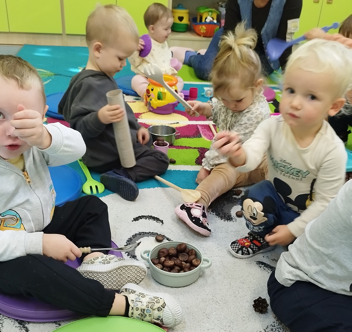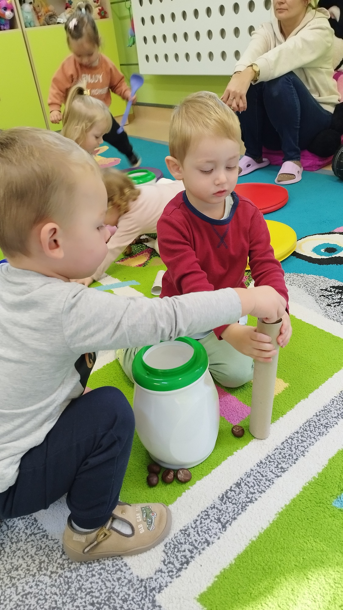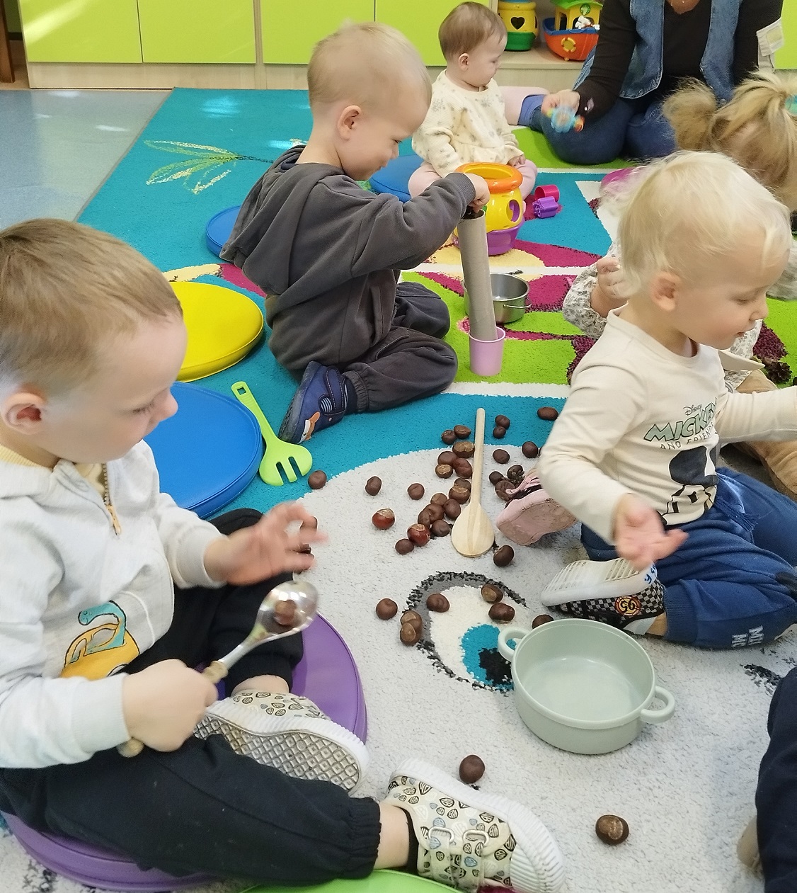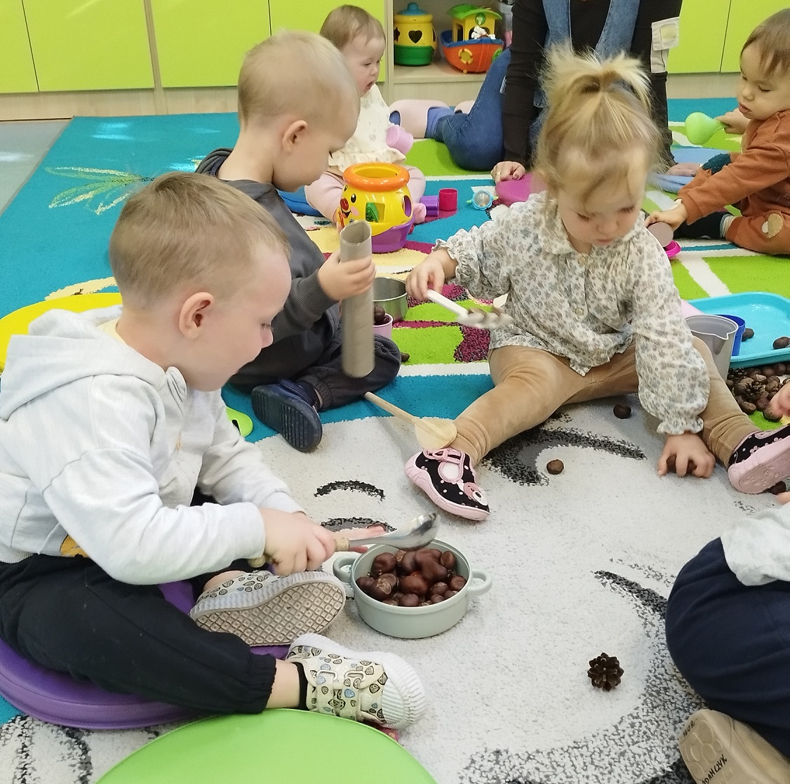 Następnie siedząc na dywanie mieszały, przesypywały wykorzystując dostępne pojemniki, turlały, nosiły na łyżce oraz rzucały kasztany do koszyka.