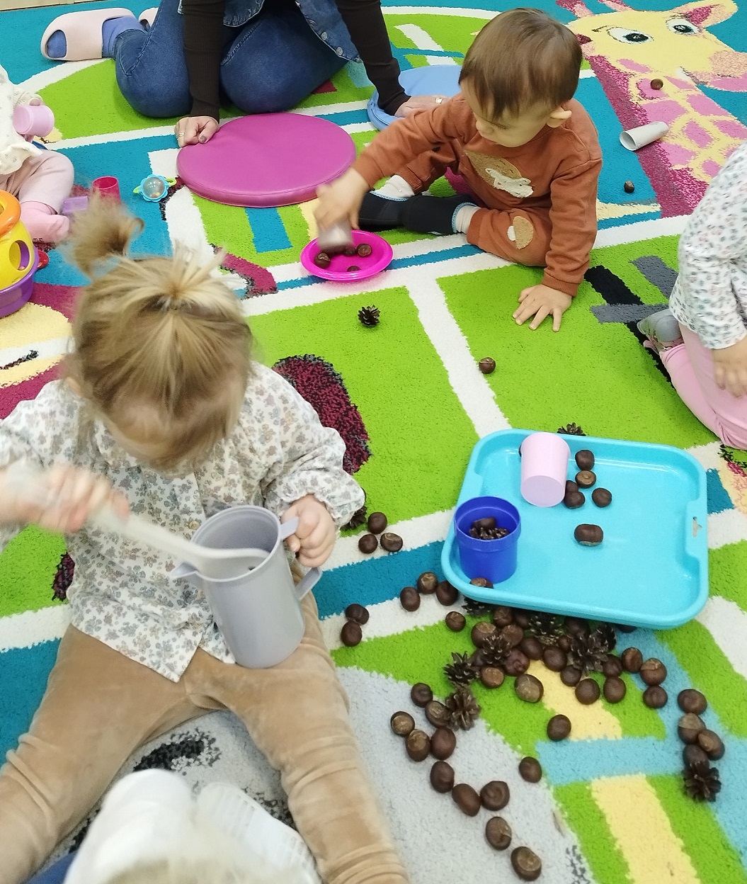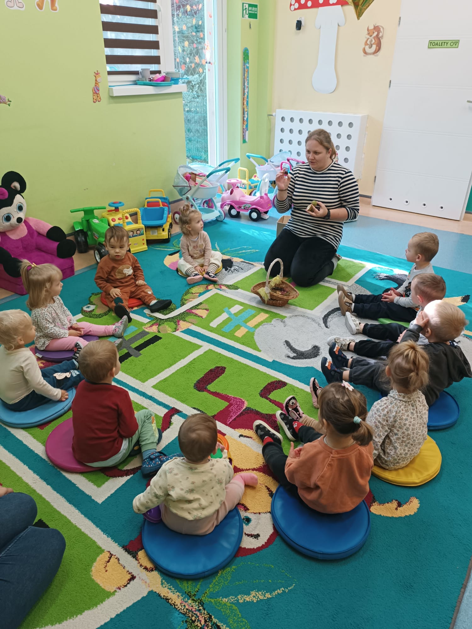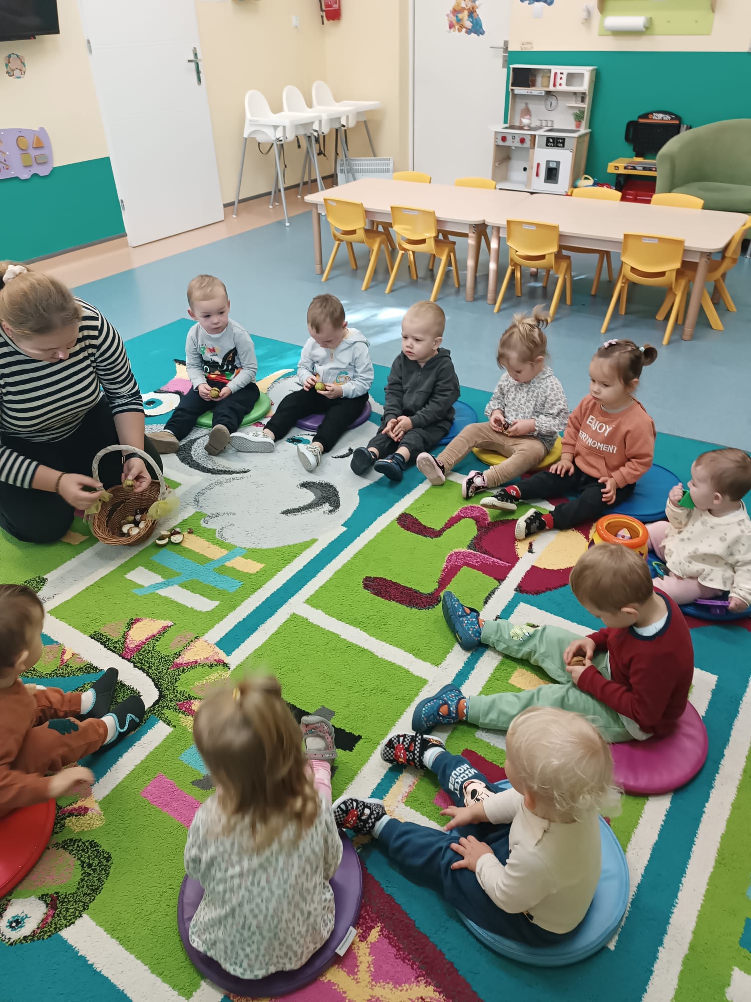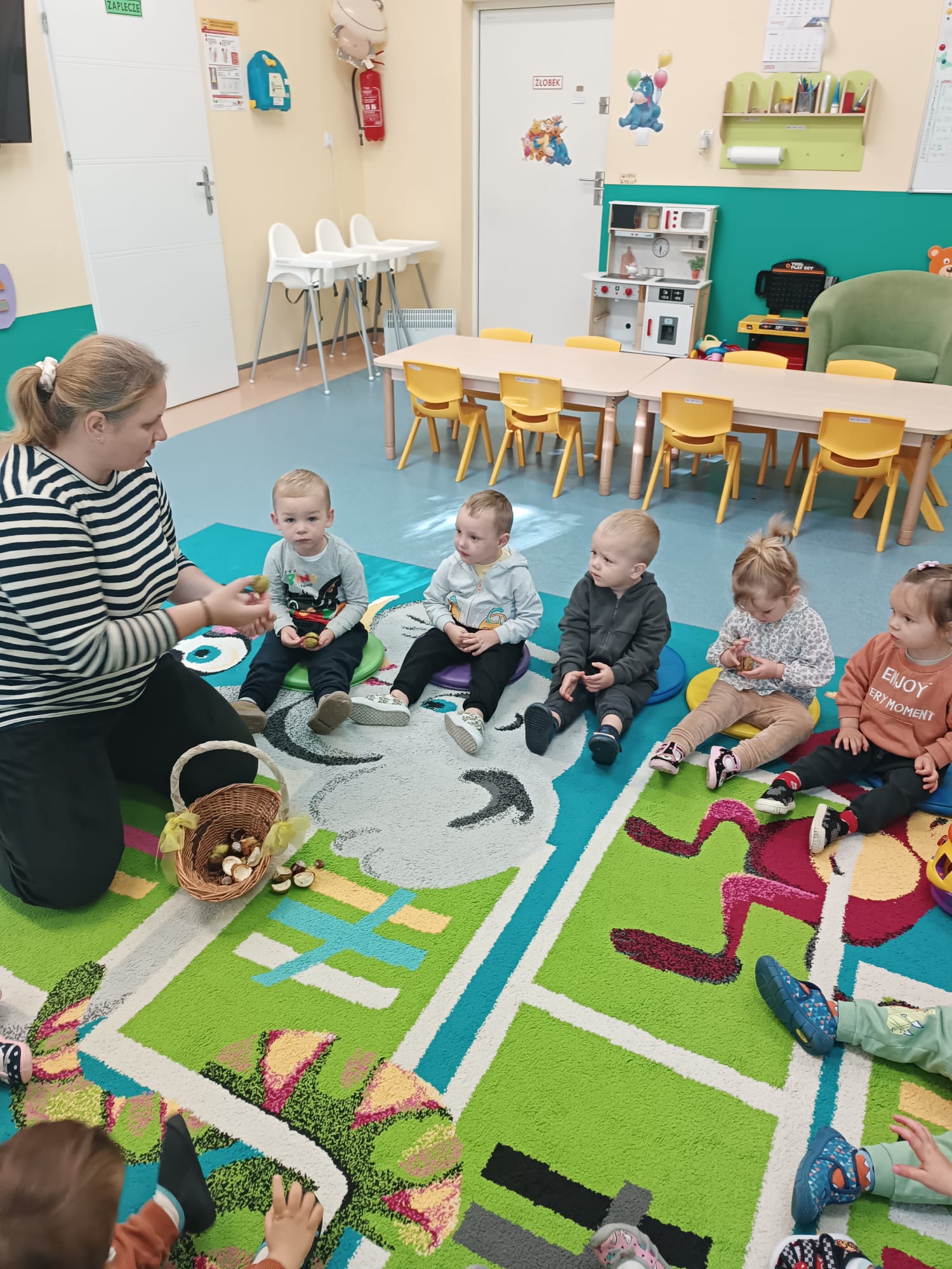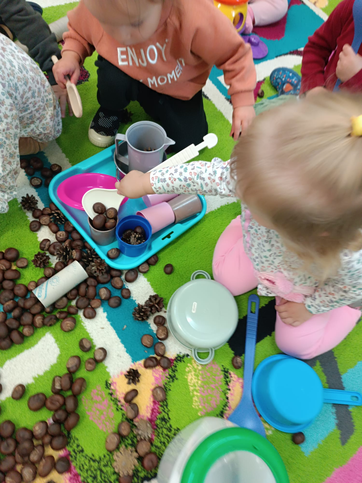 Następnie siedząc na dywanie mieszały, przesypywały wykorzystując dostępne pojemniki, turlały, nosiły na łyżce oraz rzucały kasztany do koszyka.