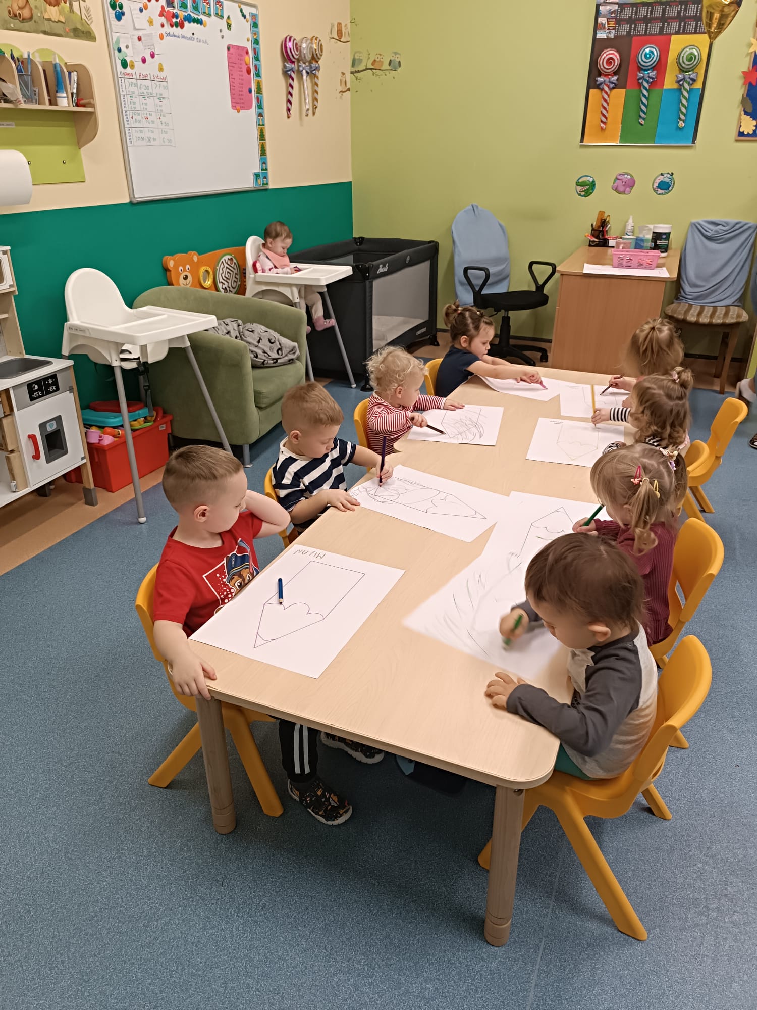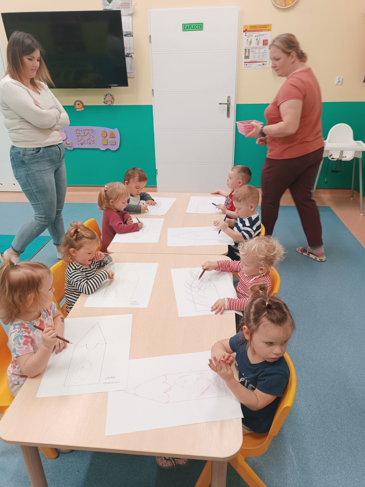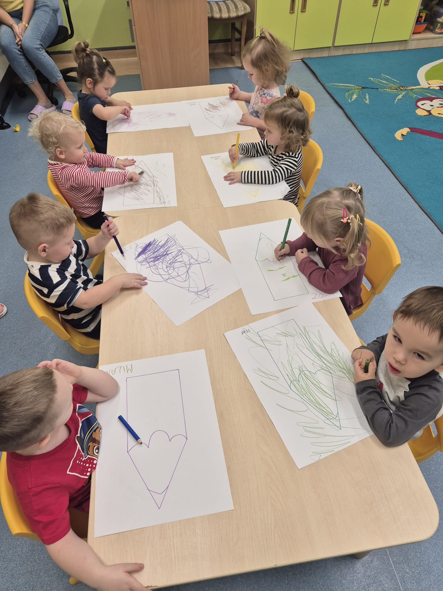Praca plastyczna przy stoliku polegała na pomalowaniu narysowanej na kartonie kredki na dany kolor, próbując nie wyjeżdżać za linię oraz zwracając uwagę na prawidłowe trzymanie kredki.