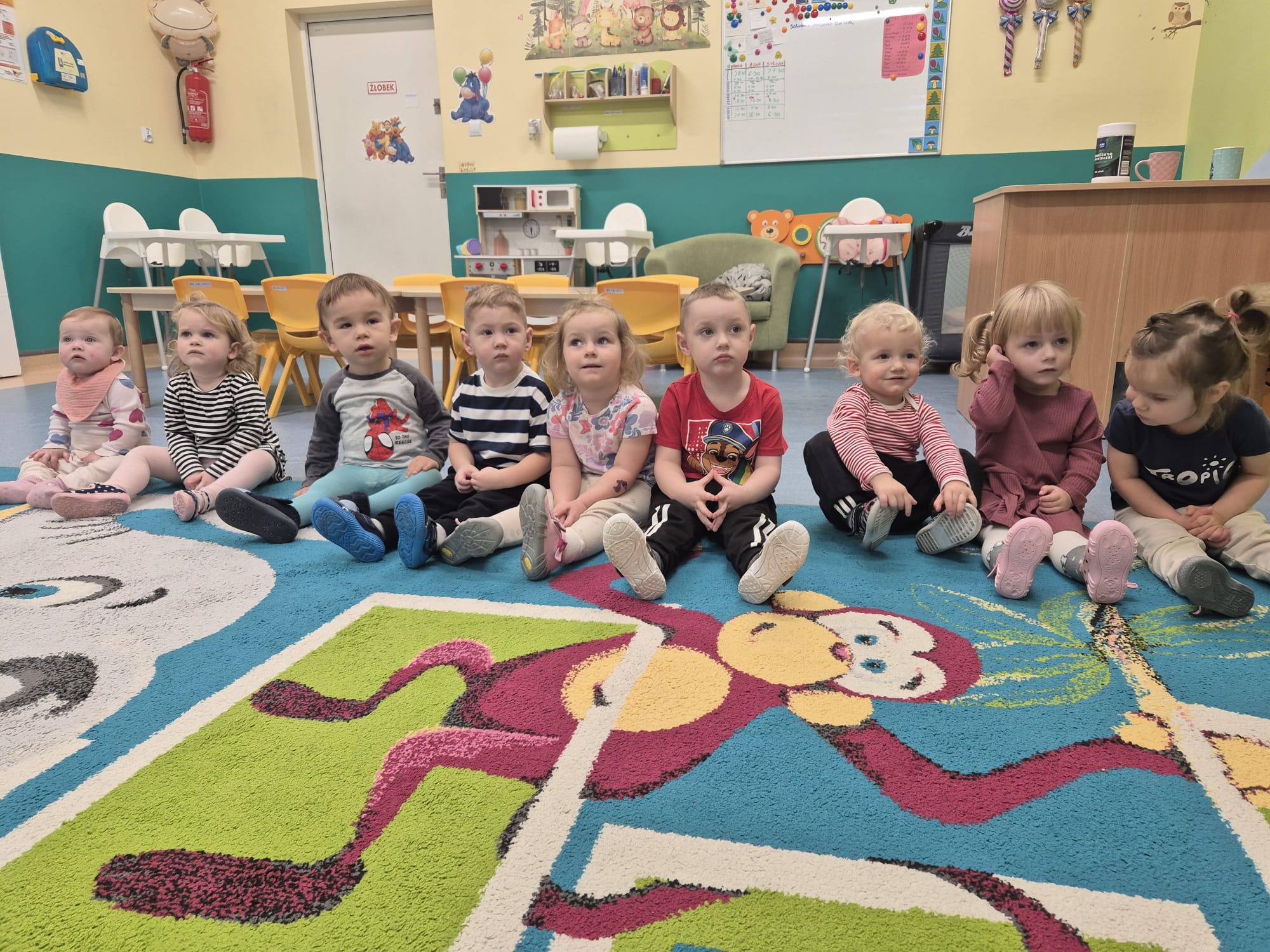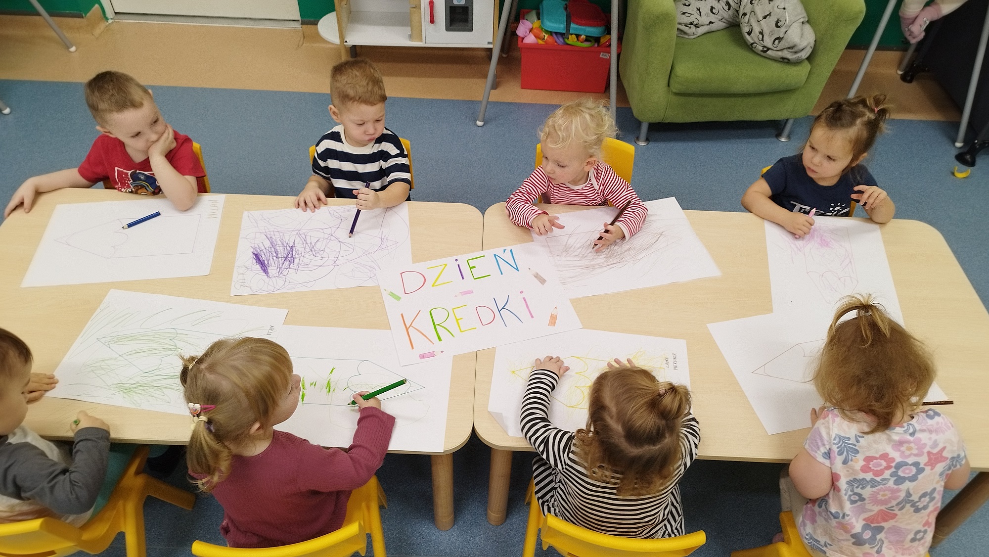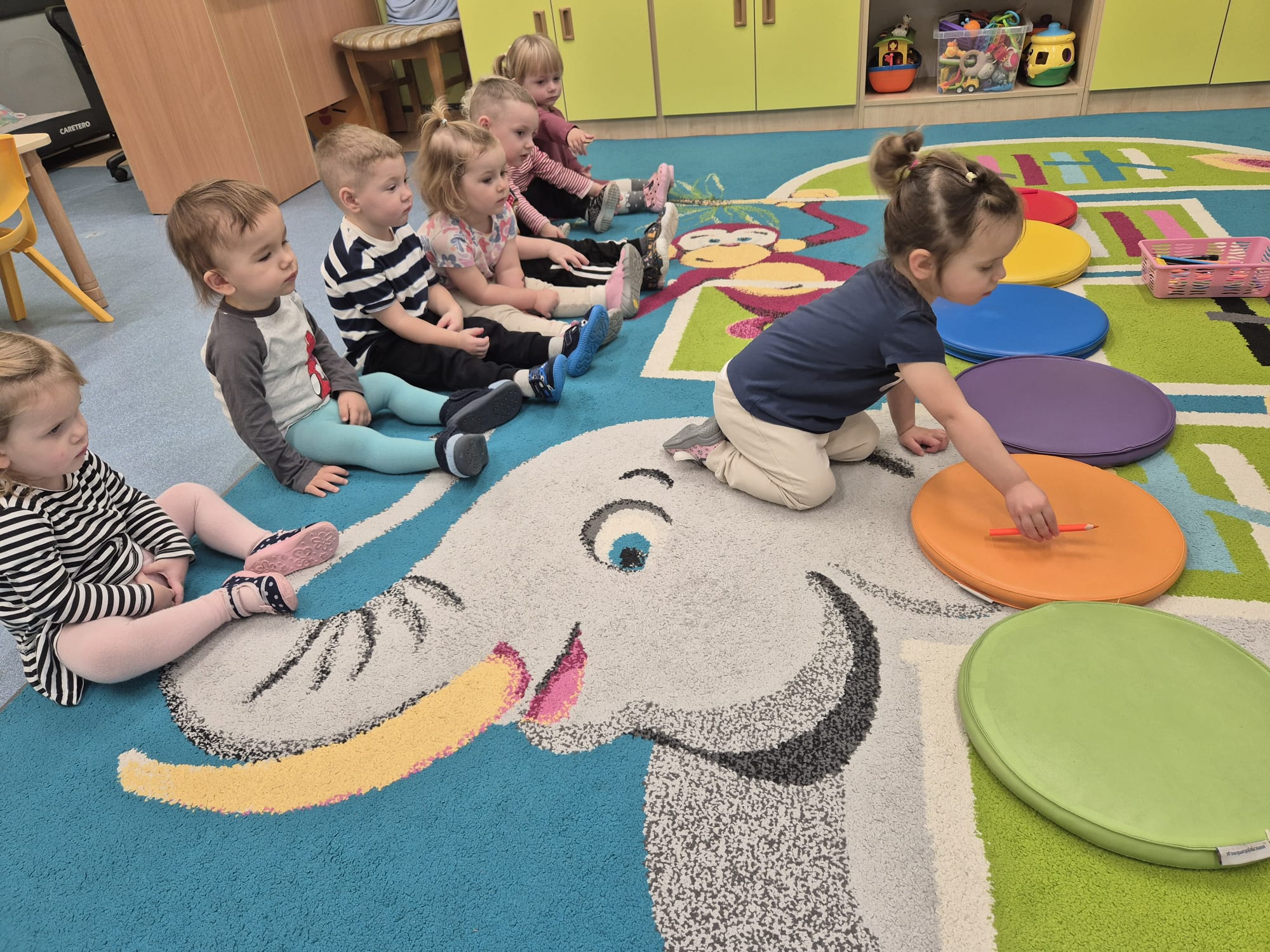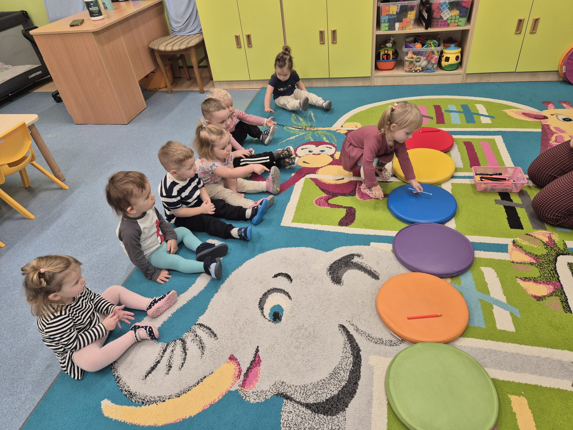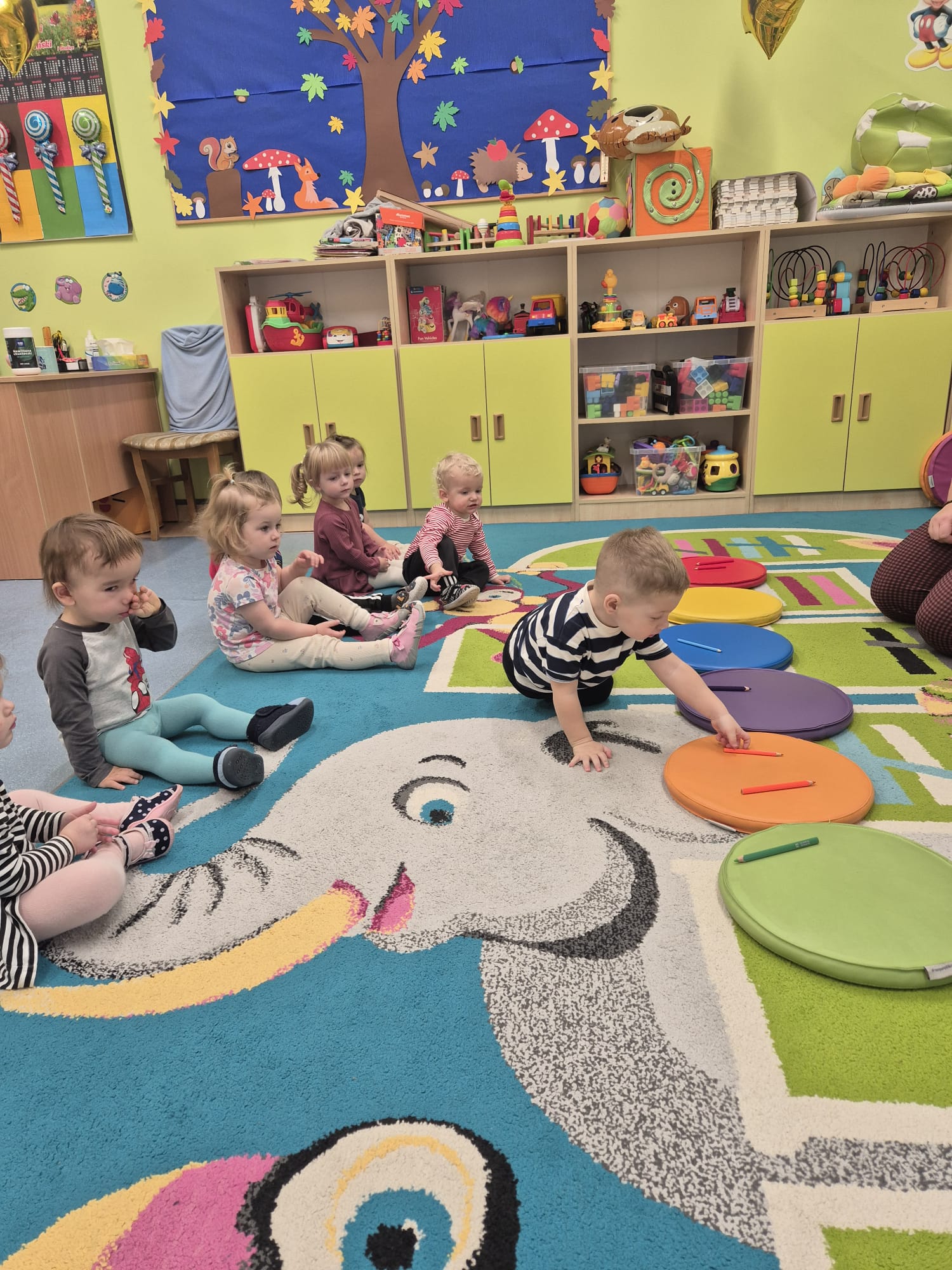 Nie mogło dziś zabraknąć utworu muzycznego "Kolorowe kredki", przy którym maluchy wesoło tańczyły w kółeczko i podskakując na hasło -kredki.