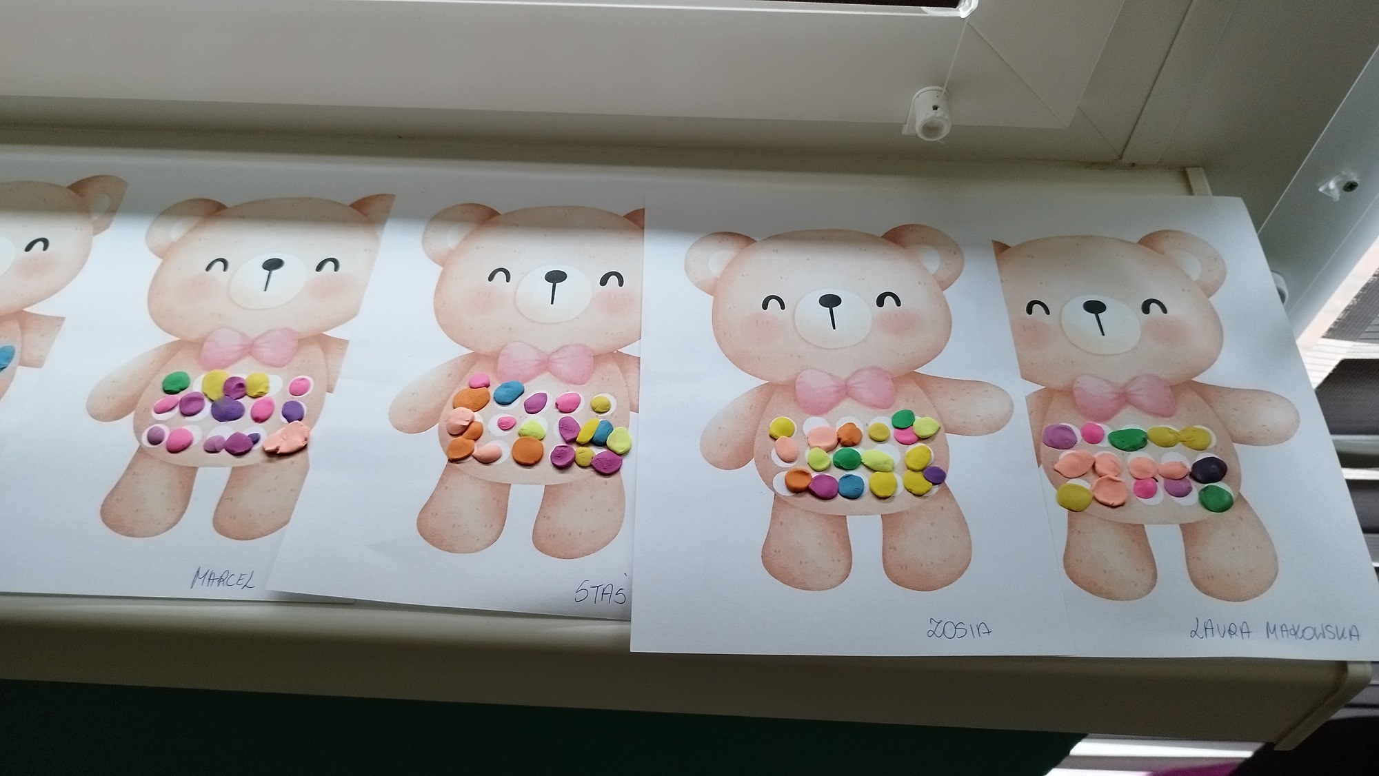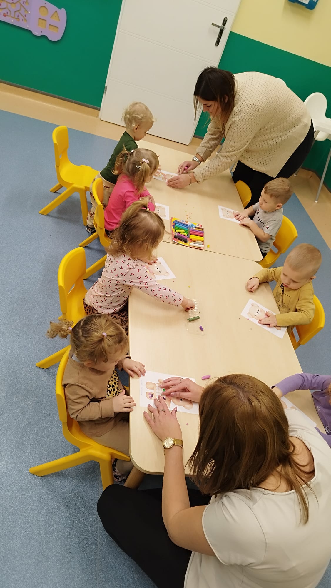 Przy stoliku dzieci ćwiczyły paluszki wyklejając puste brzuszki misiów kuleczkami kolorowej plasteliny.