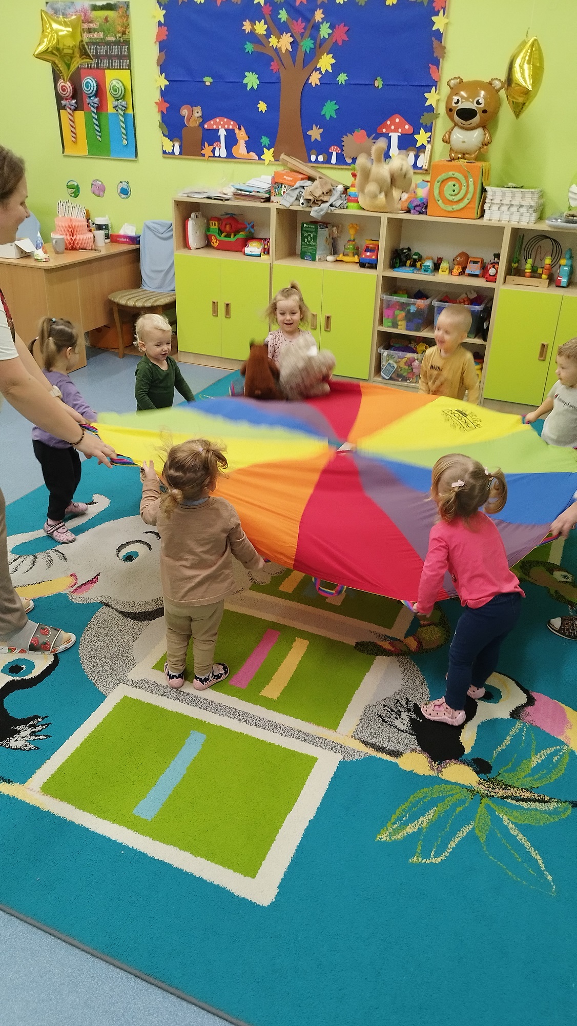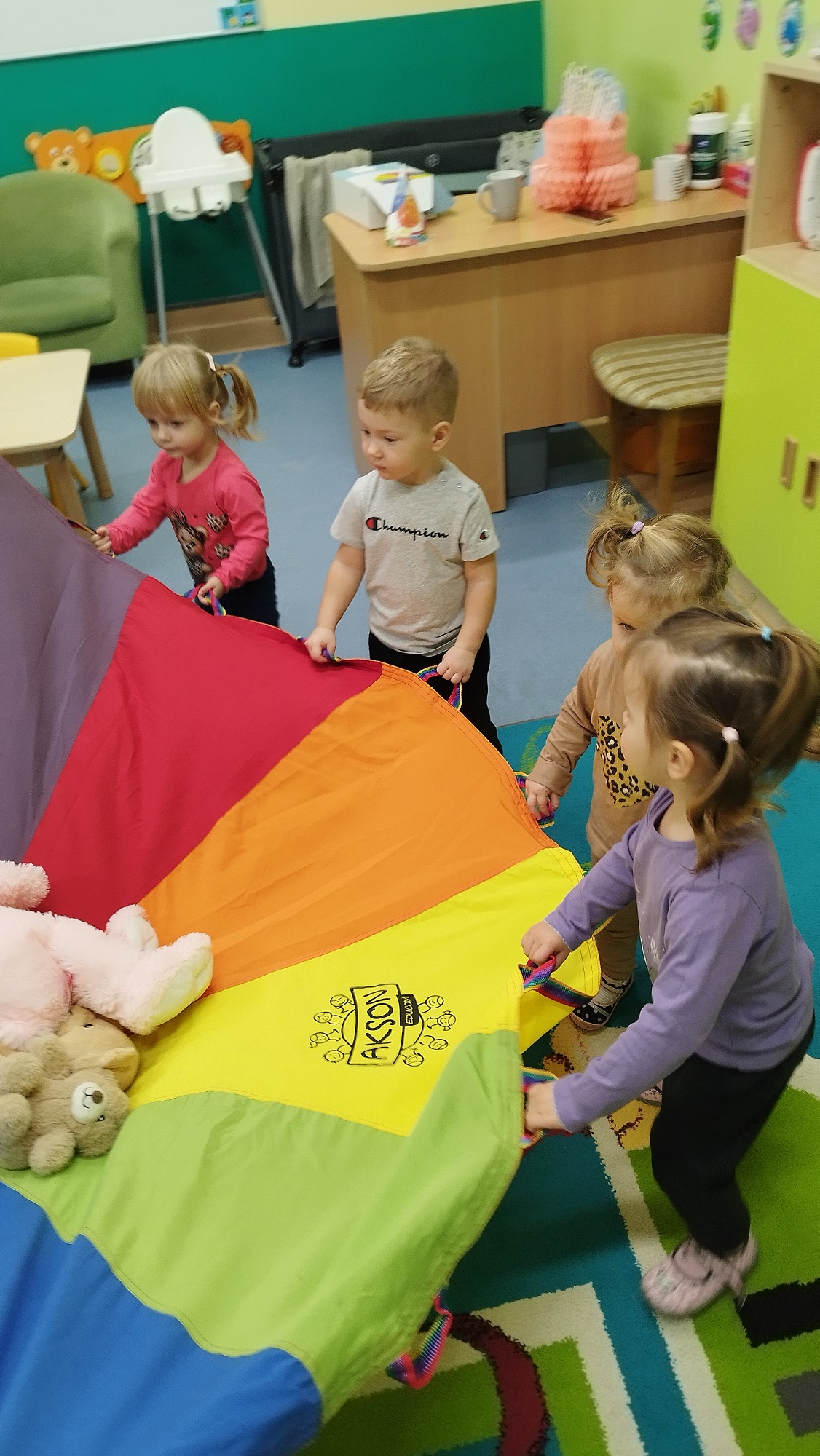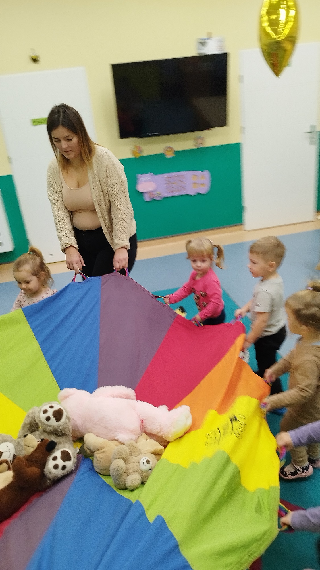 Dzieciom bardzo podobała się zabawa z chustą animacyjną i misiami- wszyscy wspólnie trzymając chustę kręciliśmy się wkoło lub unosiliśmy i opuszczaliśmy chustę przy piosenkach o misiach w tle . Staraliśmy się , by żaden miś nie spadł z chusty podczas tej zabawy. Jednak najbardziej podobało się maluchom podrzucanie i zrzucanie misiów z kolorowego koła, robiły przy tym niezły wiaterek.