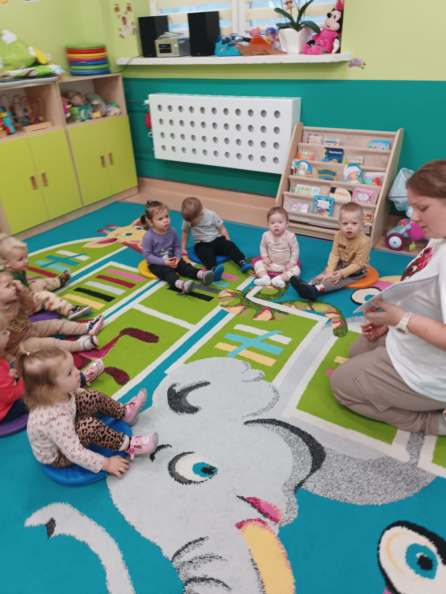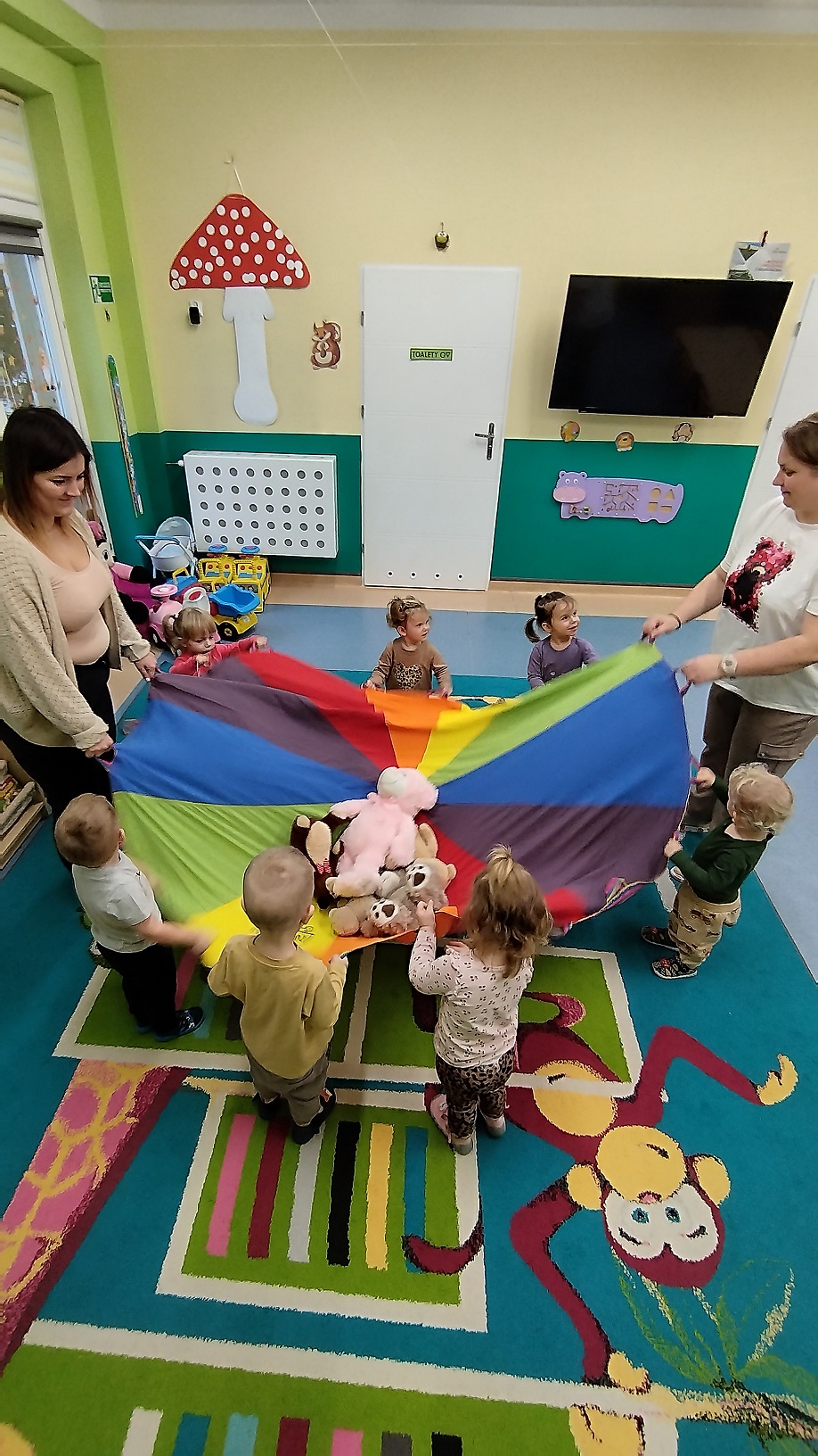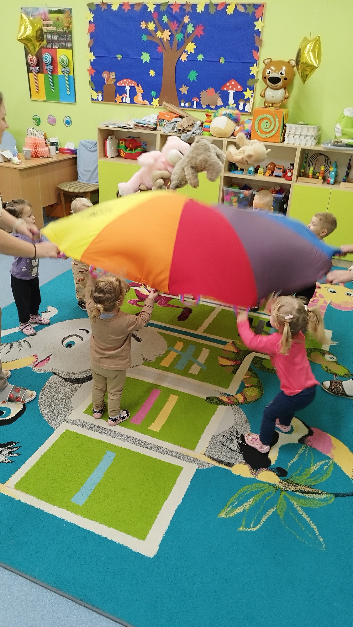 Dzieciom bardzo podobała się zabawa z chustą animacyjną i misiami- wszyscy wspólnie trzymając chustę kręciliśmy się wkoło lub unosiliśmy i opuszczaliśmy chustę przy piosenkach o misiach w tle . Staraliśmy się , by żaden miś nie spadł z chusty podczas tej zabawy. Jednak najbardziej podobało się maluchom podrzucanie i zrzucanie misiów z kolorowego koła, robiły przy tym niezły wiaterek.