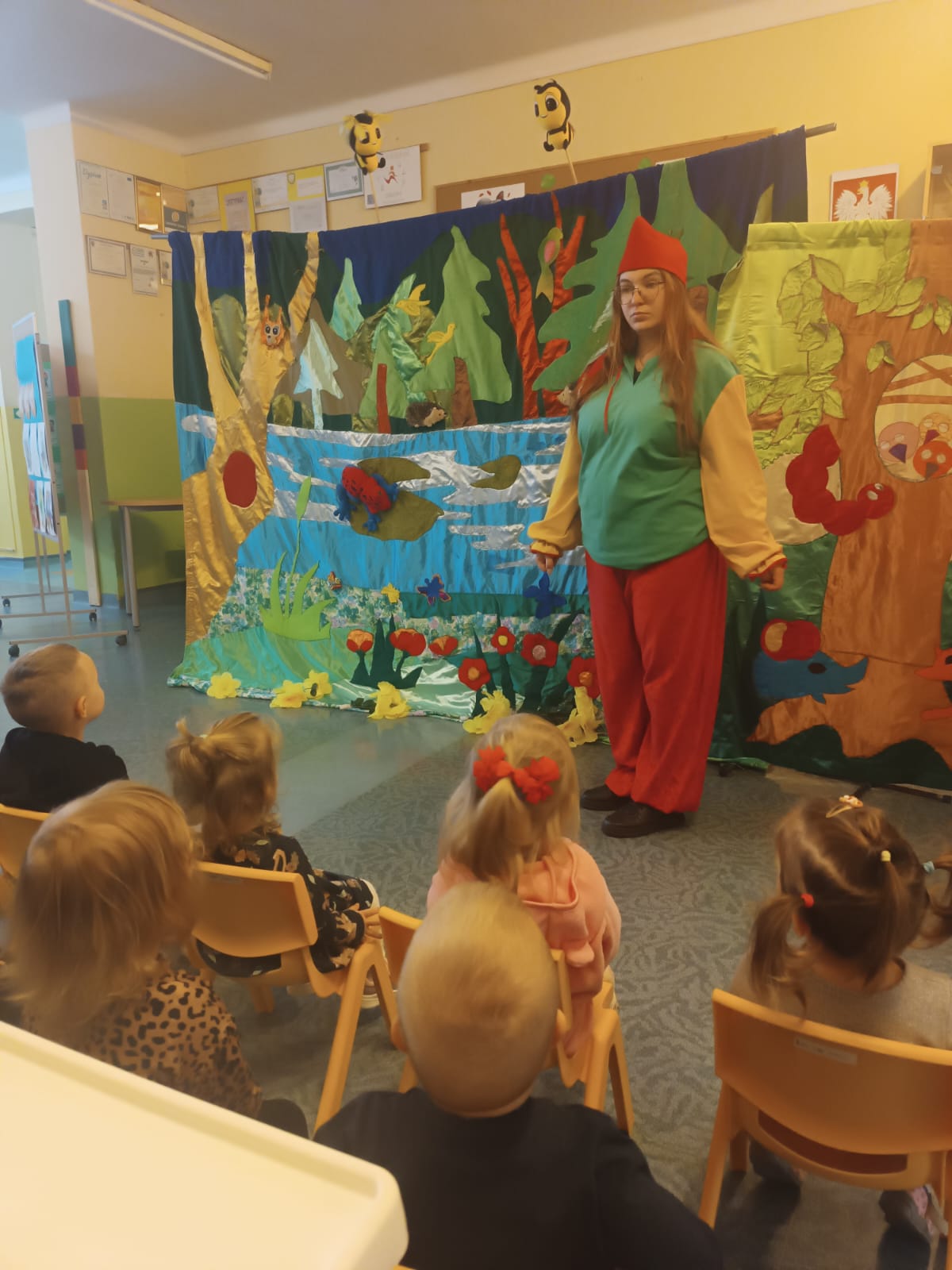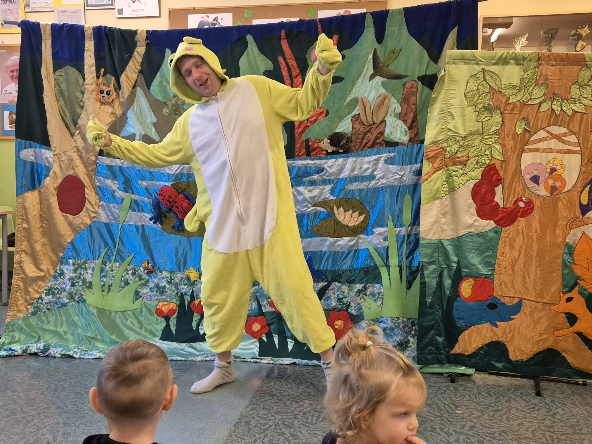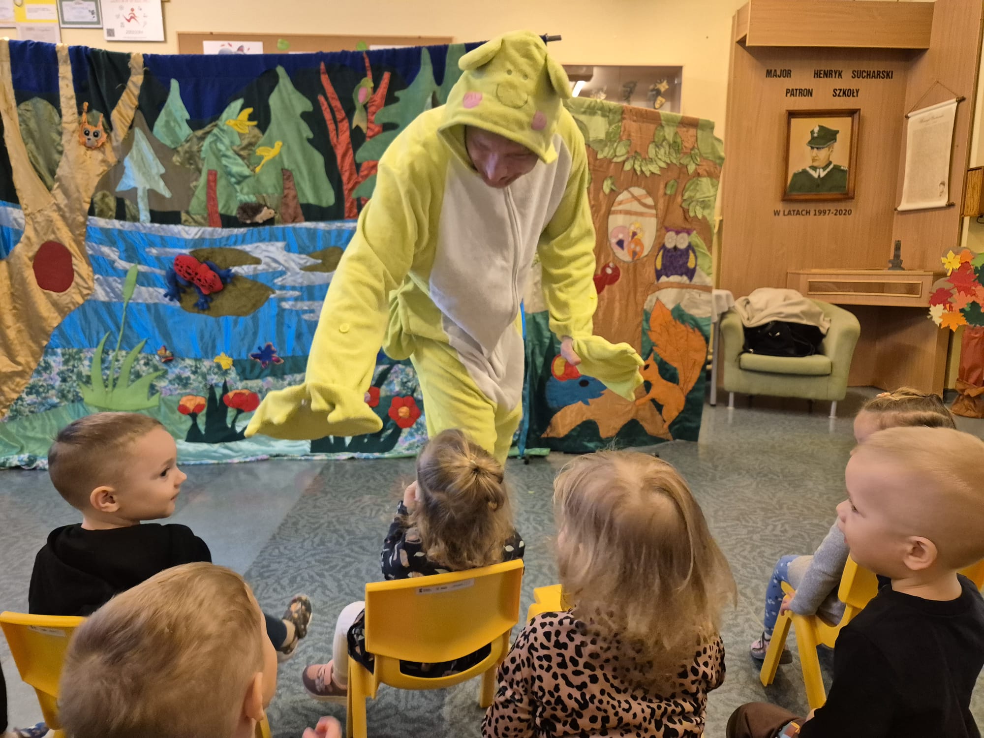Na koniec ochoczo całą grupą zrobiliśmy sobie zdjęcie z Panem Żabą na bajkowym tle.