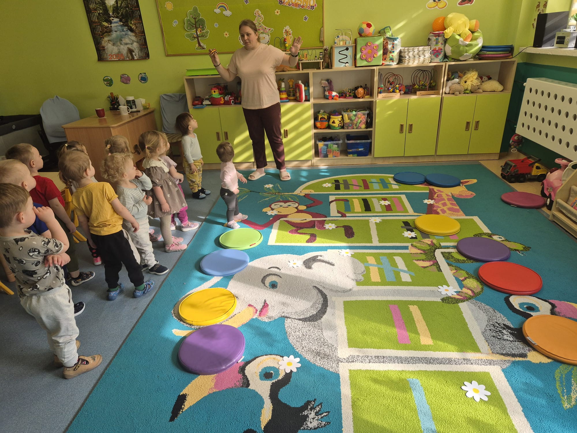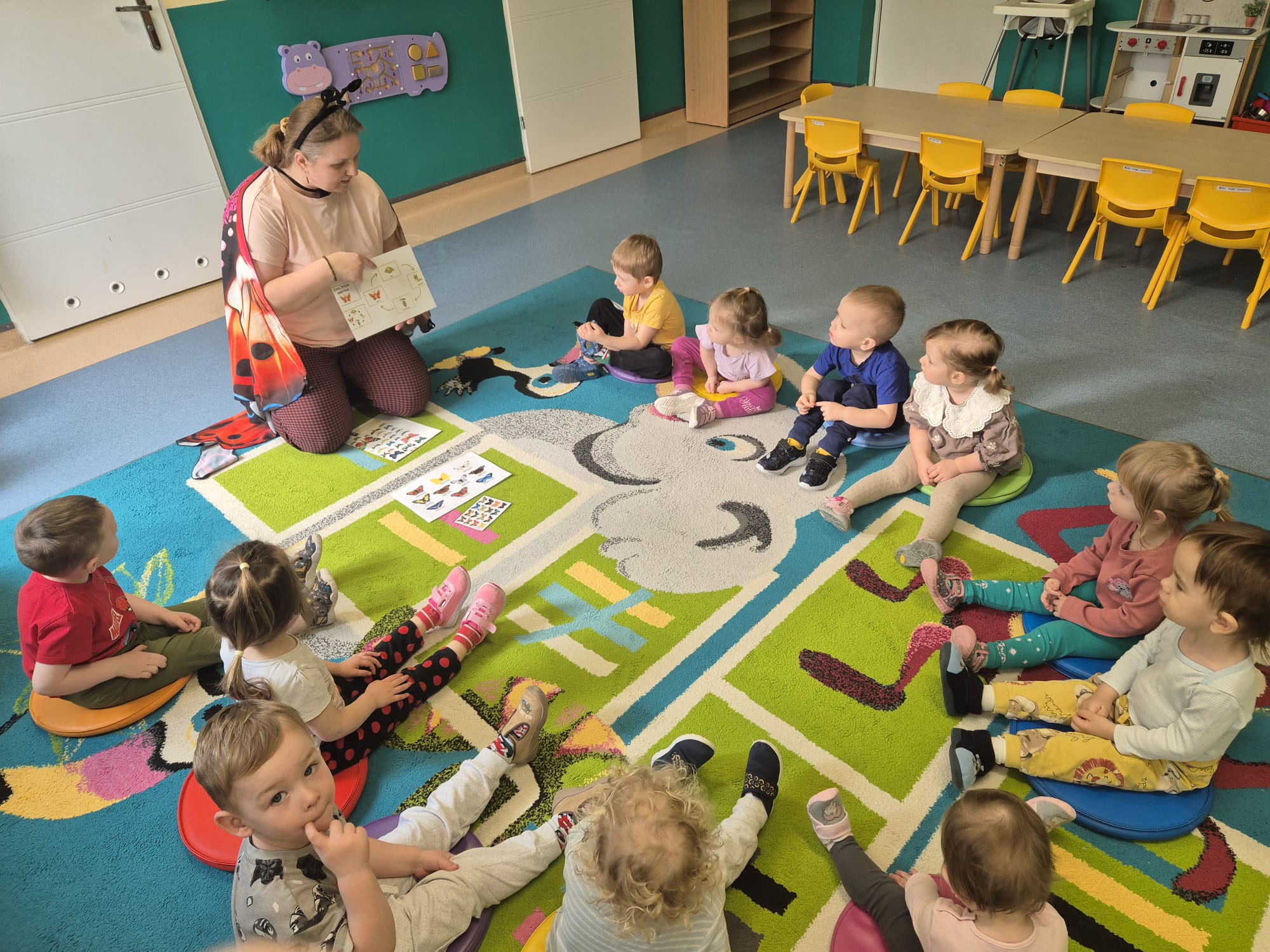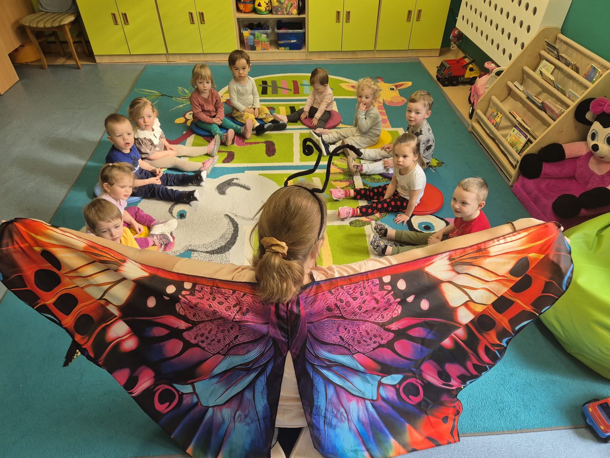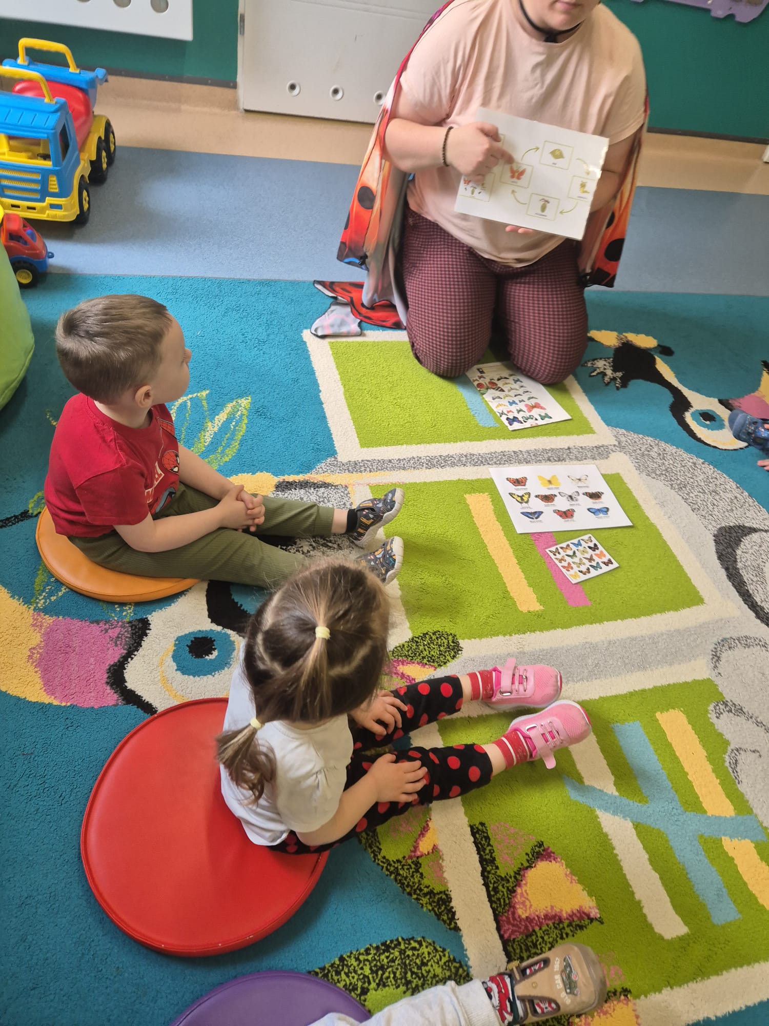 Wszyscy wspólnie bawili się w motylki fruwające po łące. Dzieci poruszały się machając rączkami , gdy opiekunka grała na grzechotce, a gdy instrument ucichł każde dziecko szukało dla sied=bie kwiatuszka spośród rozłożonych na dywanie. Ta zabawa bardzo podobała się dzieciom.