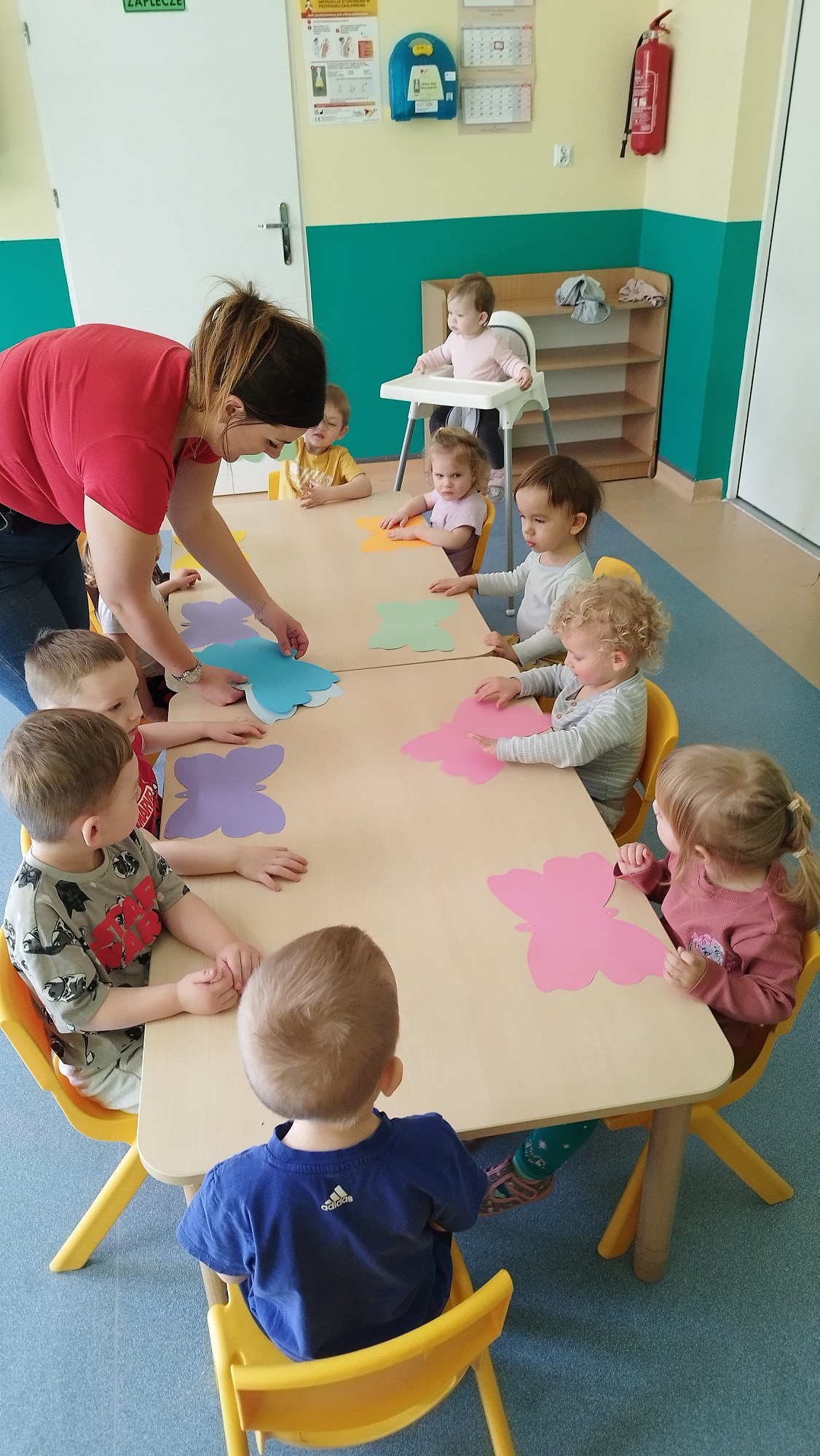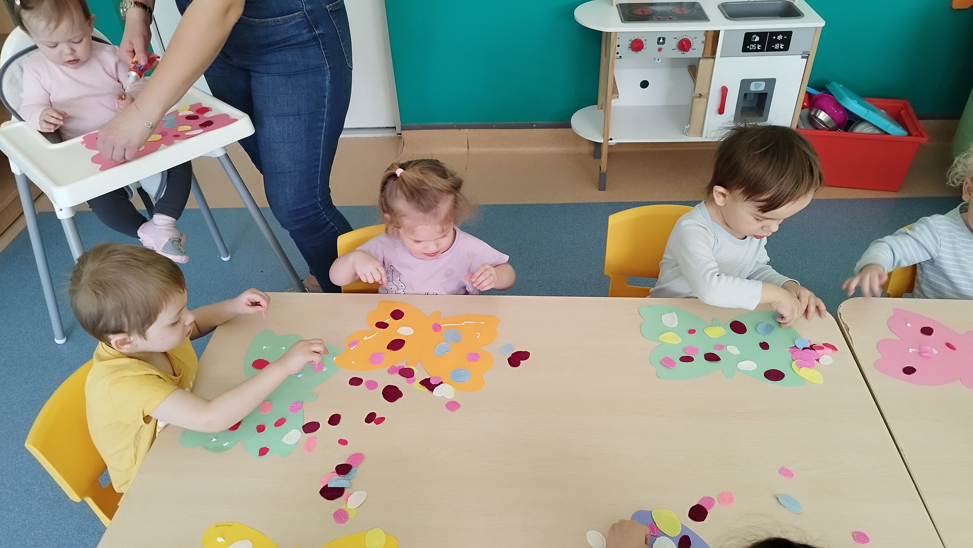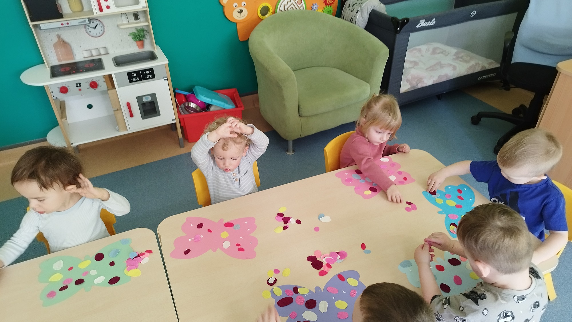 Przy stoliku na maluchy czekała praca plastyczna- wyklejanka. Małe rączki przyklejały kolorowe plamki i naklejki na papierowe skrzydełka motyli.