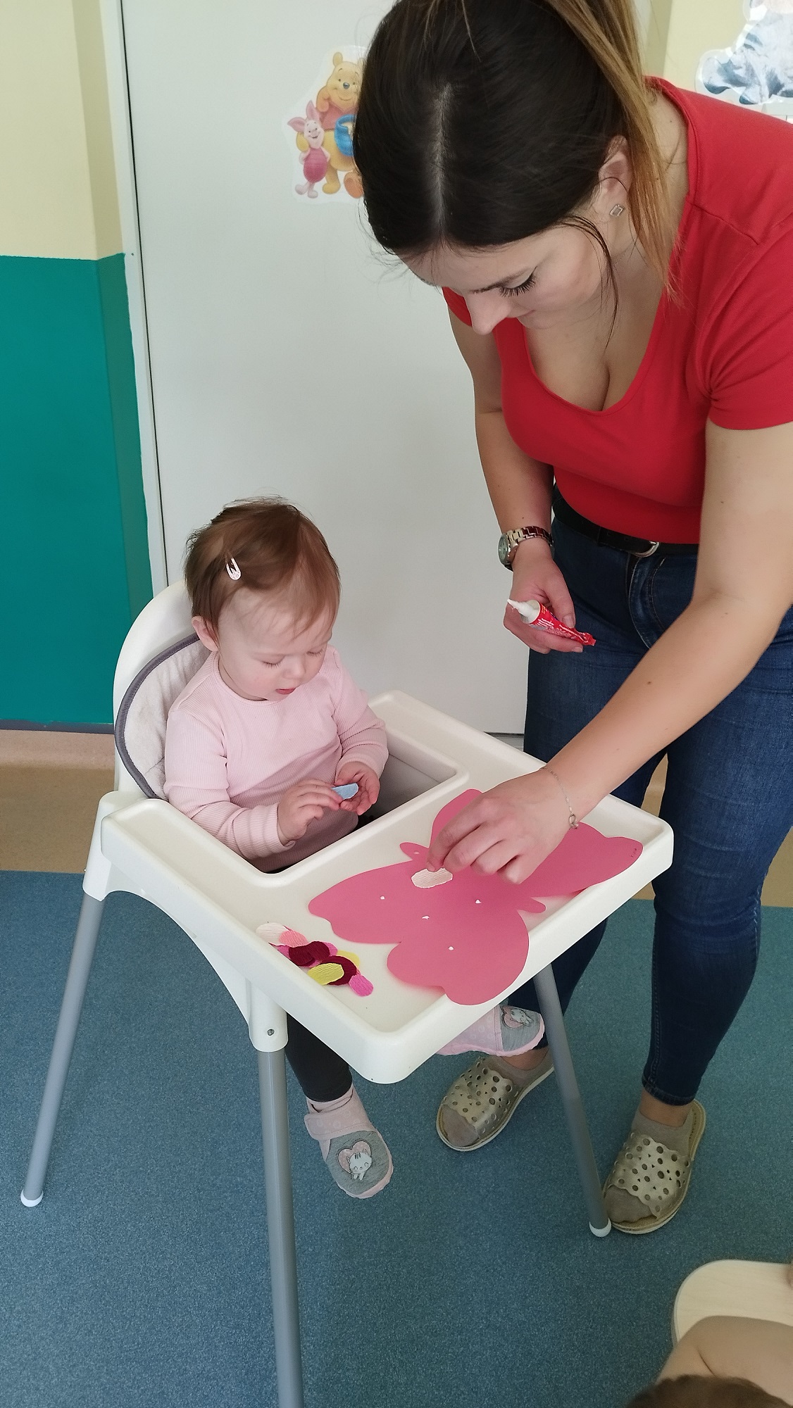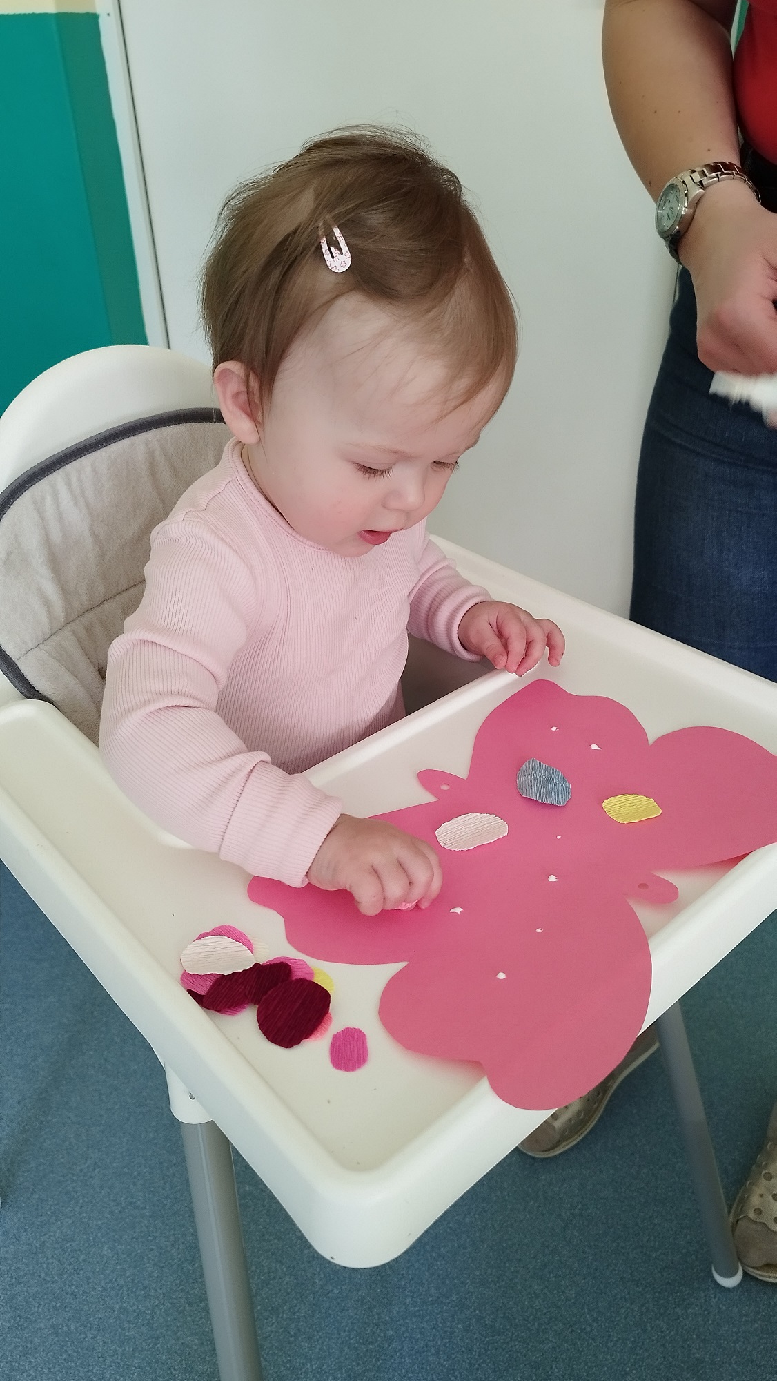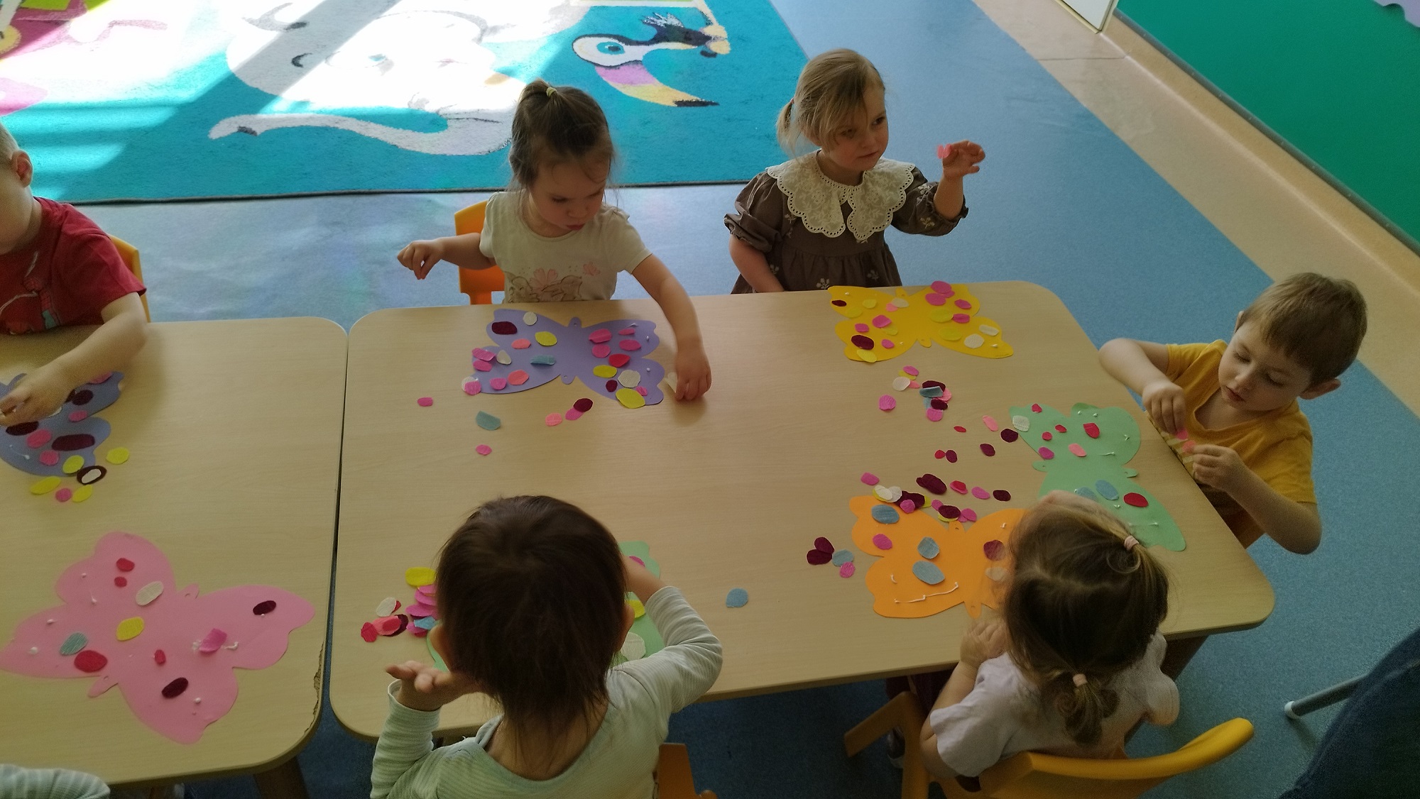 Przy stoliku na maluchy czekała praca plastyczna- wyklejanka. Małe rączki przyklejały kolorowe plamki i naklejki na papierowe skrzydełka motyli.