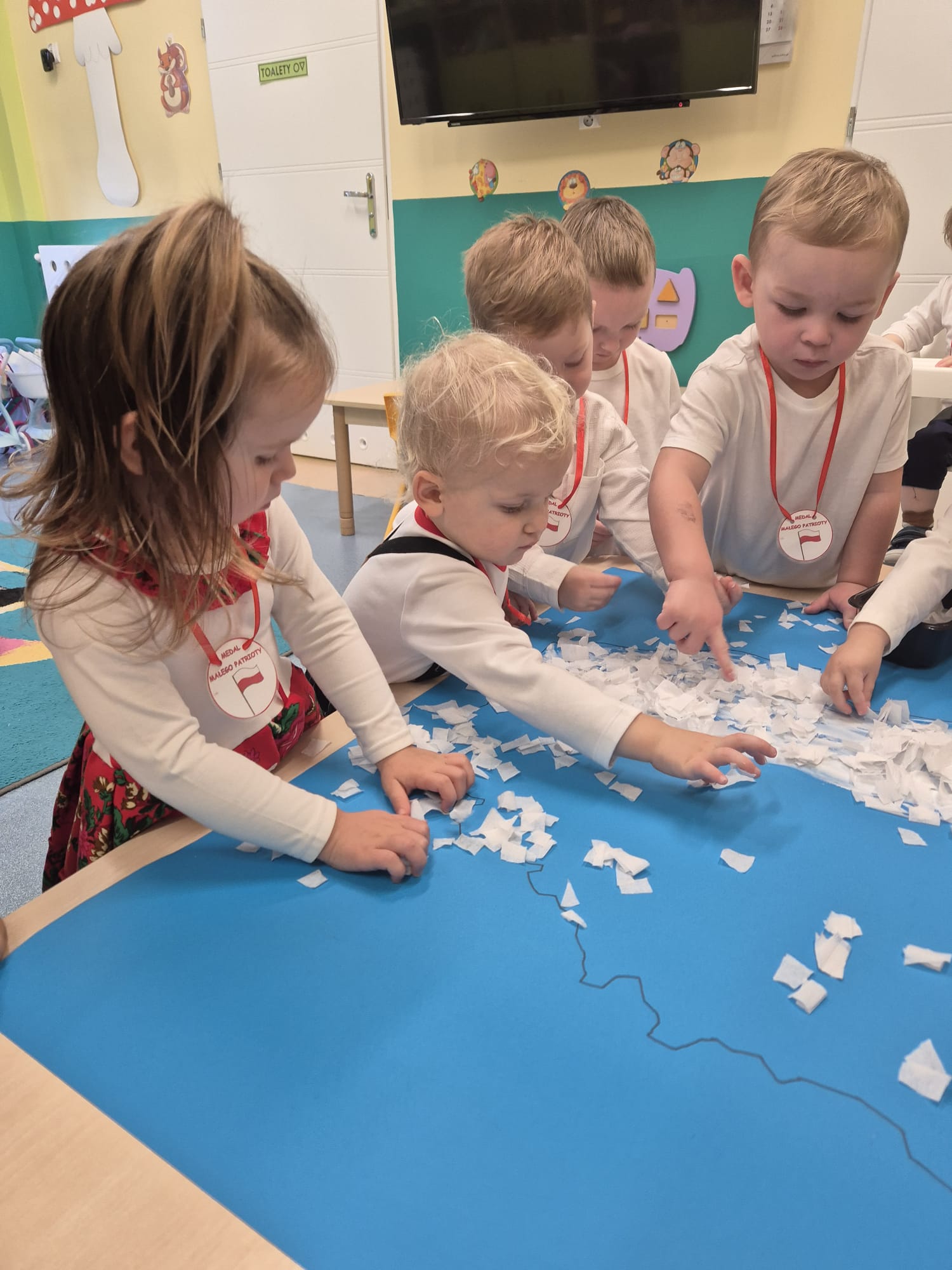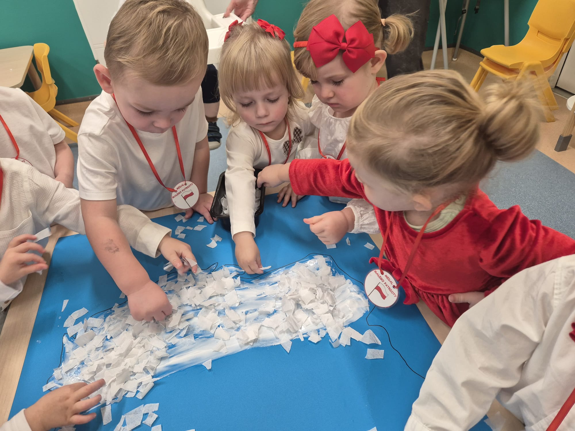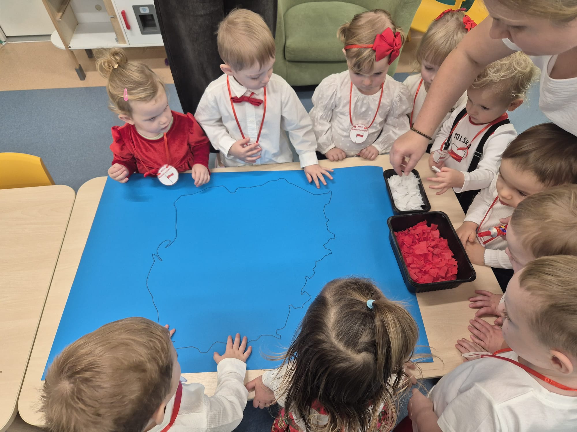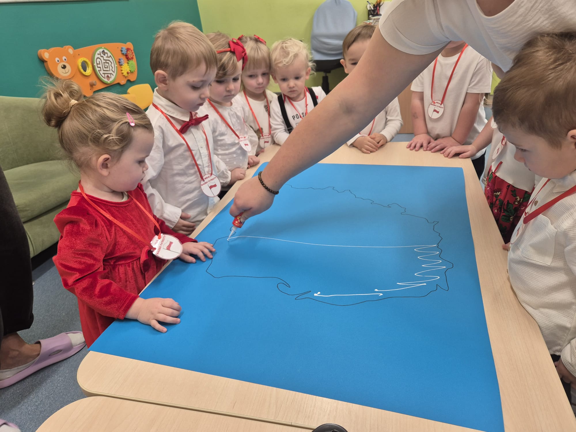 Wszyscy wspólnie wykonaliśmy pracę plastyczną, wyklejając na biało- czerwono kontur mapy Polski.