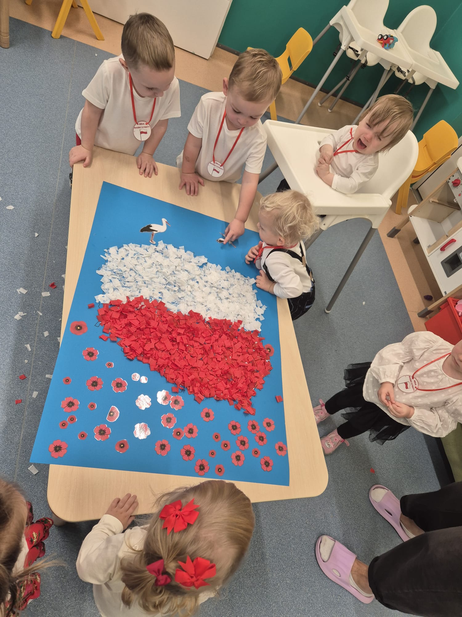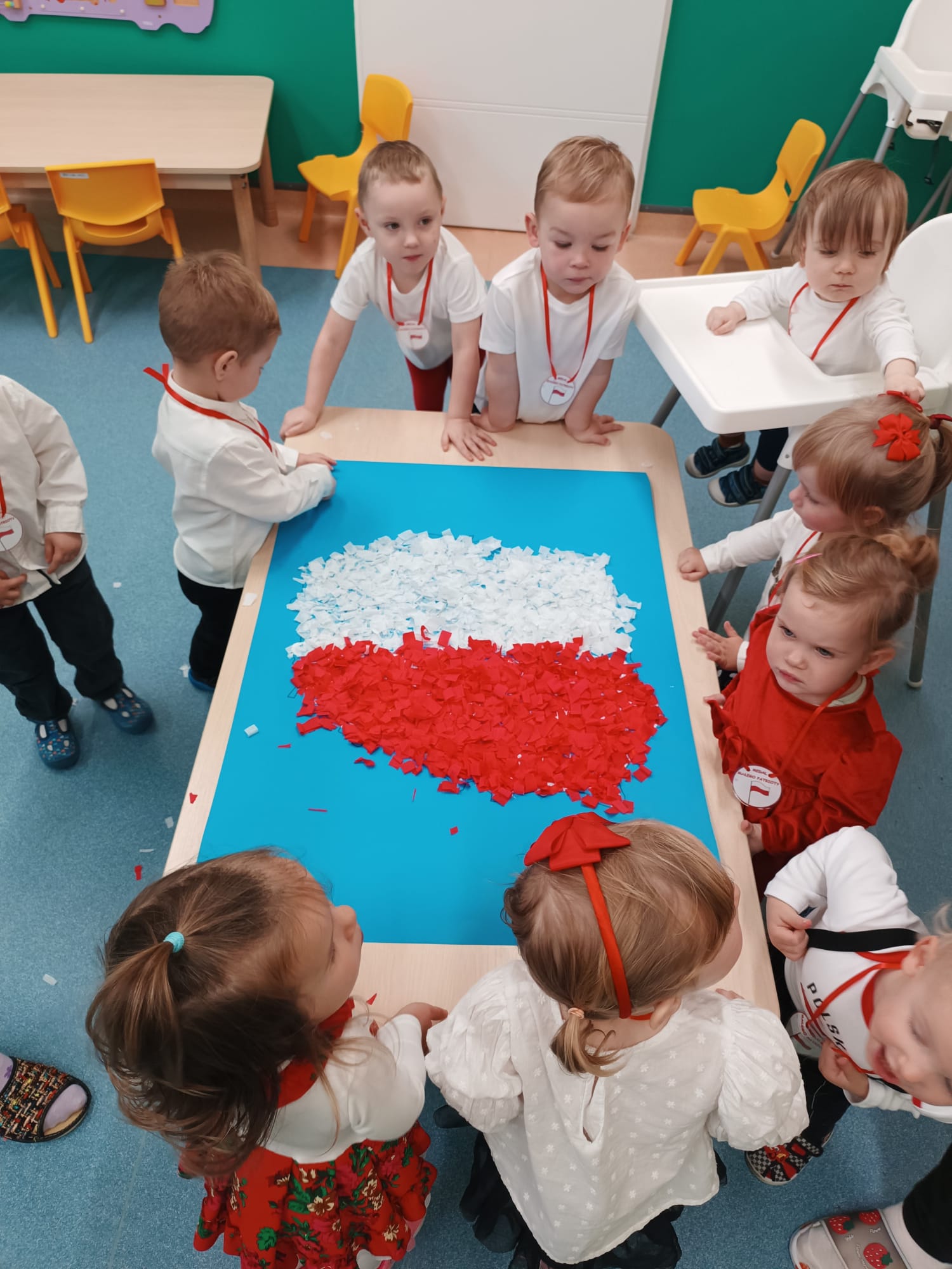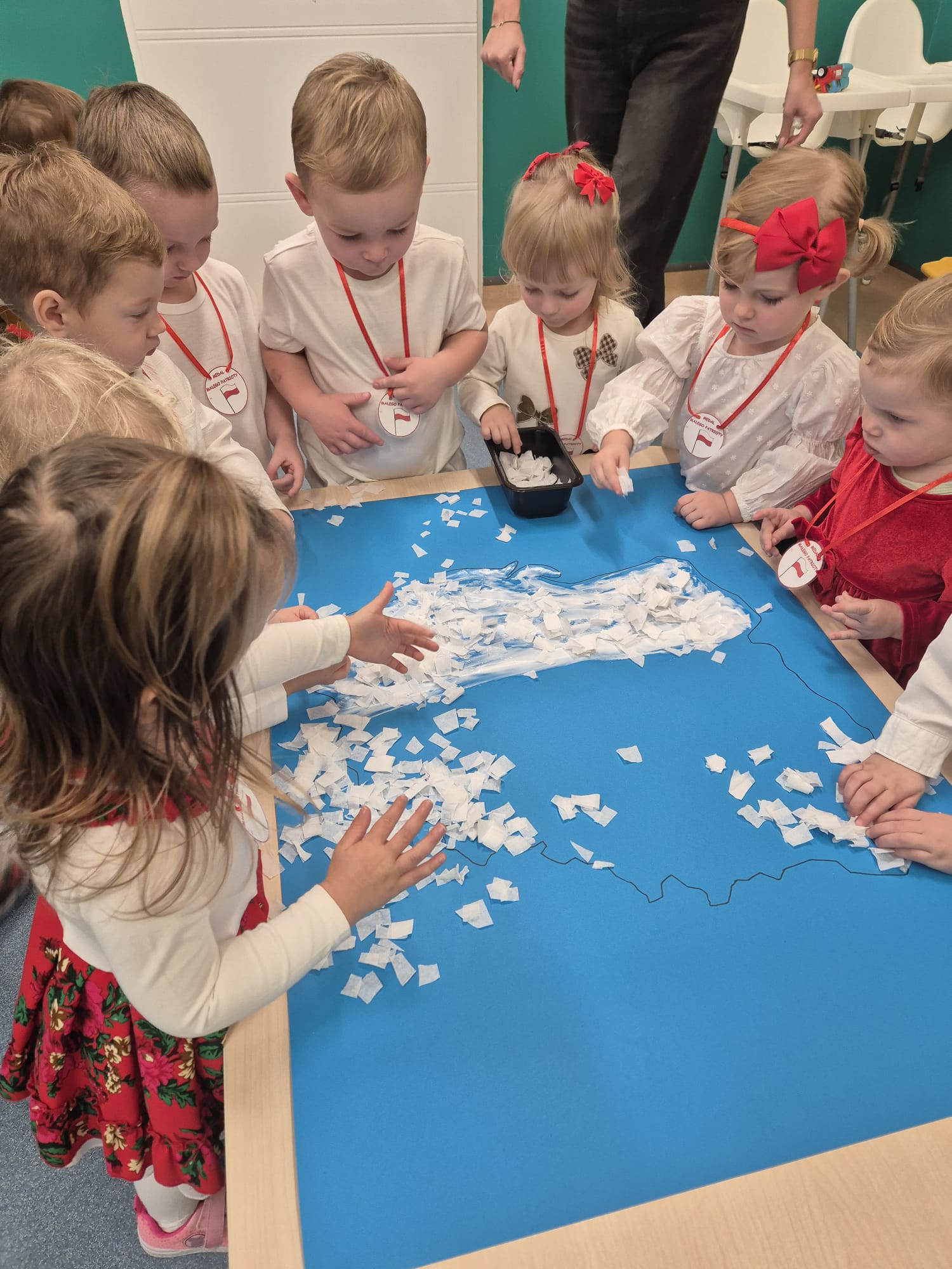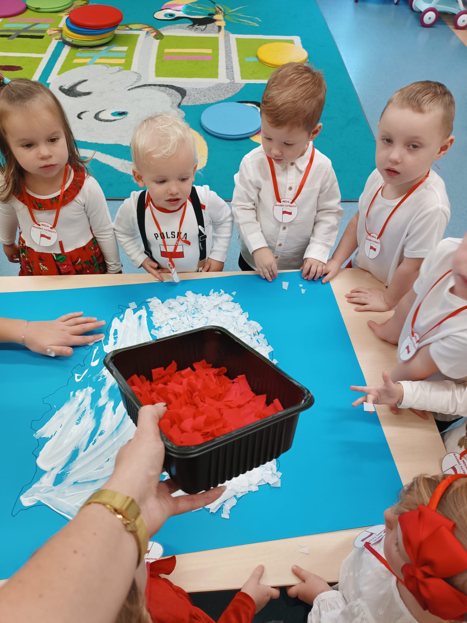 Wszyscy wspólnie wykonaliśmy pracę plastyczną, wyklejając na biało- czerwono kontur mapy Polski.