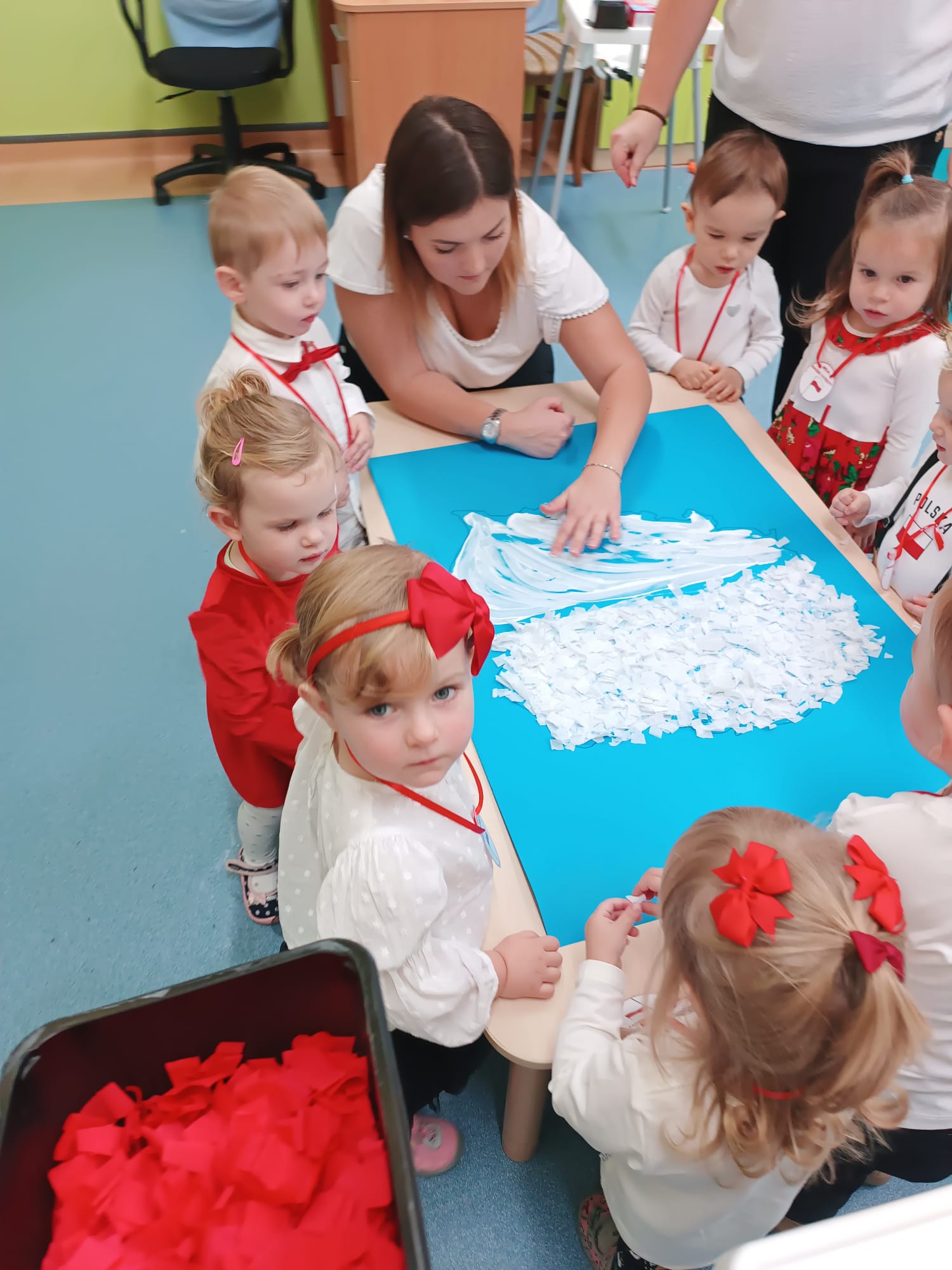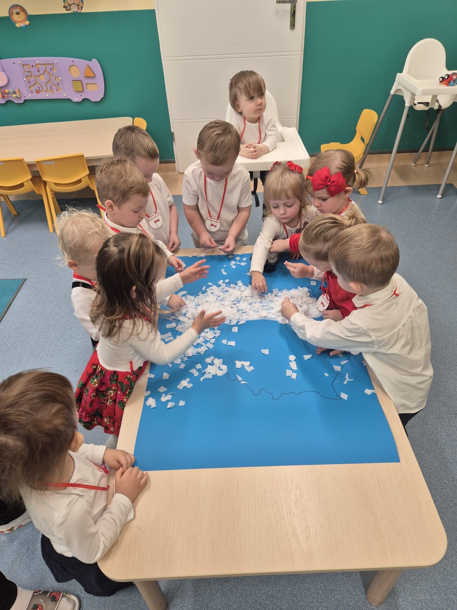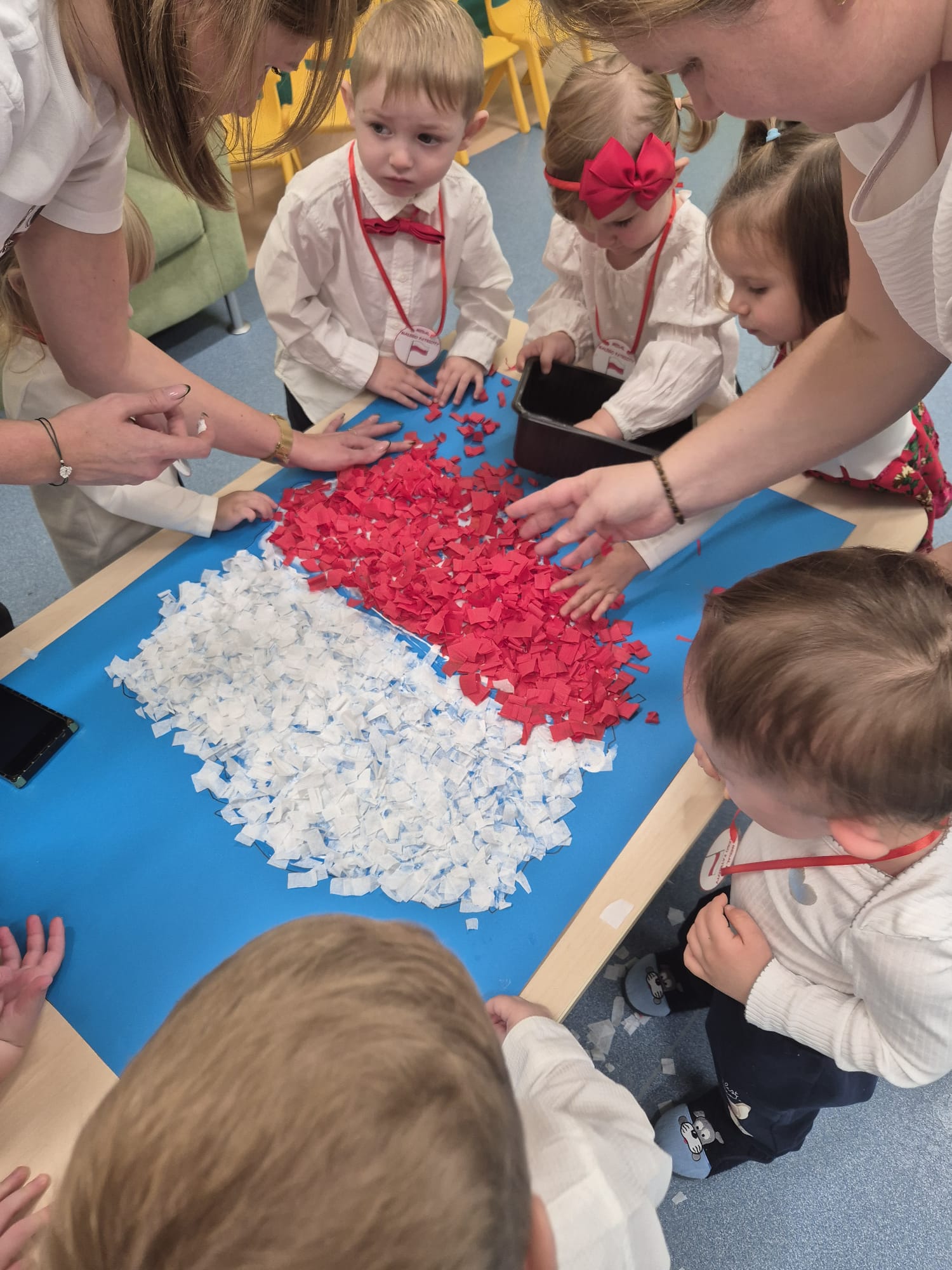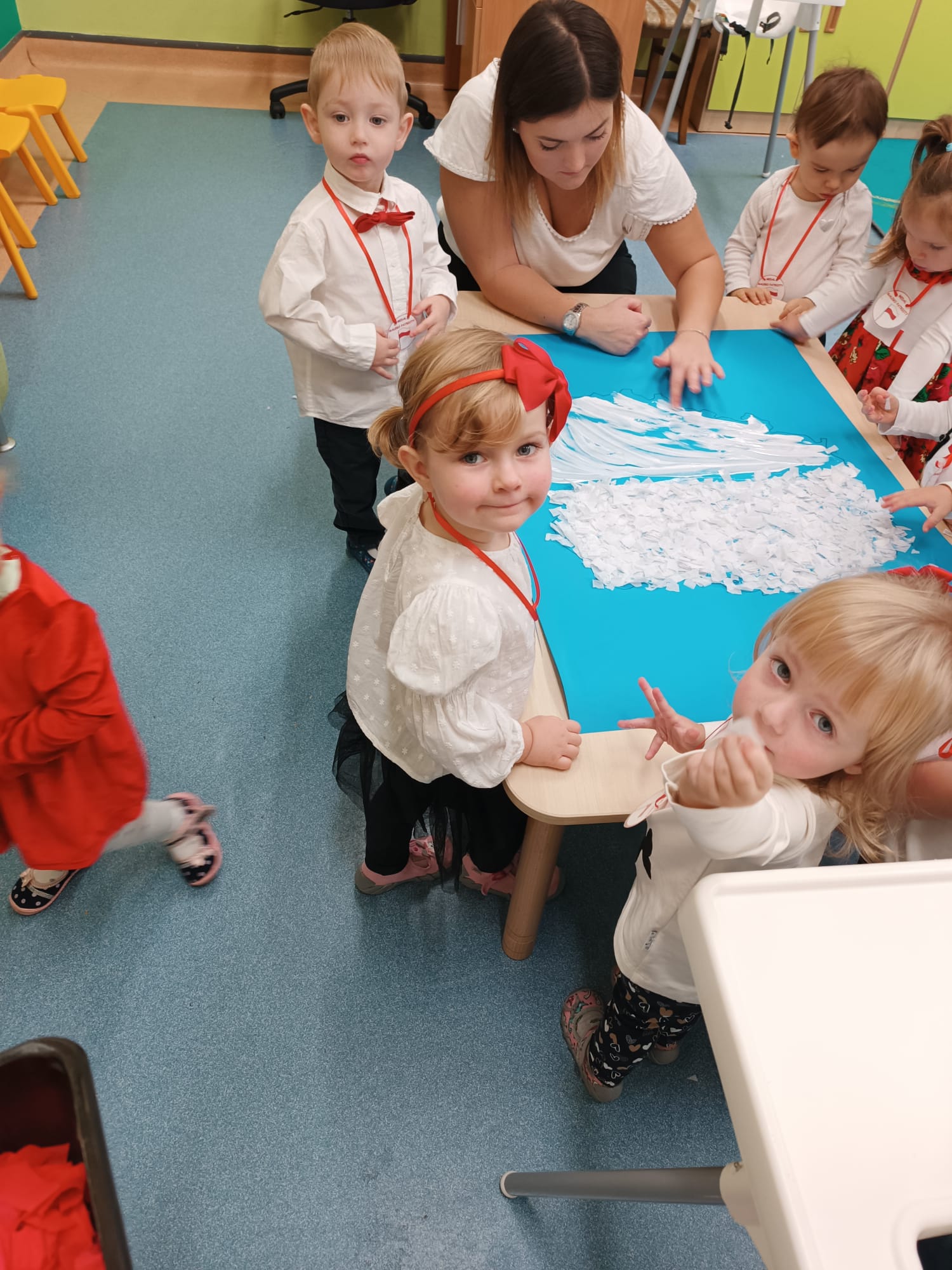 Wszyscy wspólnie wykonaliśmy pracę plastyczną, wyklejając na biało- czerwono kontur mapy Polski.
