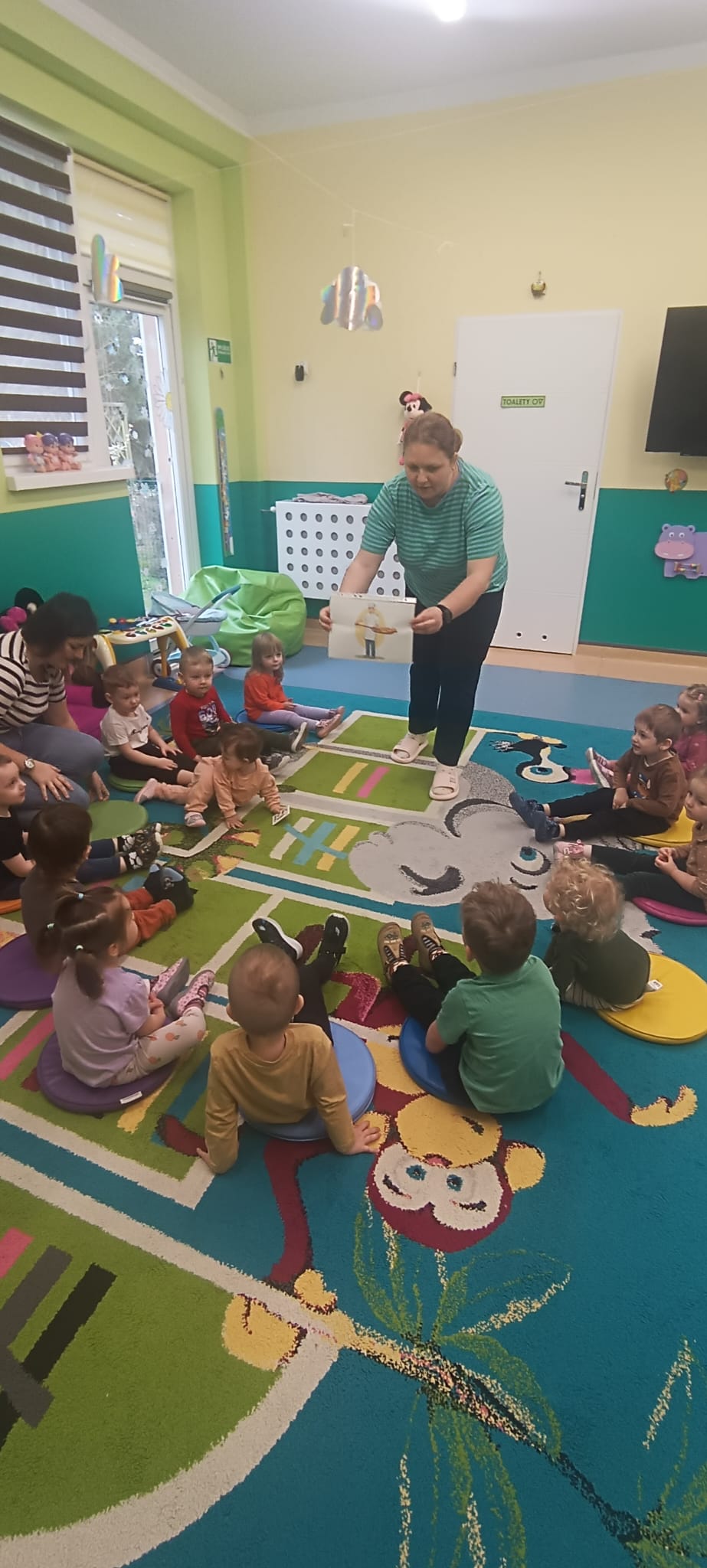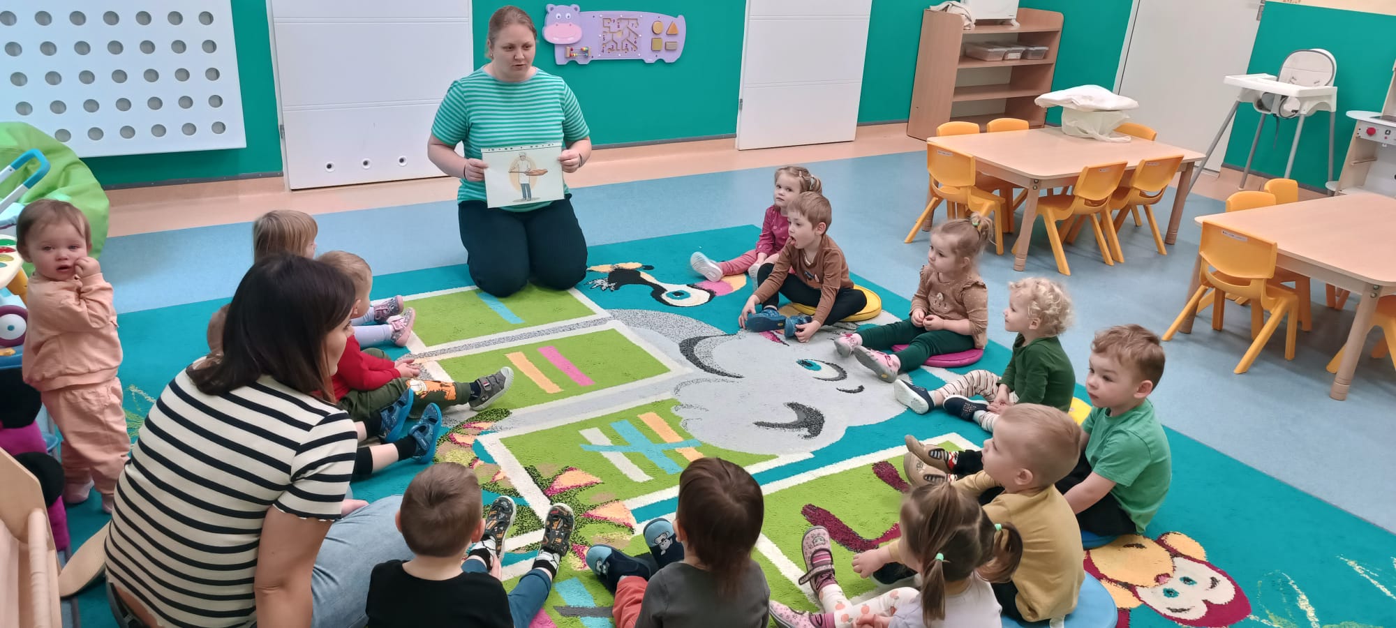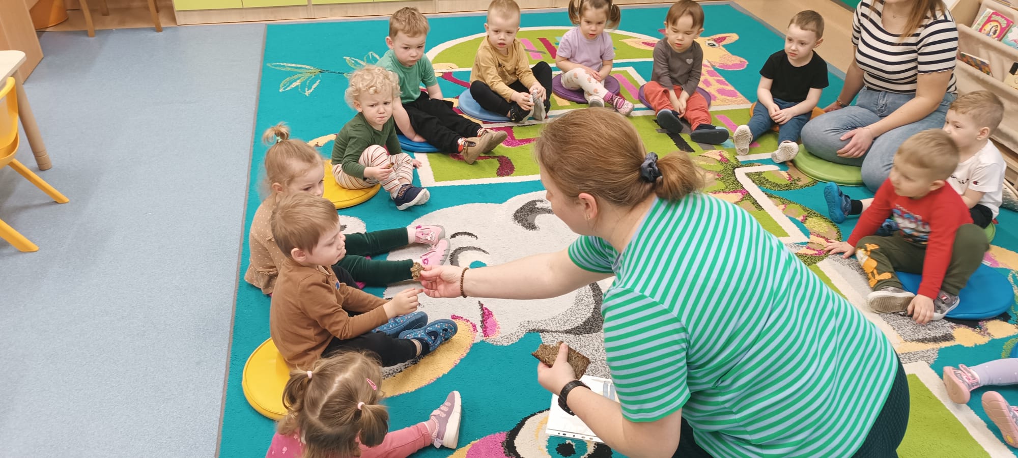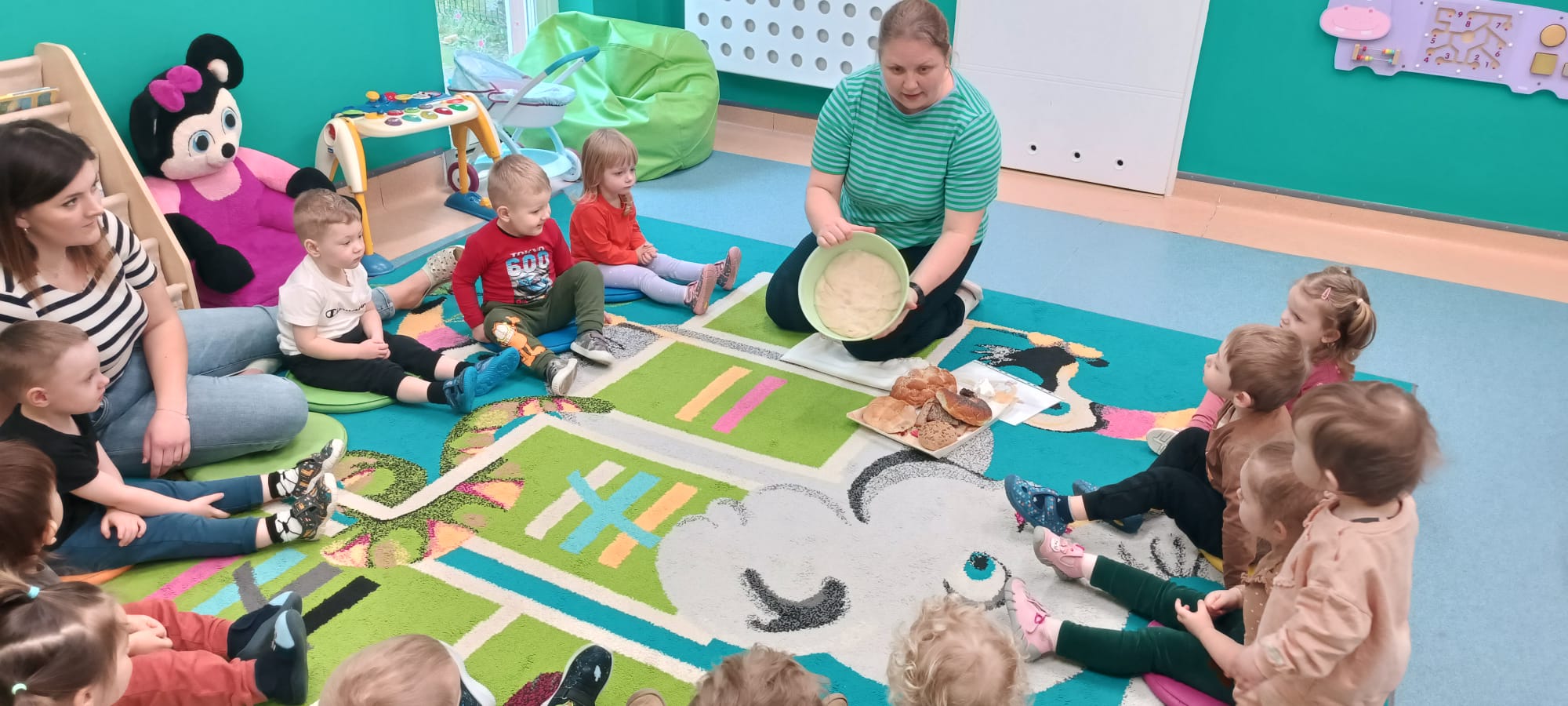 Po umyciu rączek na dywanie dzieci z ciociami bawili się przy piosence "Mało nas do pieczenia chleba".