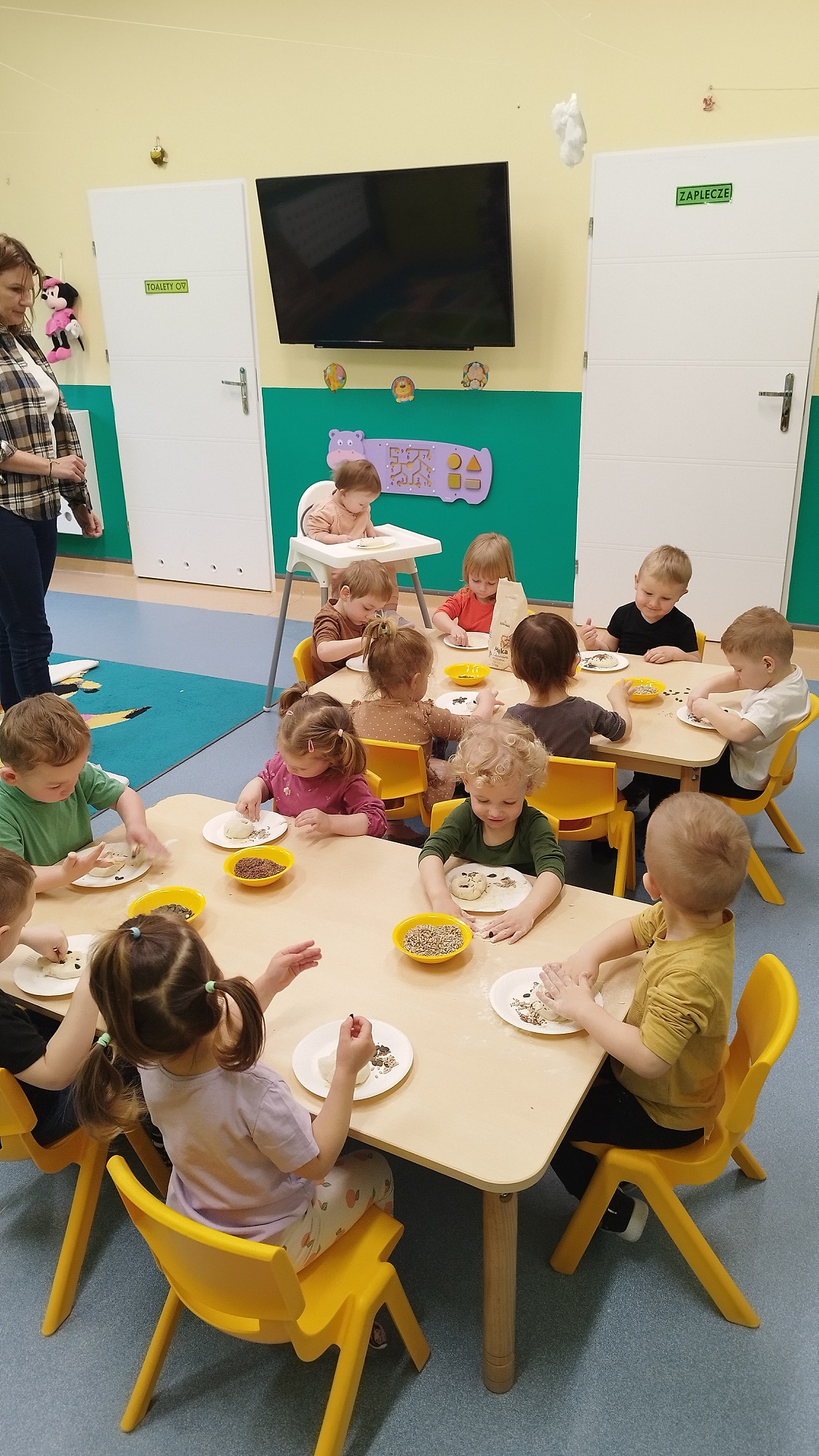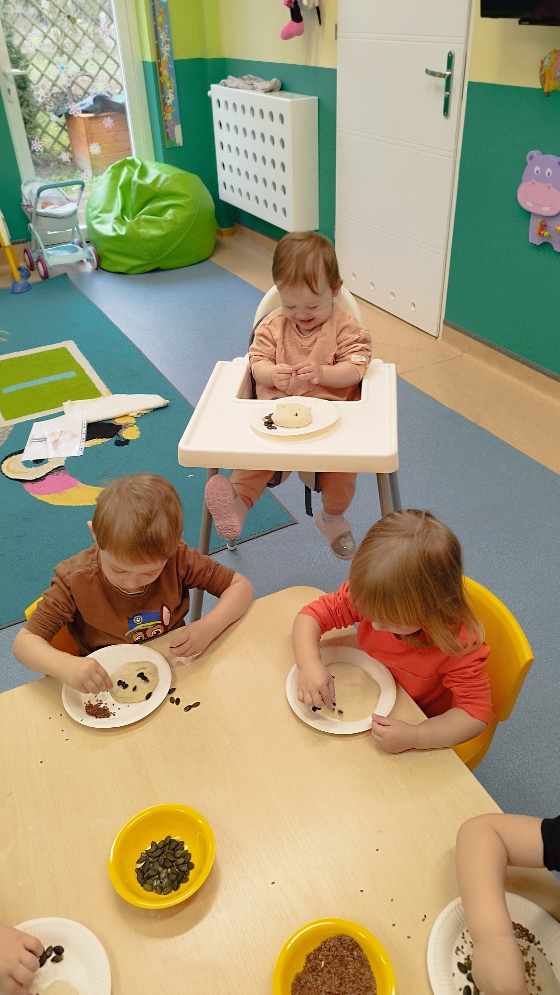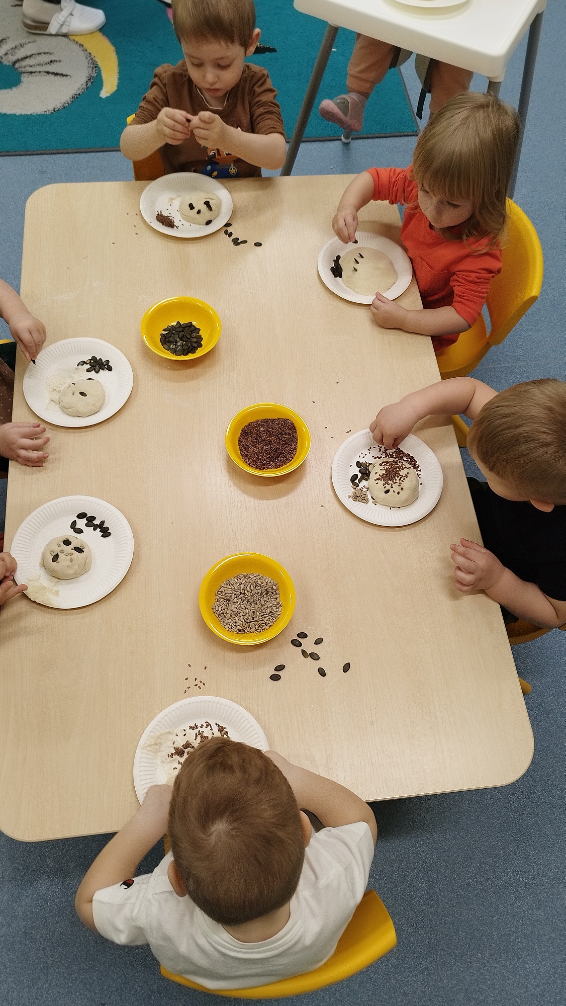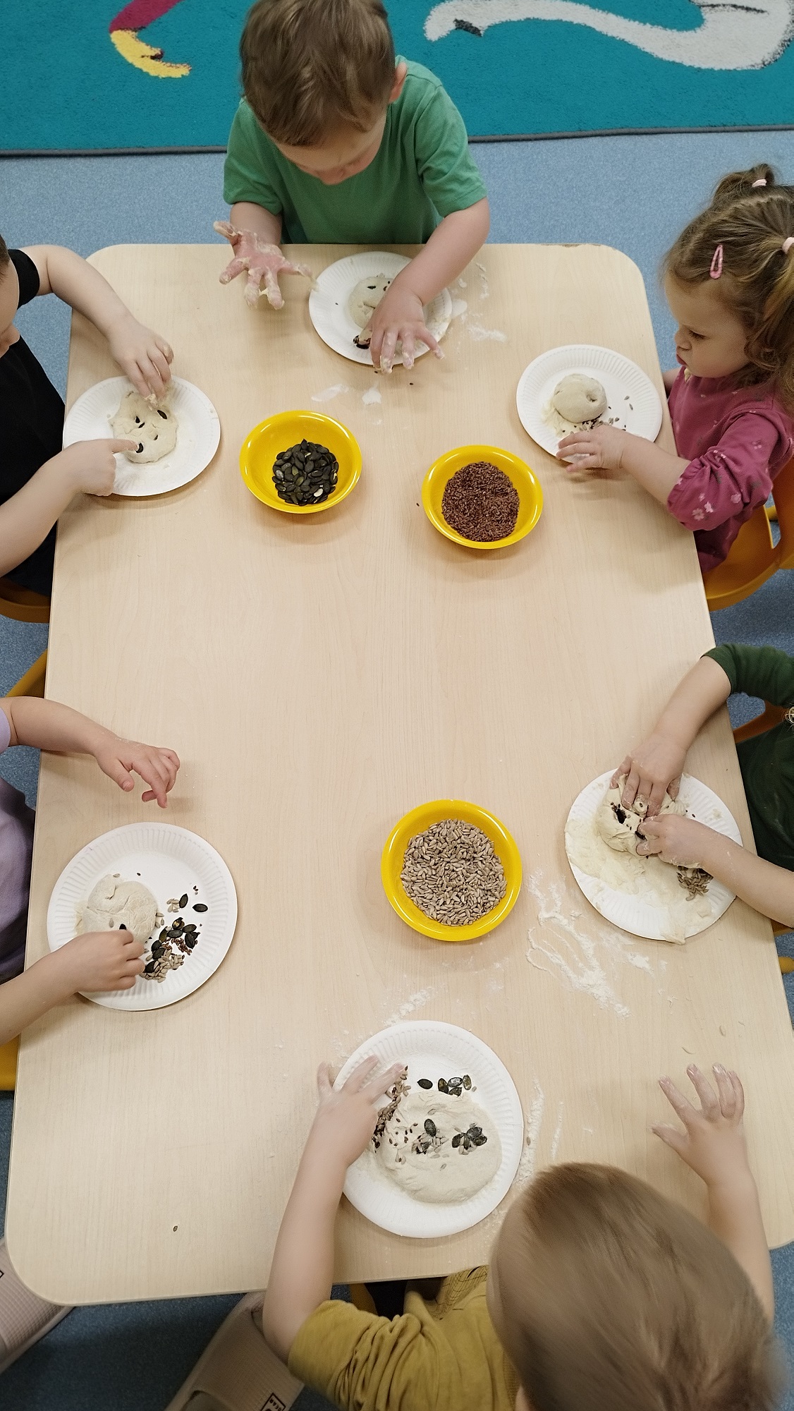 W wielkiej misce ciocia pokazała ciasto, które podzieliła na kawałki i każde dziecko swój kawałek mogło pougniatać ,poklepać, a następnie powbijać w niego przygotowane pestki: dyni, słonecznika i siemienia lnianego.