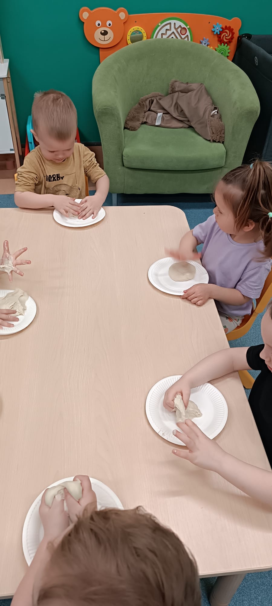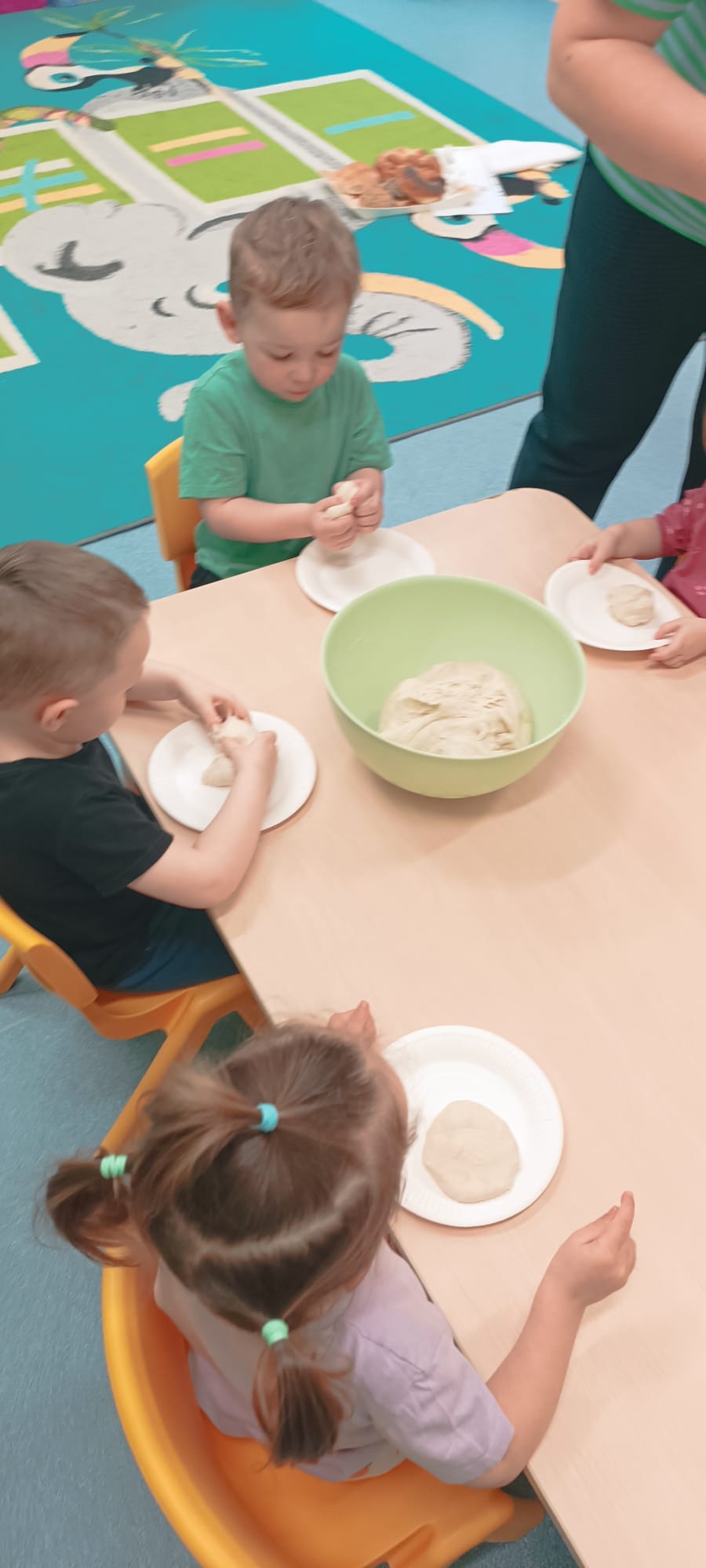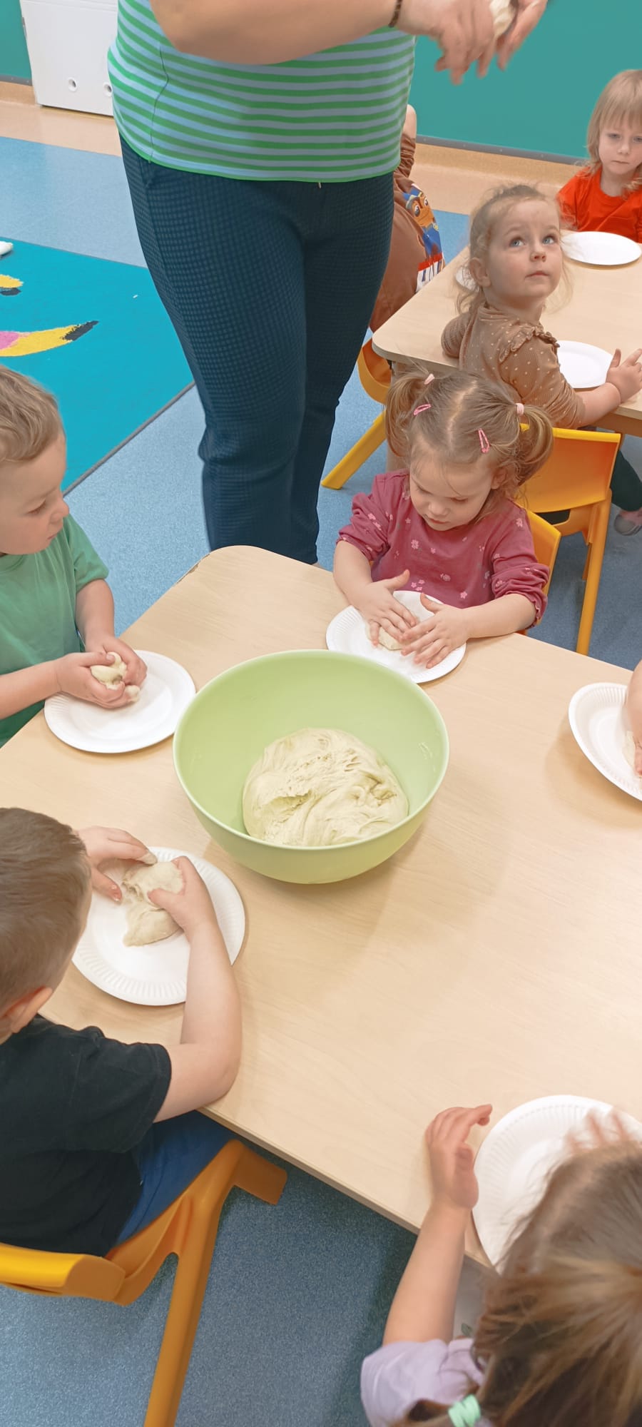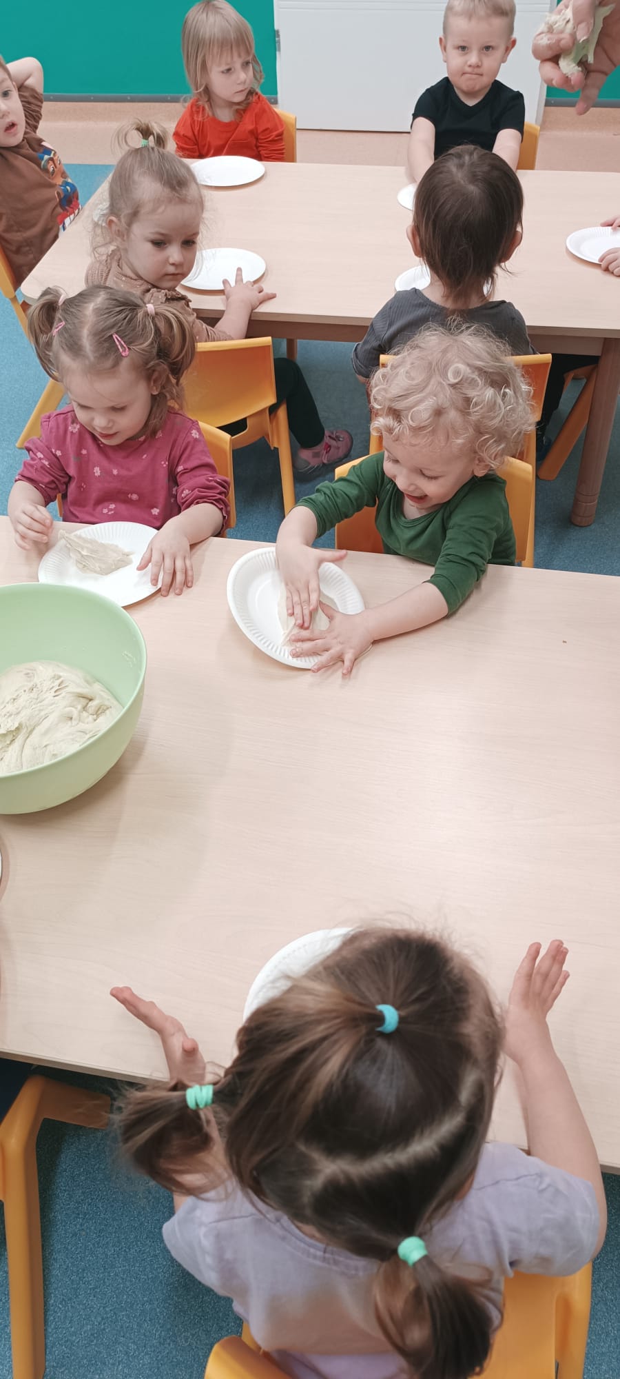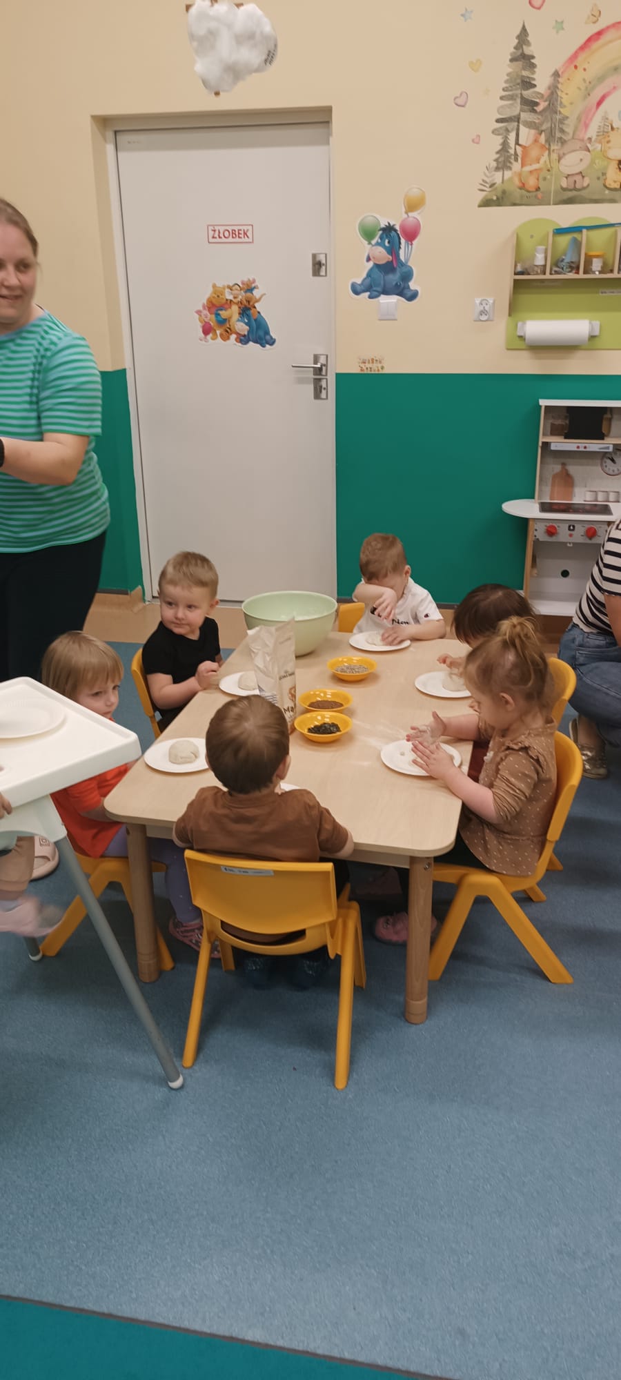 W wielkiej misce ciocia pokazała ciasto, które podzieliła na kawałki i każde dziecko swój kawałek mogło pougniatać ,poklepać, a następnie powbijać w niego przygotowane pestki: dyni, słonecznika i siemienia lnianego.