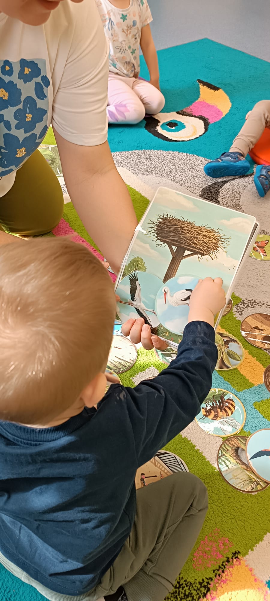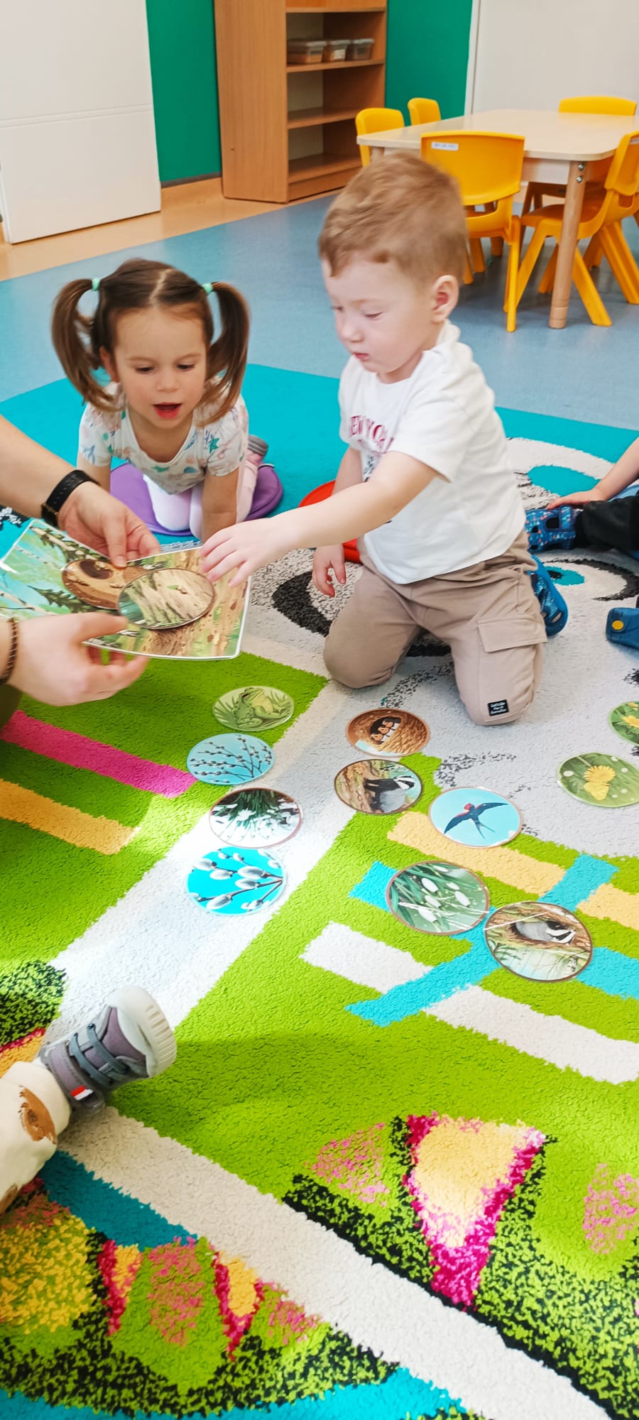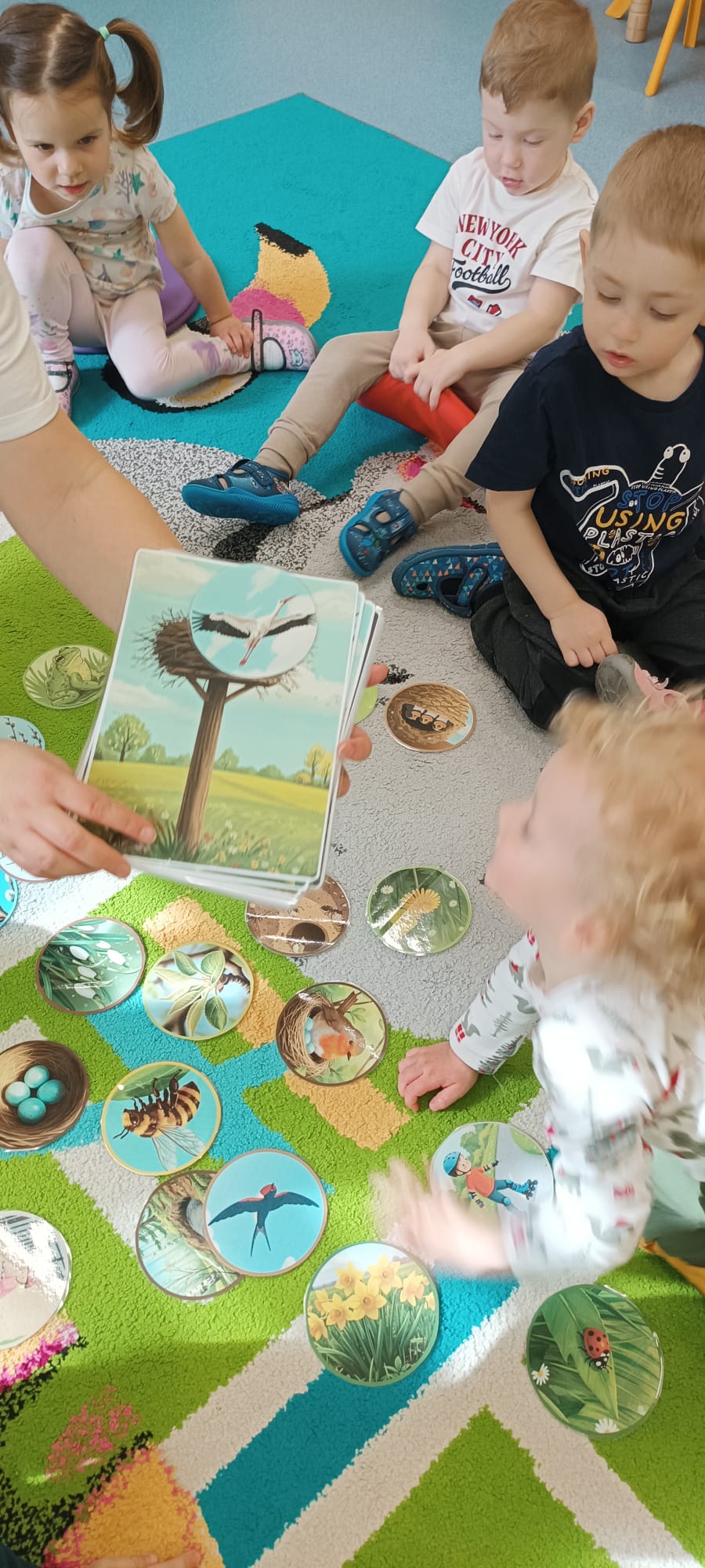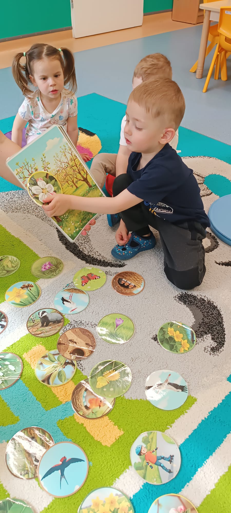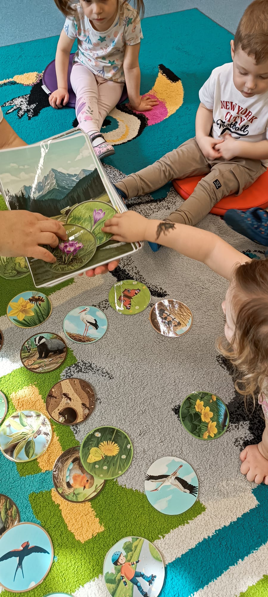Maluchy poznały też sygnały przyrody zapowiadające przyjście wiosny. Małym testem była zabawa - dzieci szukały spośród rozsypanych na dywanie obrazków, tych które pasują do pokazywanego przez ciocię. Dzieci świetnie wykonały to zadanie.