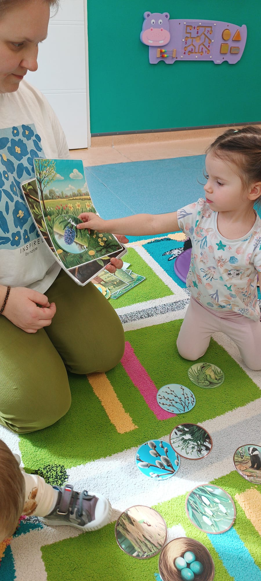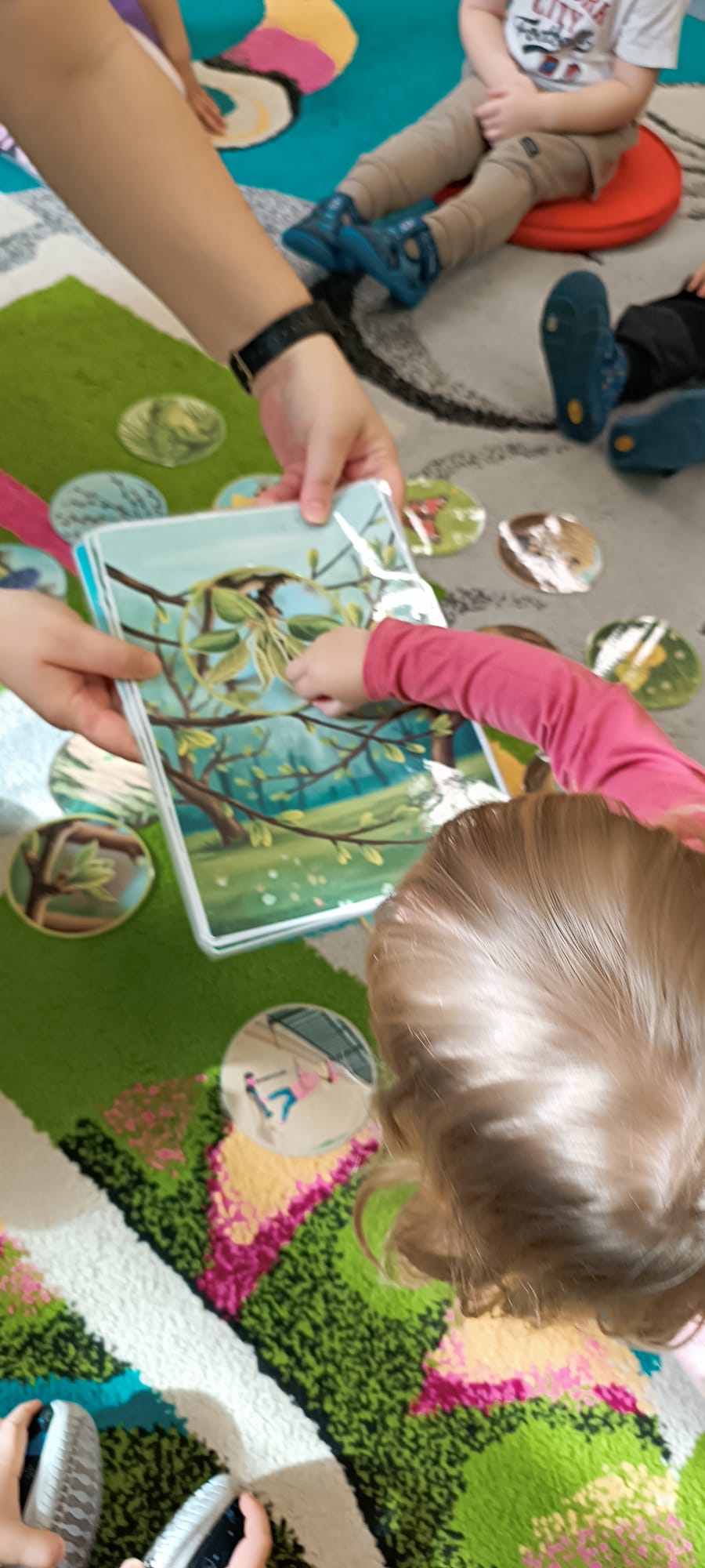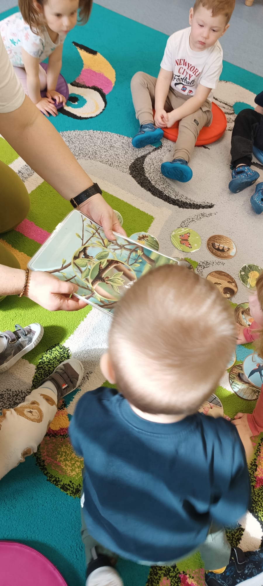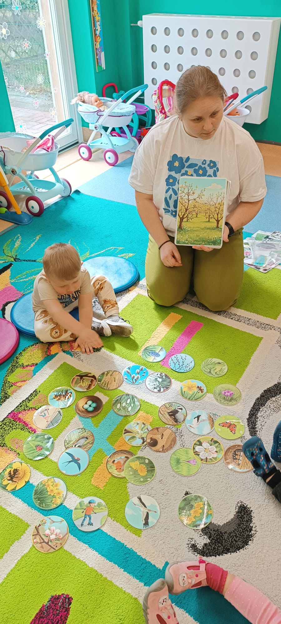 Maluchy poznały też sygnały przyrody zapowiadające przyjście wiosny. Małym testem była zabawa - dzieci szukały spośród rozsypanych na dywanie obrazków, tych które pasują do pokazywanego przez ciocię. Dzieci świetnie wykonały to zadanie.