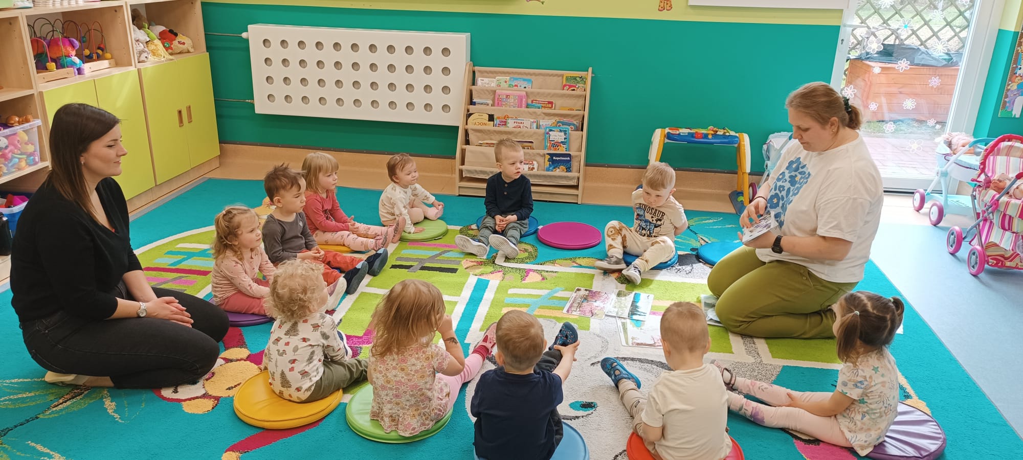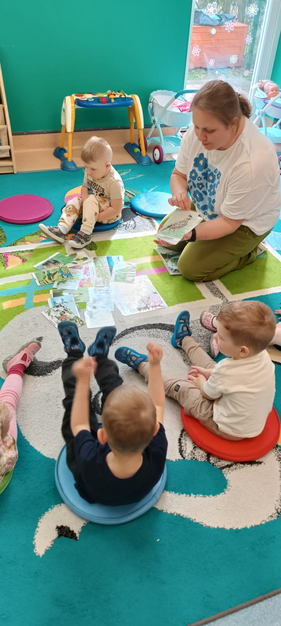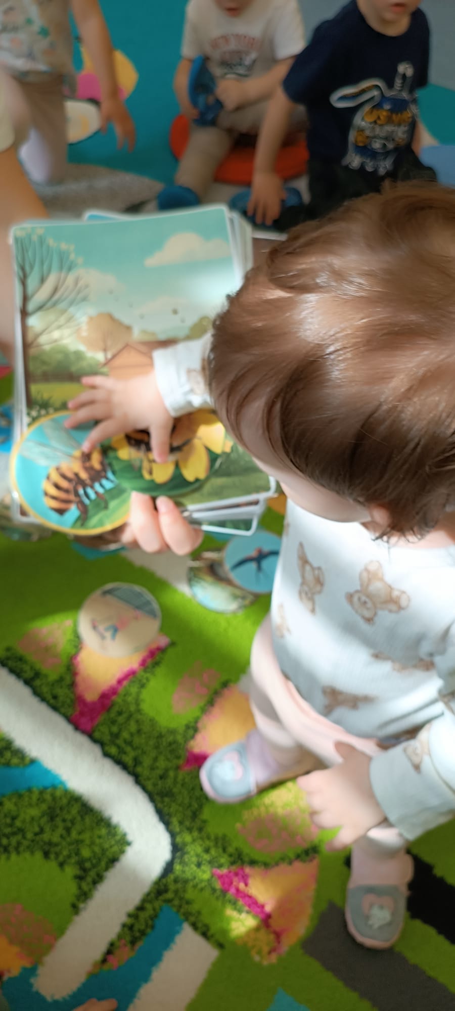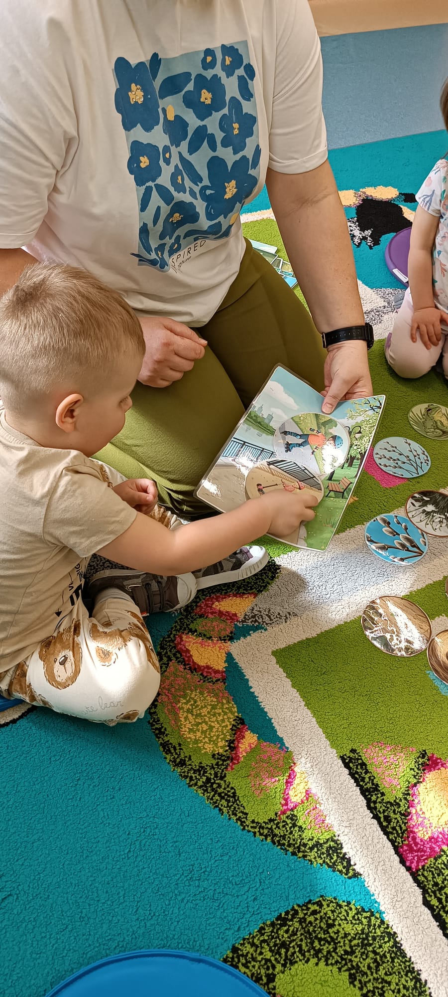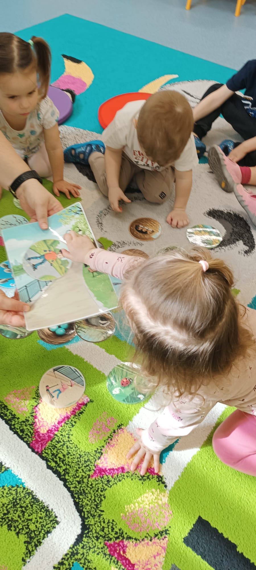Maluchy poznały też sygnały przyrody zapowiadające przyjście wiosny. Małym testem była zabawa - dzieci szukały spośród rozsypanych na dywanie obrazków, tych które pasują do pokazywanego przez ciocię. Dzieci świetnie wykonały to zadanie.