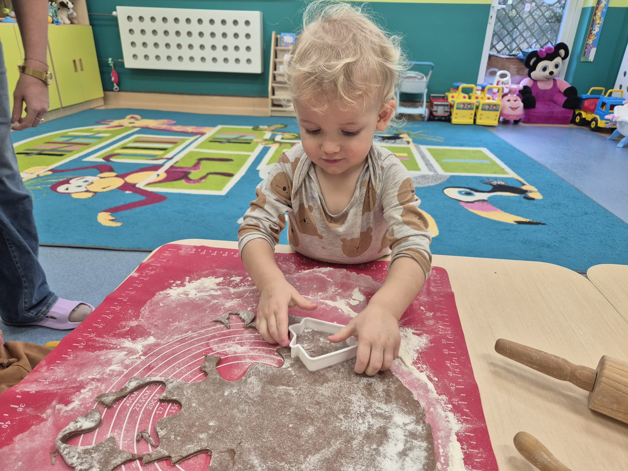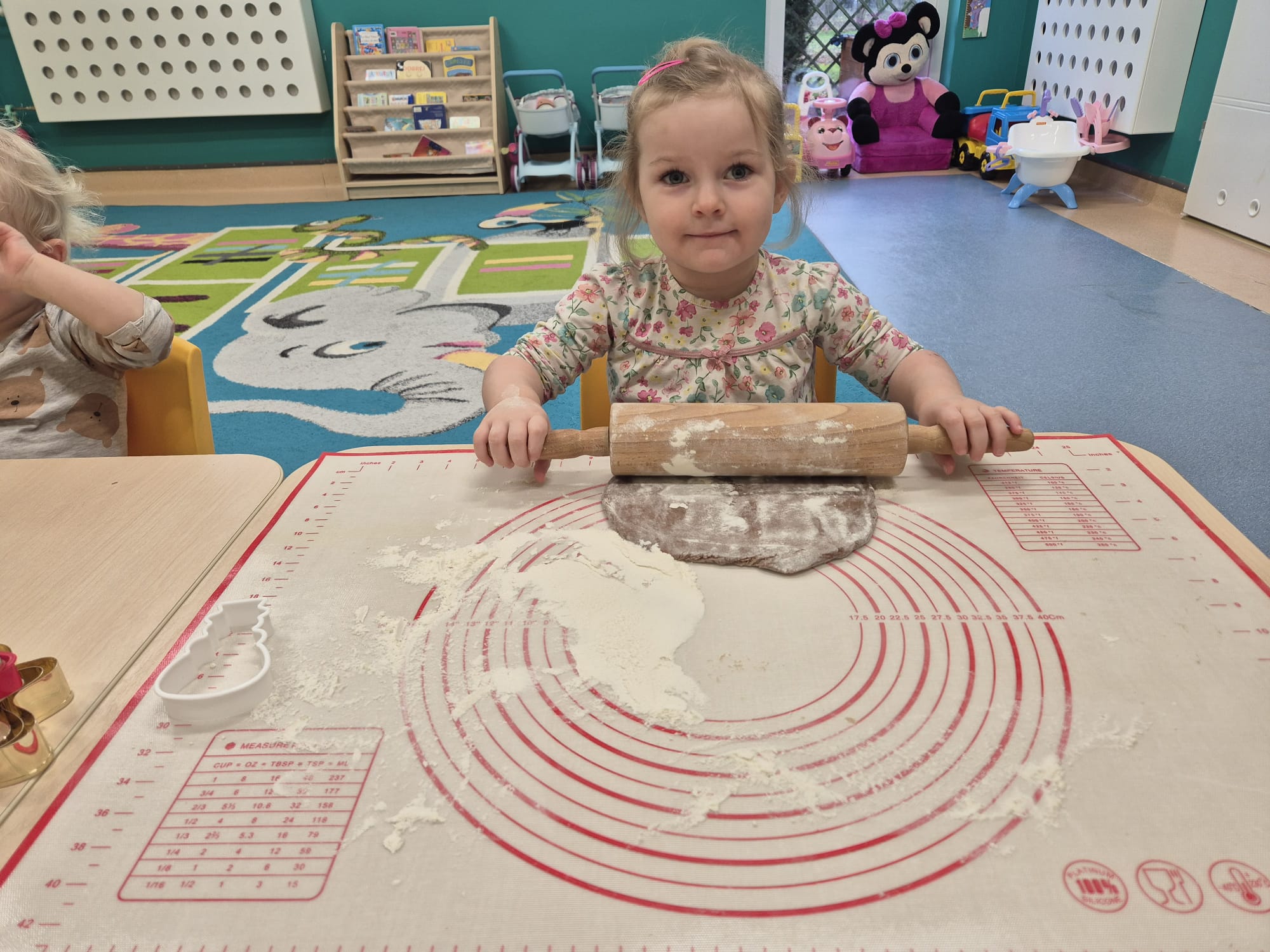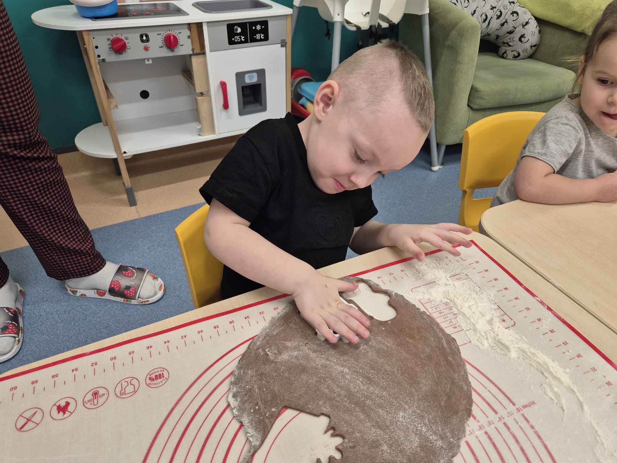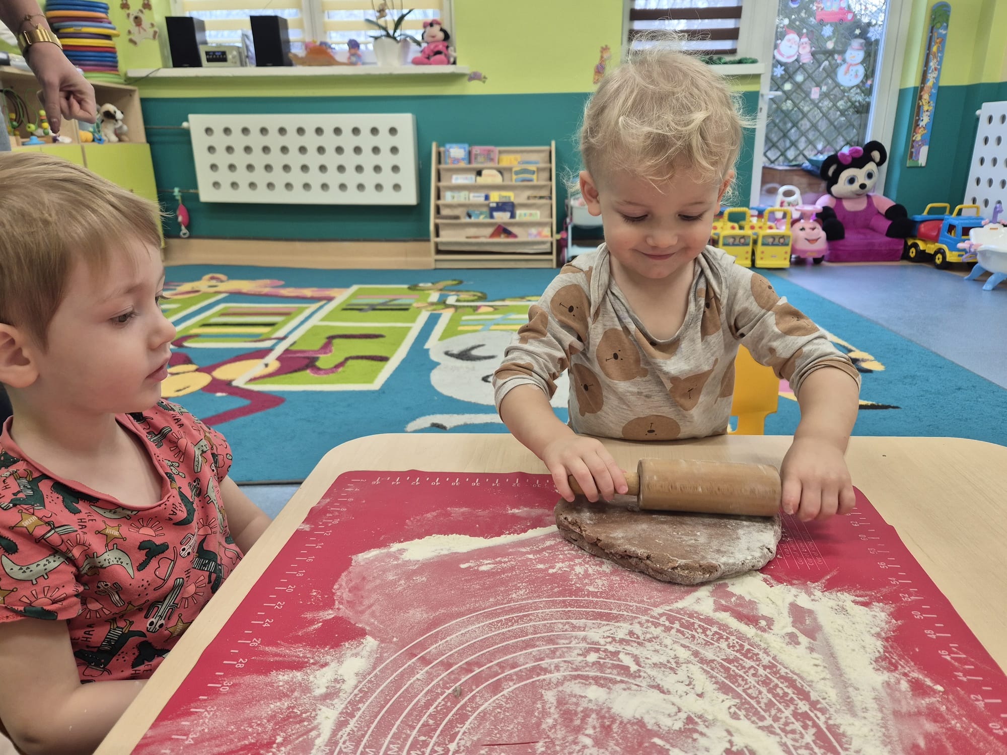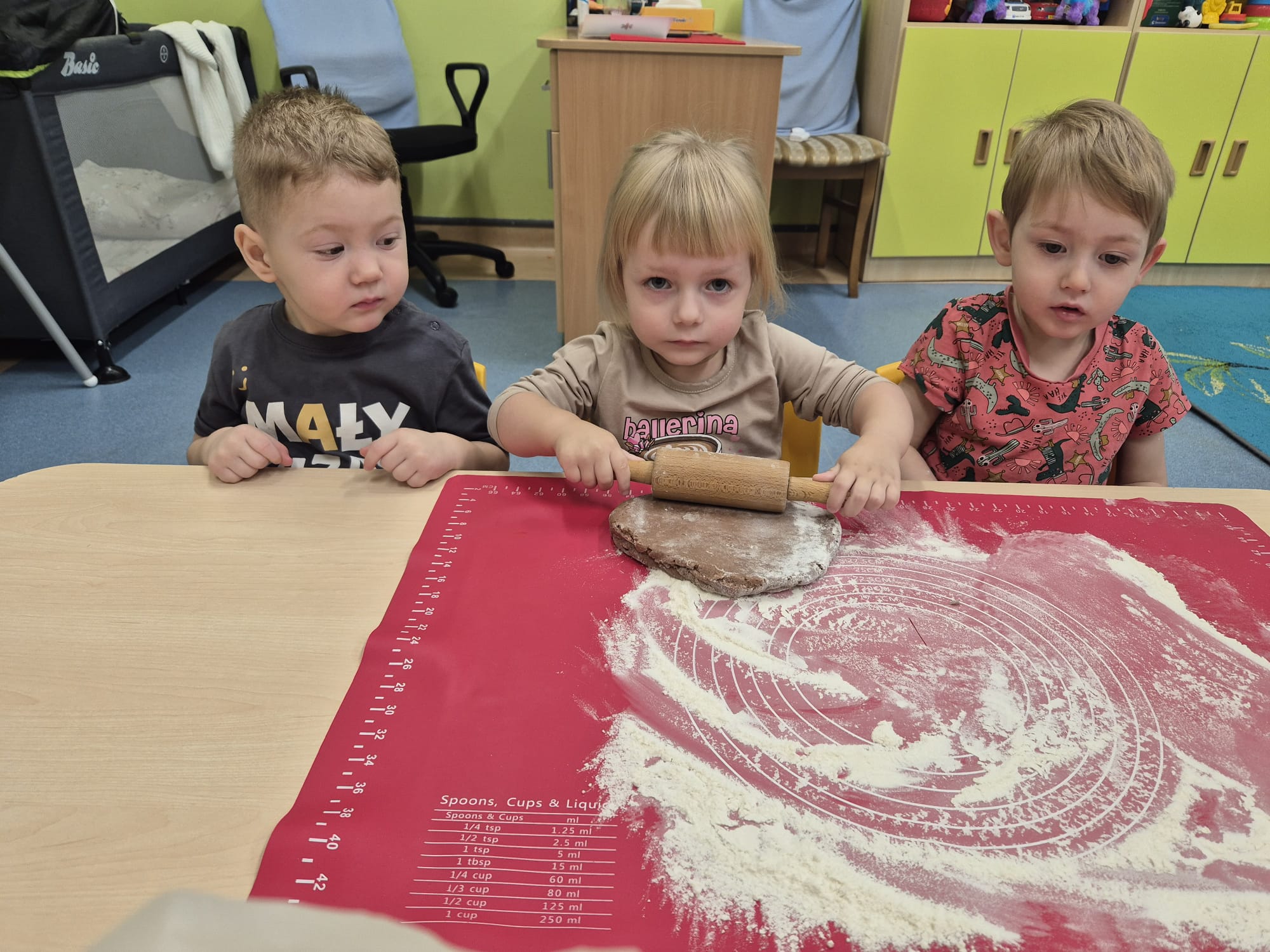 Dzisiejsze zajęcia bardzo podobały się dzieciom. Ugniatanie i wałkowanie aromatycznego ciasta cieszyło wszystkie dzieci.