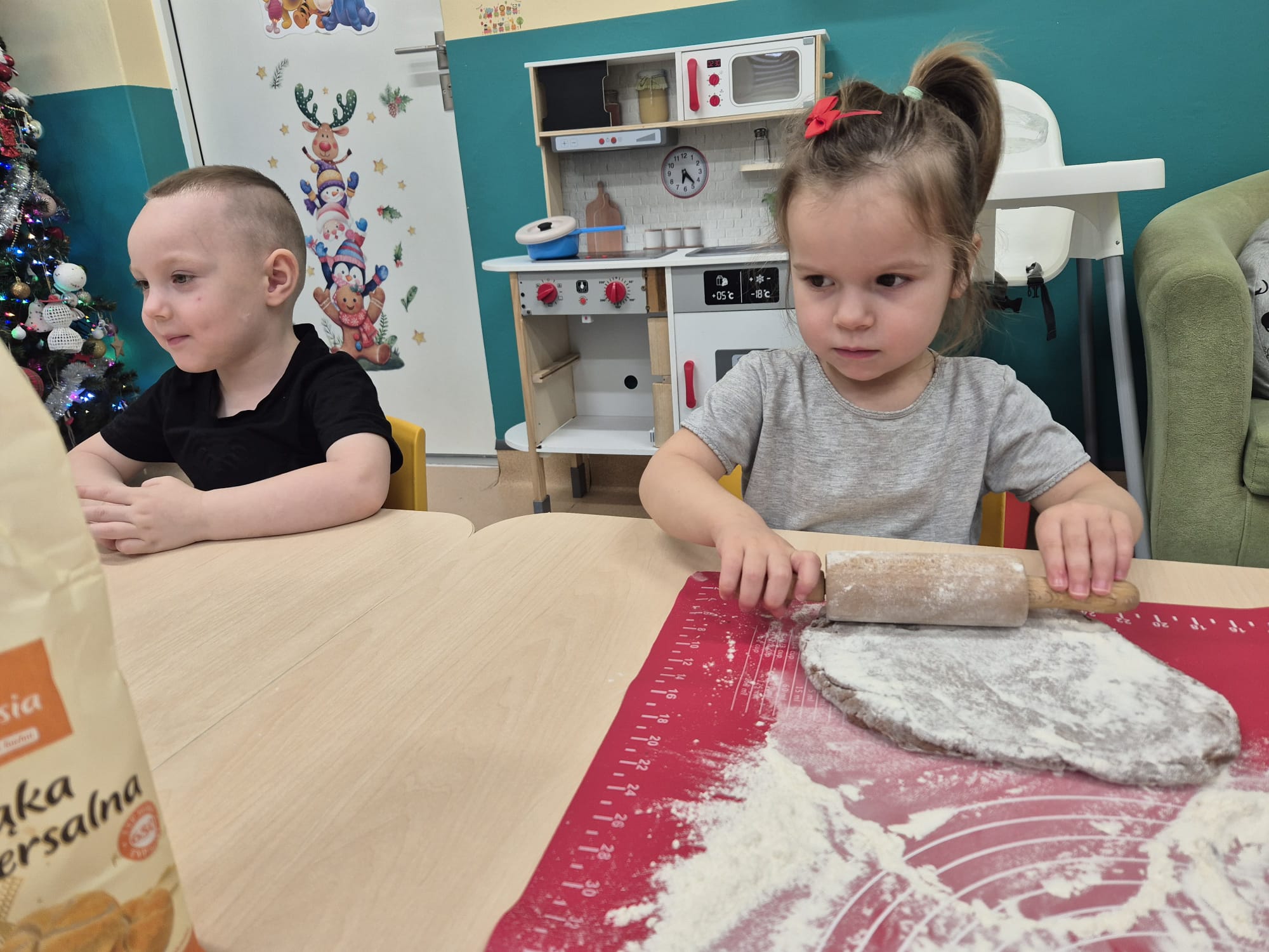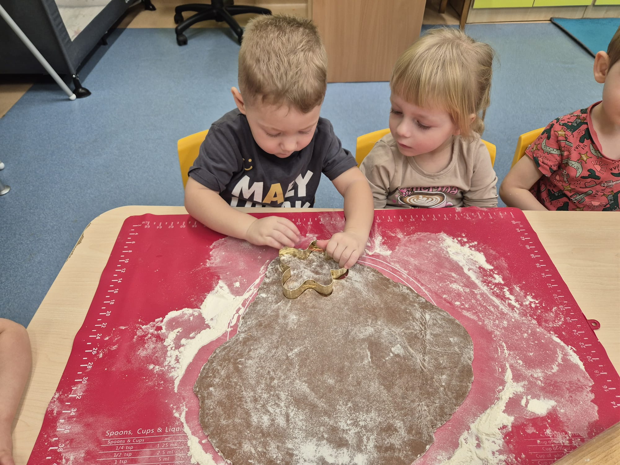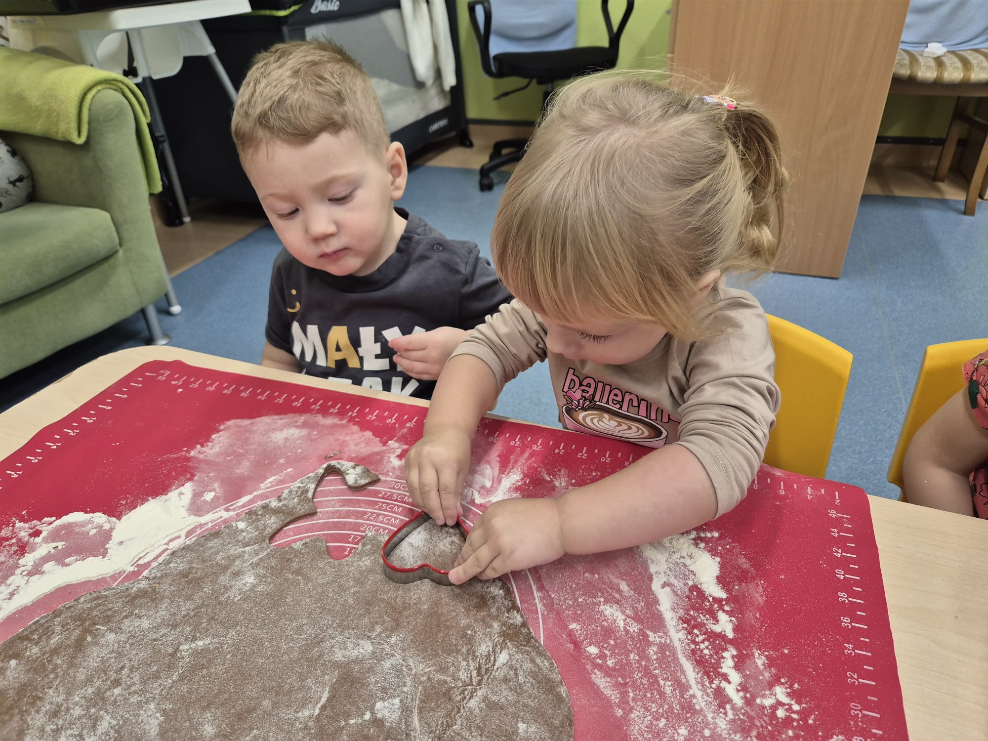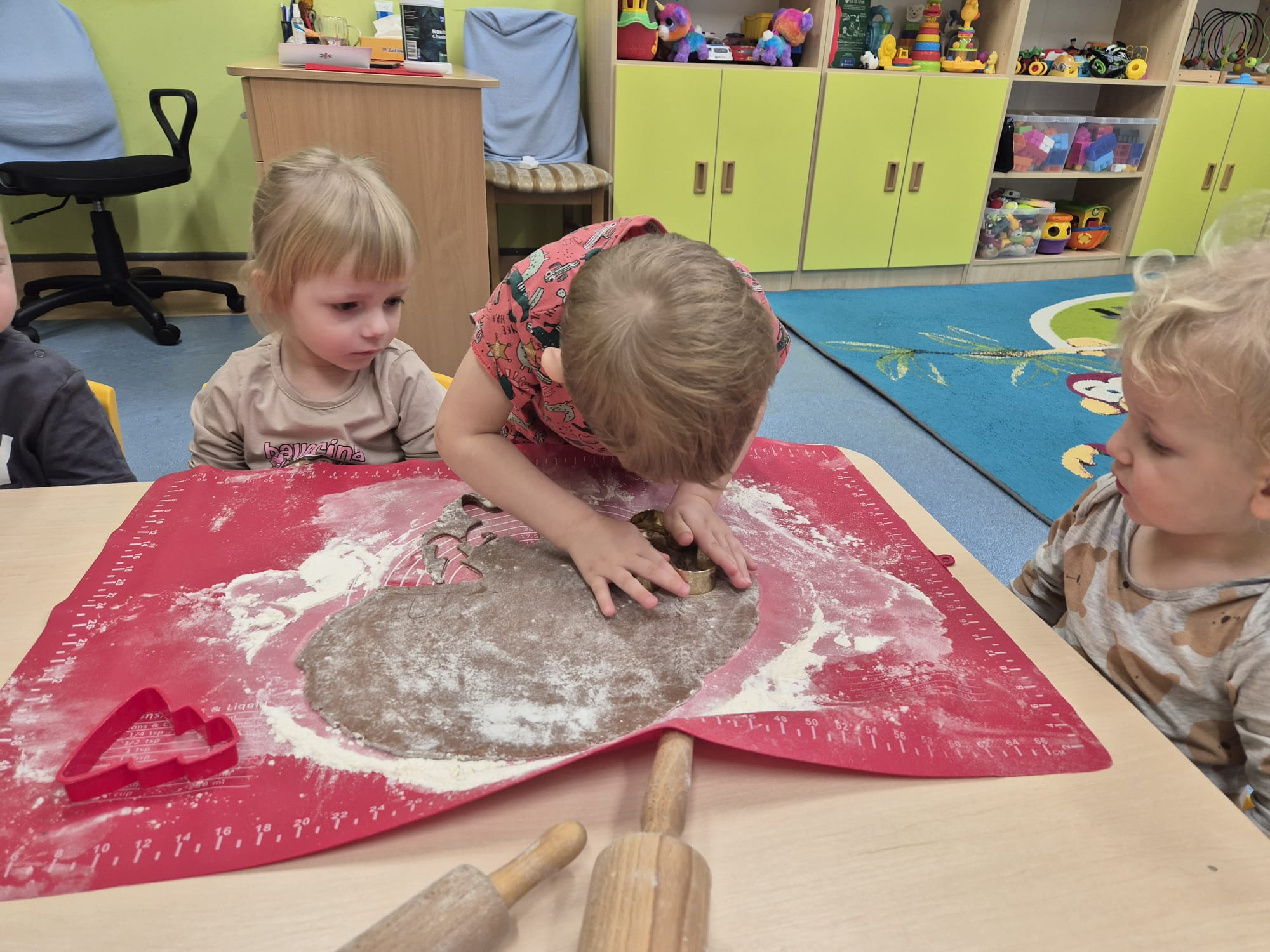 Mali cukiernicy sprawnie wykrawali pierniczki w świątecznych kształtach, które zostały upieczone przez ciocię , a ich zapach długo unosił się w powietrzu.