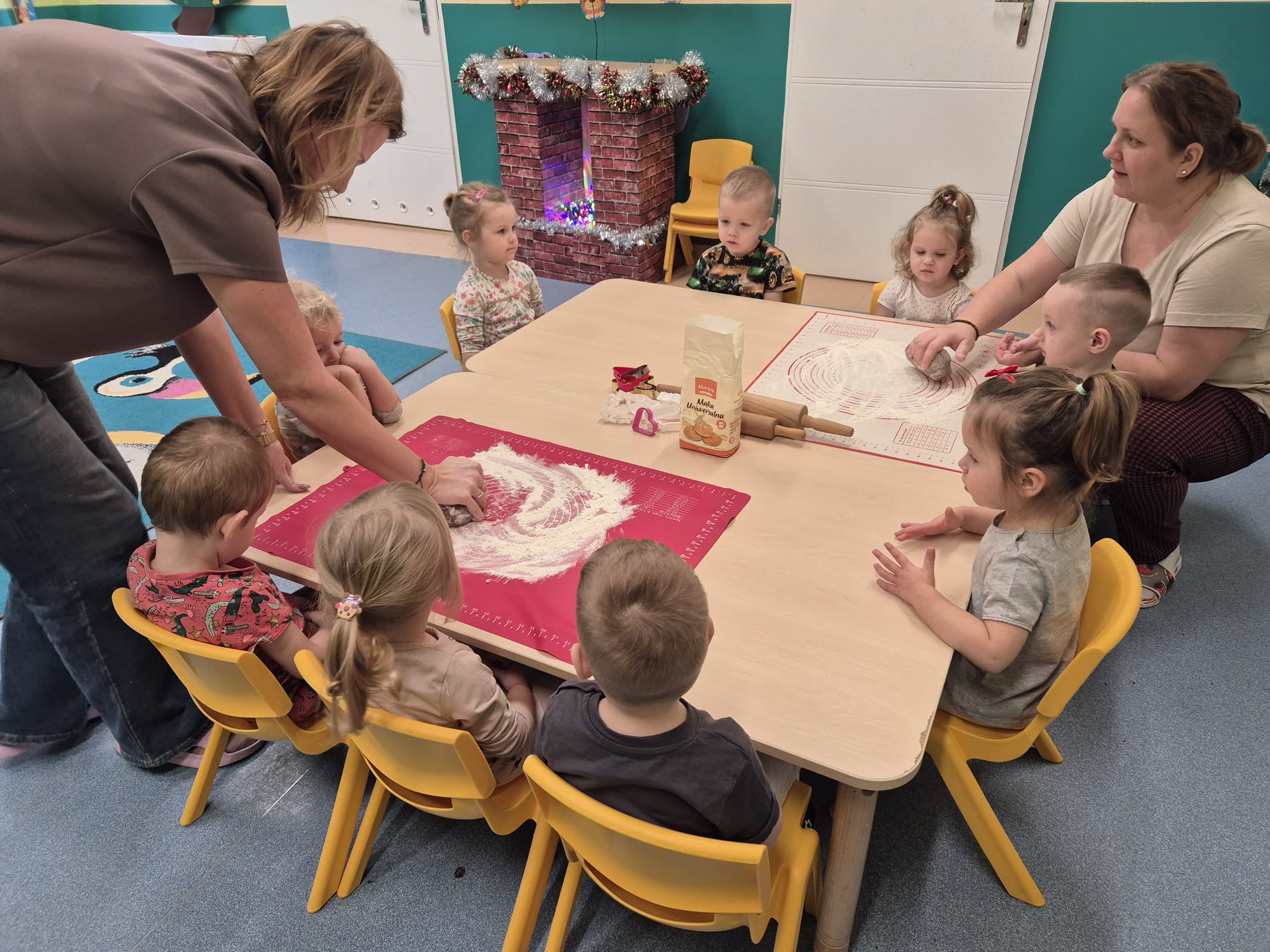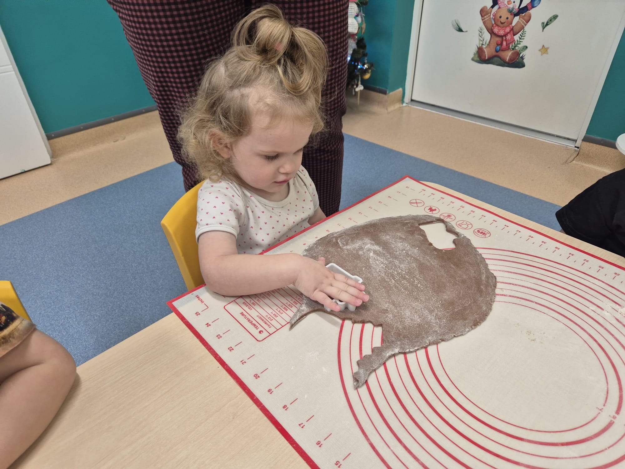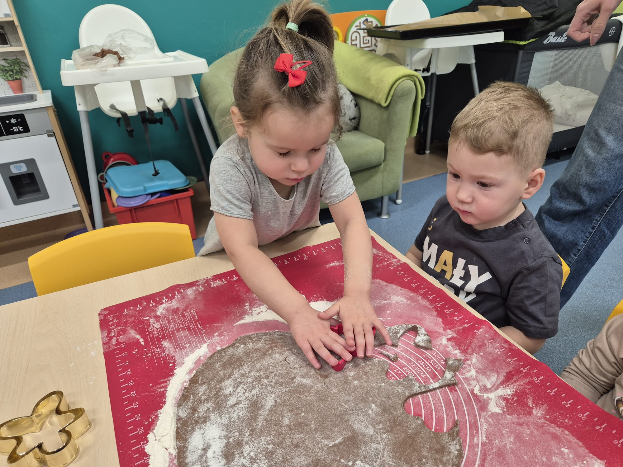 Mali cukiernicy sprawnie wykrawali pierniczki w świątecznych kształtach, które zostały upieczone przez ciocię , a ich zapach długo unosił się w powietrzu.