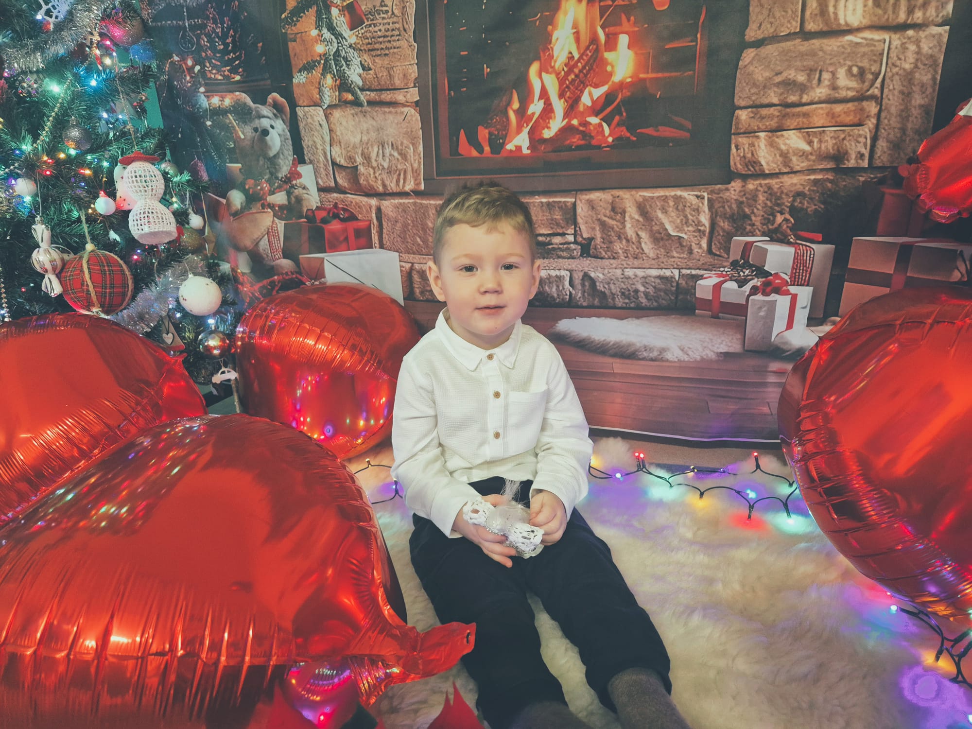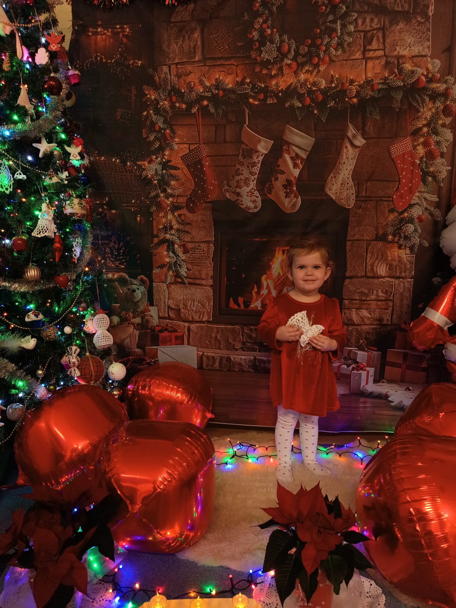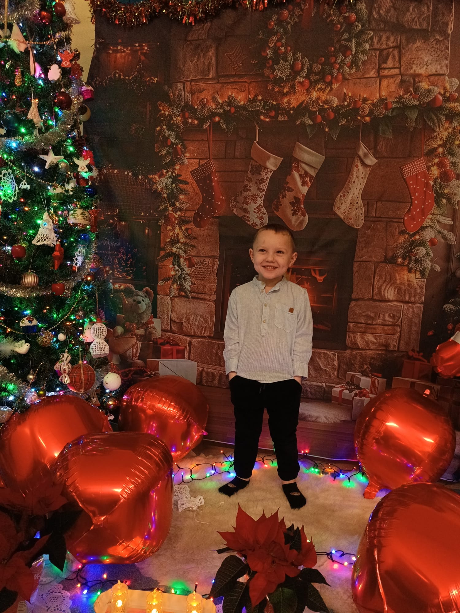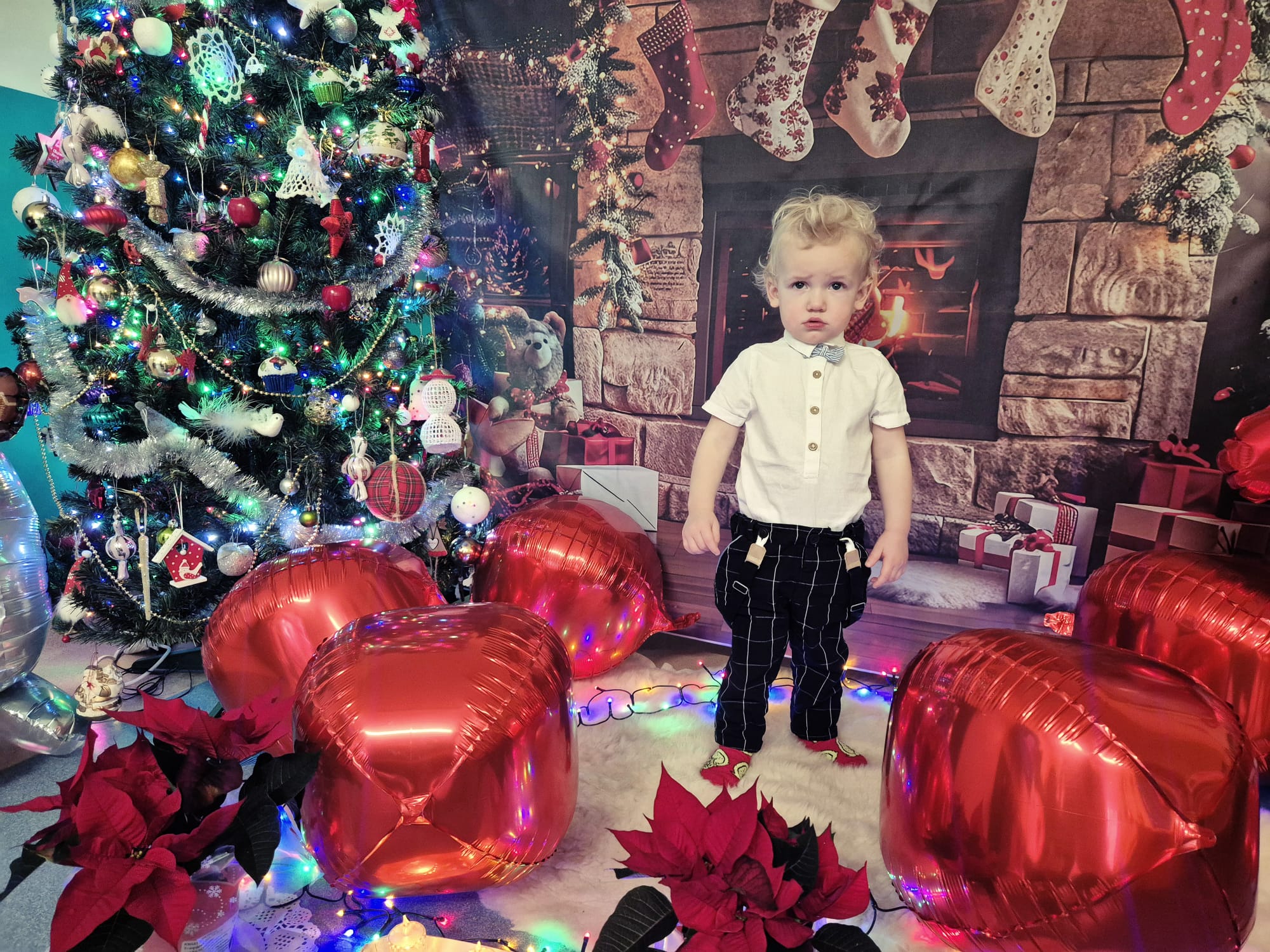 Dzieci pięknie ubrane  pozowały do zdjęć w świątecznym klimacie z kominkiem w tle, Świętym Mikołajem, bombkami itp.