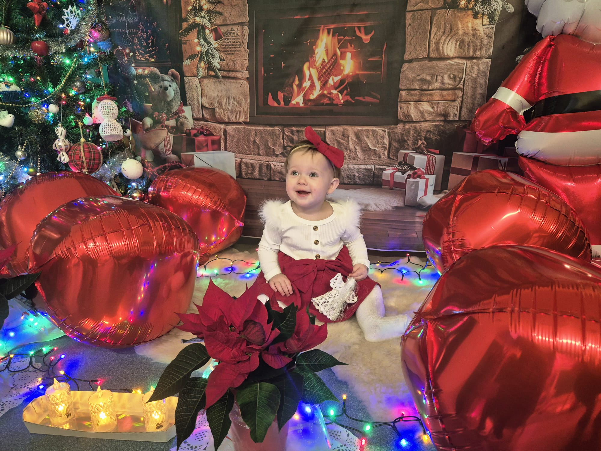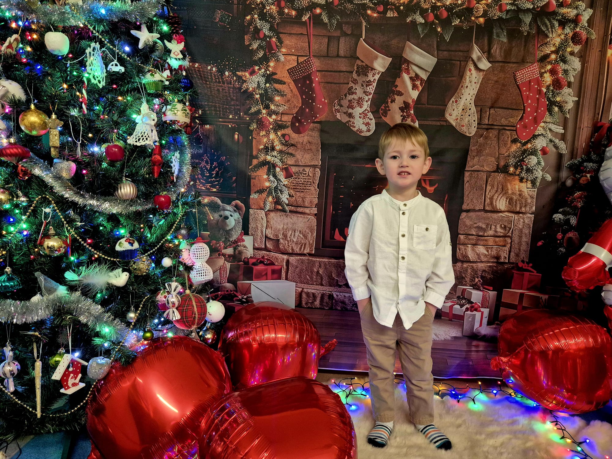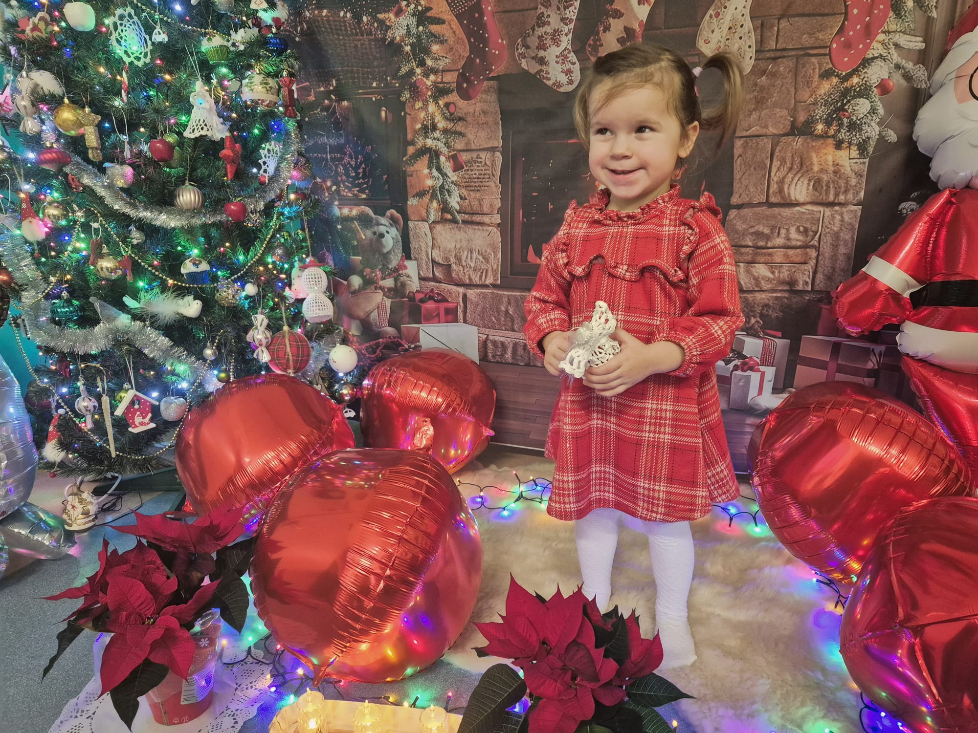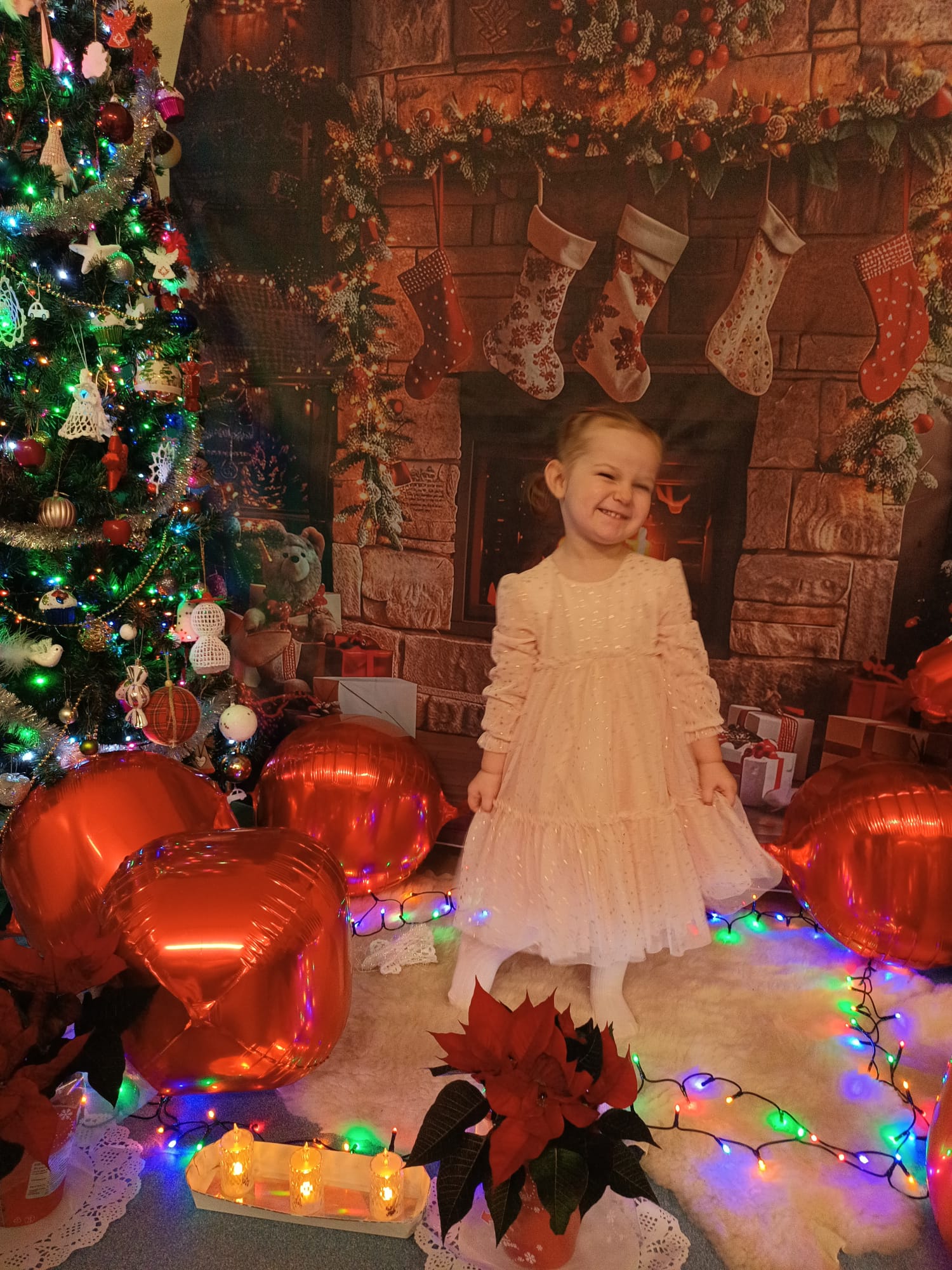 Dzieci pięknie ubrane  pozowały do zdjęć w świątecznym klimacie z kominkiem w tle, Świętym Mikołajem, bombkami itp.