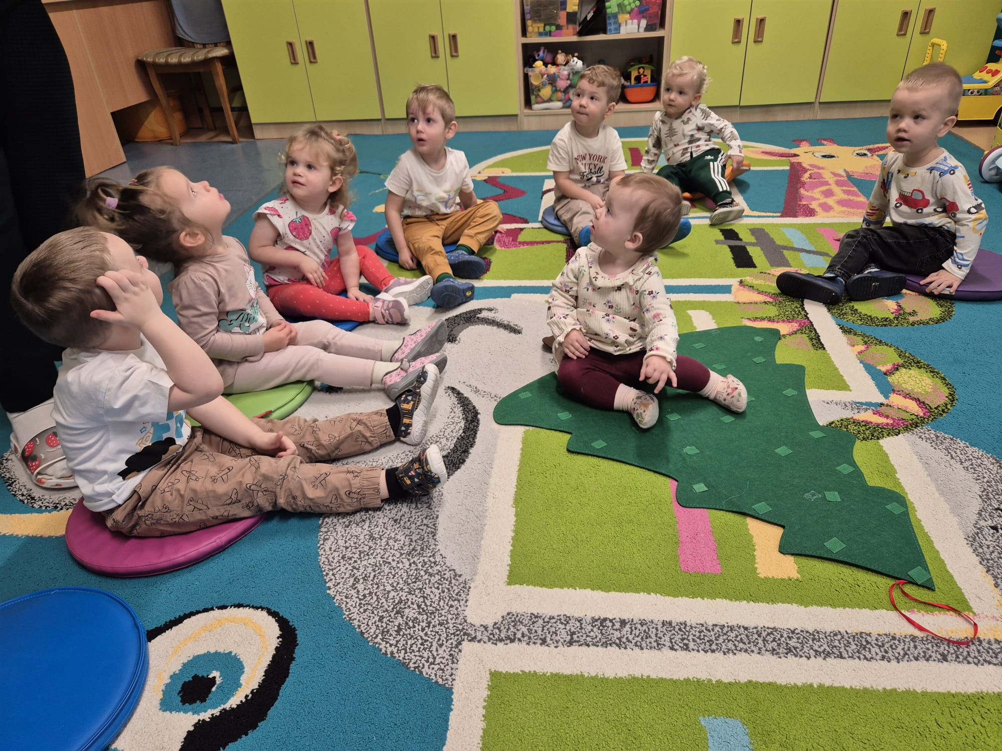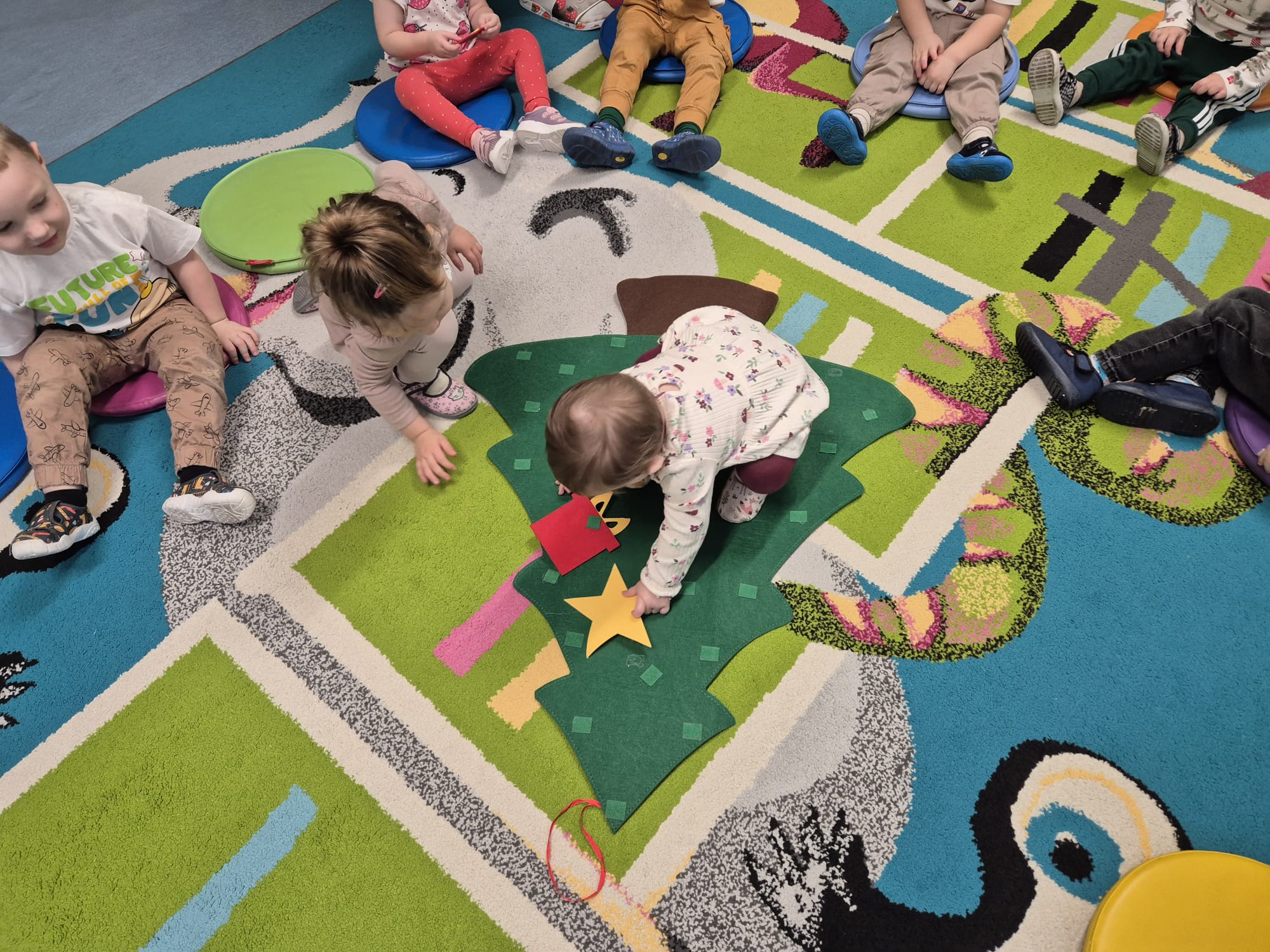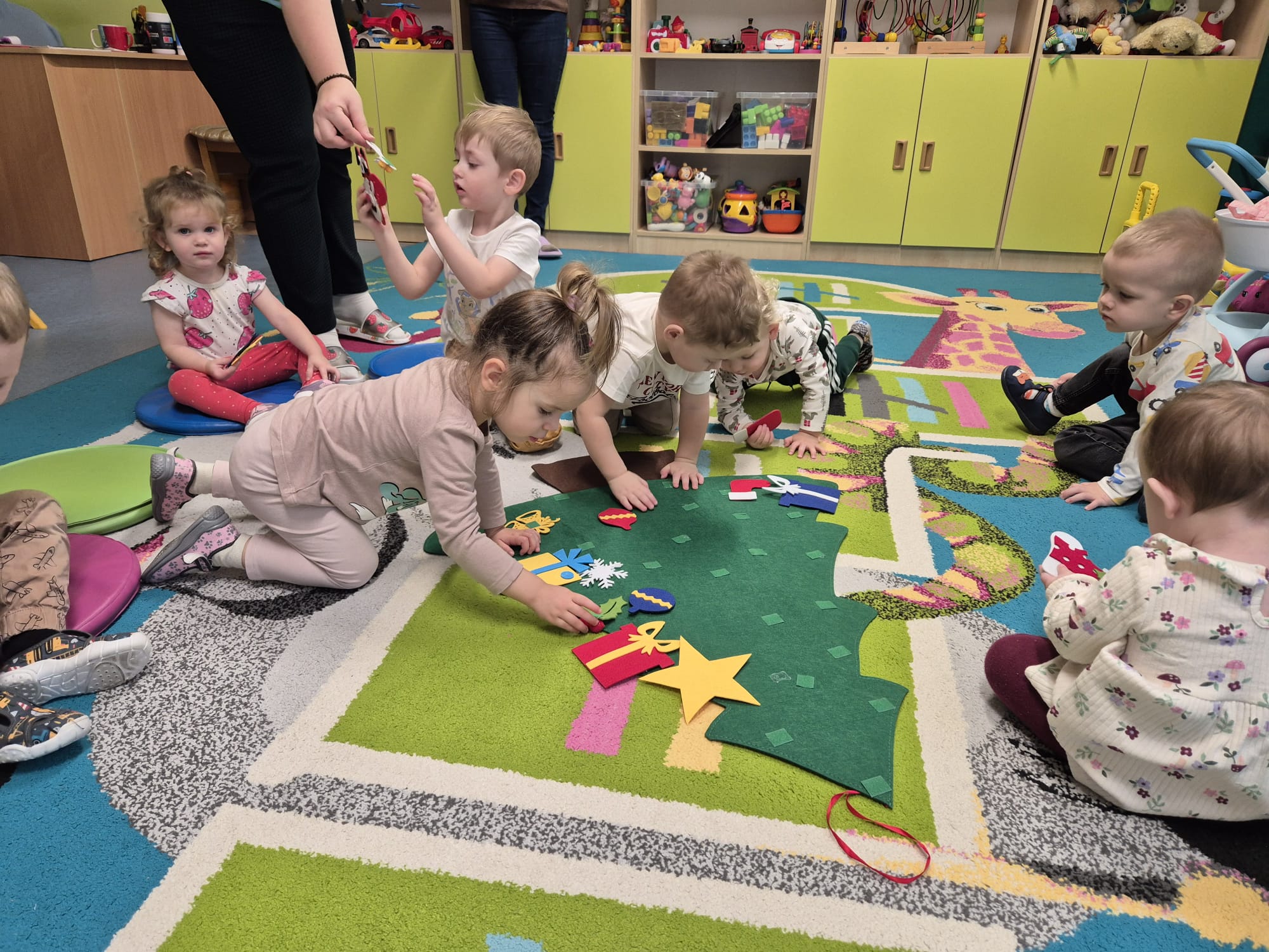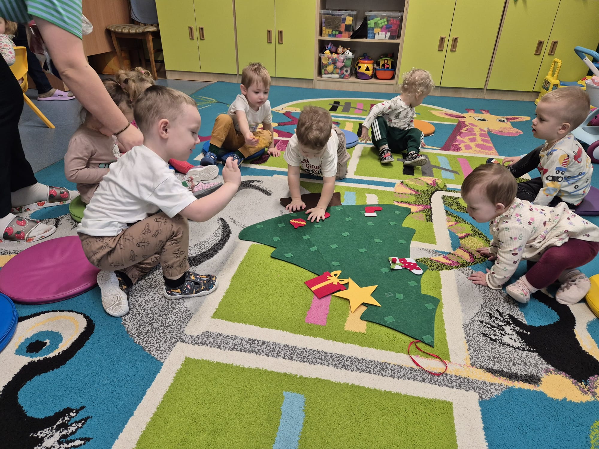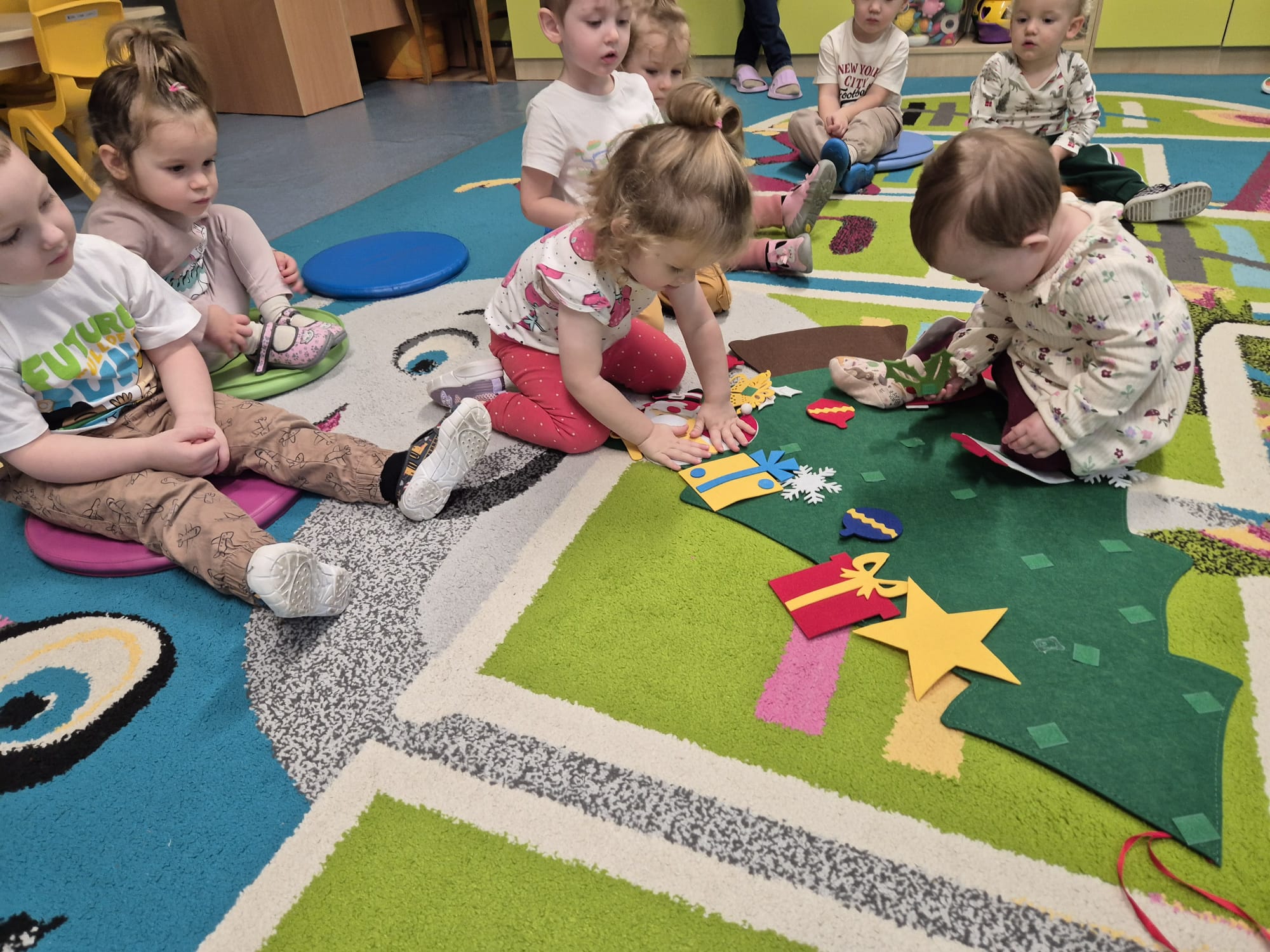 Dzieci przystroiły dziś filcową choinkę przyklejając jej różnokształtne ozdoby.